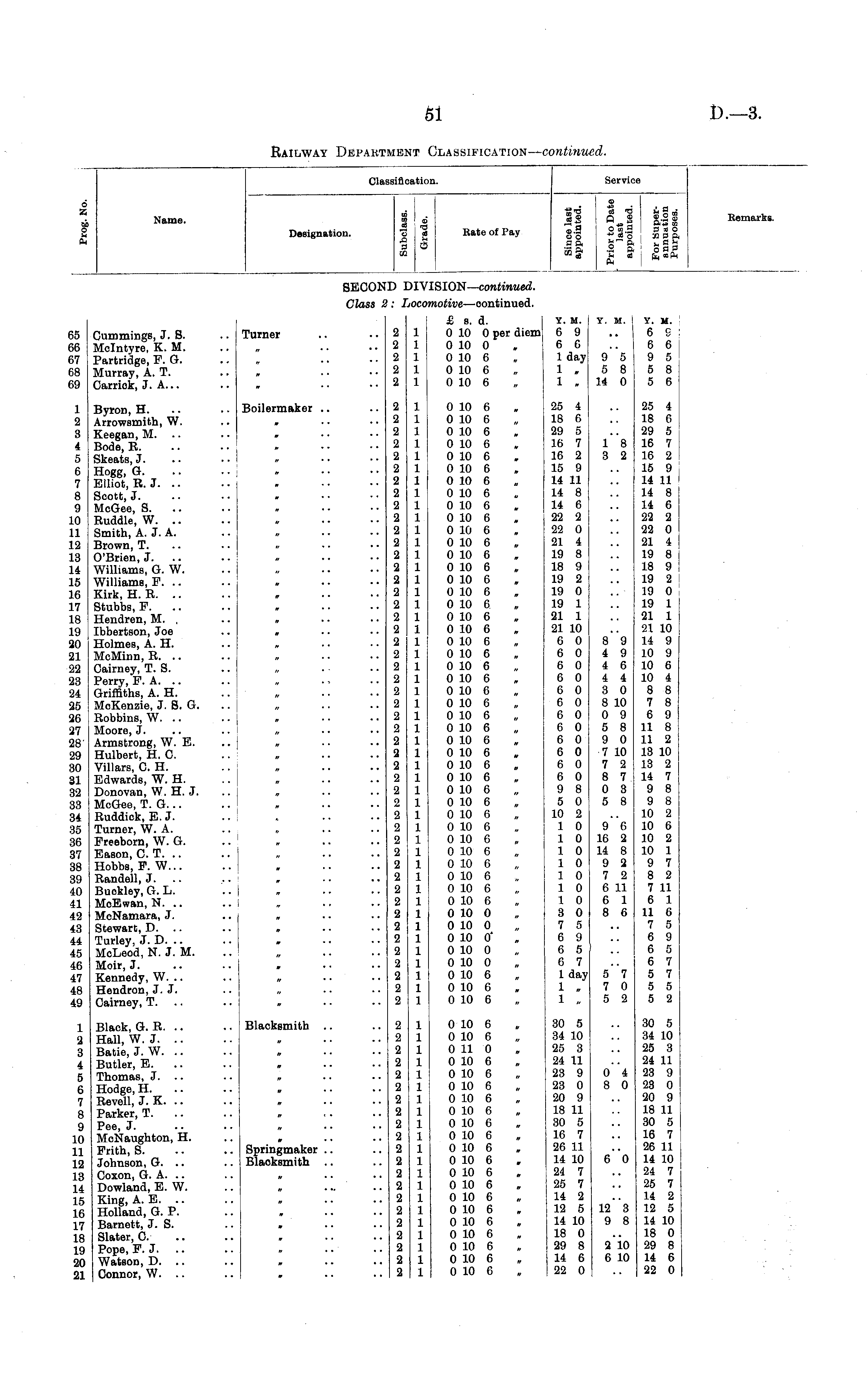Classiflcatii Service 6 i Name. Designation. to I 1 Rate of Pay II I J.J I 111 o'S ■" s 0 MSB, a a B B. 1,0" a a .2 a o a a Remarks. SECOH x> r iV SION— continued. Class : J: L tOC'.otive —oontinued. 15 Iβ 17 i8 19 Cummings, J. S. Mclntyre, K. M. Partridge, F. G. Murray, A. T. Carrick, J. A... Turner 2 '2 2 2 2 1 1 1 1 1 £ s. d. 0 10 0 per diem 0 10 0 0 10 6 0 10 6 0 10 6 Y. M. 6 9 6 G 1 day 1 , 1 y. m. 9 5 5 8 14 0 Y. M. 6 G 6 6 9 5 5 8 5 6 1 a 8 4 5 6 7 8 9 10 11 12 18 14 15 Iβ 17 18 19 20 21 22 38 24 25 26 37 28 29 80 gl 32 88 84 35 86 37 38 89 -10 11 19 43 44 45 4G 47 48 4!) Byron, H. Arrowsmith, W. Keegan, M. .. Bode, B. Skeats, J. Hogg, G. Elliot, B. J. .. Scott, J. McGee, S. Buddie, W. .. Smith, A. J. A. Brown, T. O'Brien, J. Williams, G. W. Williams, F. .. Kirk, H. B. .. Stubbs, F. Hendren, M. . Ibbertson, Joe Holmes, A. H. McMinn, B. .. Cairney, T. S. Perry, F. A. Griffiths, A. H. McKenzie, J. S. G. Bobbins, W. .. Moore, J. Armstrong, W. E. Hulbert, H. C. Villars, C. H. Edwards, W. H. Donovan, W. H. J. McGee, T. G... Buddick, E.J. Turner, W. A. Freeborn, W. G. Eason, C. T. Hobbs, F. W... Bandell, J. Buokley, G. L. MoEwan, N. .. McNamara, J. Stewart, D. .. Turley, J. D. McLeod, N. J. M. Moir, J. Kennedy, W. .. Hendron, J. J. Cairney, T. .. Boilermaker .. # ■ • it • • m * • 2 2 '2 2 '2 2 2 2 2 2 2 '2 2 9 2 '2 2 2 2 2 2 2 2 2 2 2 2 2 2 2 2 2 2 2 2 '2 2 2 2 2 2 2 2 2 2 2 2 2 2 1 1 1 1 1 1 1 1 1 1 1 1 1 1 1 1 1 1 1 1 1 1 1 1 1 1 1 1 1 1 1 1 1 1 1 1 ] 1 1 1 1 1 1 1 1 1 1 1 1 0 10 6 0 10 6 0 10 6 0 10 6 0 10 6 0 10 6 0 10 6 0 10 6 0 10 6 0 10 6 0 10 6 0 10 6 0 10 6 0 10 6 0 10 6 0 10 6 0 10 6 0 10 6 0 10 6 0 10 6 0 10 6 0 10 6 0 10 6 0 10 6 0 10 6 0 10 6 0 10 6 0 10 6 0 10 6 0 10 6 0 10 6 0 10 6 0 10 6 0 10 6 0 10 6 0 10 6 0 10 6 0 10 6 0 10 6 0 10 6 0 10 6 0 10 0 0 10 0 0 10 0 0 10 0 0 10 0 0 10 6 0 10 6 0 10 6 25 4 18 6 29 5 16 7 16 2 15 9 14 11 14 8 14 6 22 2 22 0 21 4 19 8 18 9 19 2 19 0 19 1 21 1 21 10 6 0 6 0 6 0 6 0 6 0 6 0 6 0 6 0 6 0 6 0 6 0 6 0 9 8 5 0 10 2 1 0 1 0 1 0 1 0 1 0 1 0 1 0 3 0 7 5 6 9 6 5 6 7 1 day 1 » 1 „ 1**8 3 2 8 9 4 9 4 6 4 4 3 0 8 10 0 9 5 8 9 0 7 10 7 2 8 7 0 3 5 8 25 4 18 6 29 5 16 7 16 2 15 9 14 11 14 8 14 6 22 2 22 0 21 4 19 8 18 9 19 2 19 0 19 1 21 1 21 10 14 9 10 9 10 6 10 4 8 8 7 8 6 9 11 8 11 2 13 10 13 2 14 7 9 8 9 8 10 2 10 6 10 2 10 1 9 7 8 2 7 11 6 1 11 6 7 5 6 9 6 5 6 7 5 7 5 5 5 2 n • * 9 6 16 2 14 8 9 2 7 2 6 11 6 1 8 6 «■ * « m • • a> ■ * 5 7 7 0 5 2 1 '2 3 4 5 6 7 8 9 10 11 12 18 14 15 16 17 18 19 20 21 Black, G. B. Hall, W. J. .. Batie, J. W. Butler, E. Thomas, J. .. Hodge, H. Bevell, J. K. Parker, T. Pee, J. McNaughton, H. Frith, S. Johnson, G. .. Coxon, G. A. Dowland, E. W. King, A. E. Holland, G. P. Barnett, J. S. Slater, 0. Pope, F. J. Wateon, D. .. Connor, W. .. Blacksmith .. ir • • Springmaker .. Blacksmith .. ■2 2 2 2 2 2 2 2 2 2 2 2 2 2 2 2 2 2 2 2 2 1 1 1 1 1 1 1 1 1 1 1 1 1 1 1 1 1 1 1 1 1 0 10 6 0 10 6 0 11 0 0 10 6 0 10 6 0 10 6 0 10 6 0 10 6 0 10 6 0 10 6 0 10 6 0 10 6 0 10 6 0 10 6 0 10 6 0 10 6 0 10 6 0 10 6 0 10 6 0 10 6 0 10 6 30 5 34 10 25 3 24 11 23 9 23 0 20 9 18 11 30 5 16 7 26 11 14 10 24 7 25 7 14 2 12 5 14 10 18 0 29 8 14 6 22 0 0 4 8 0 30 5 34 10 25 3 24 11 23 9 23 0 20 9 18 11 30 5 16 7 26 11 14 10 24 7 25 7 14 2 12 5 14 10 18 0 29 8 14 6 22 0 60 u ' •• 12 3 9 8 a'io 6 10