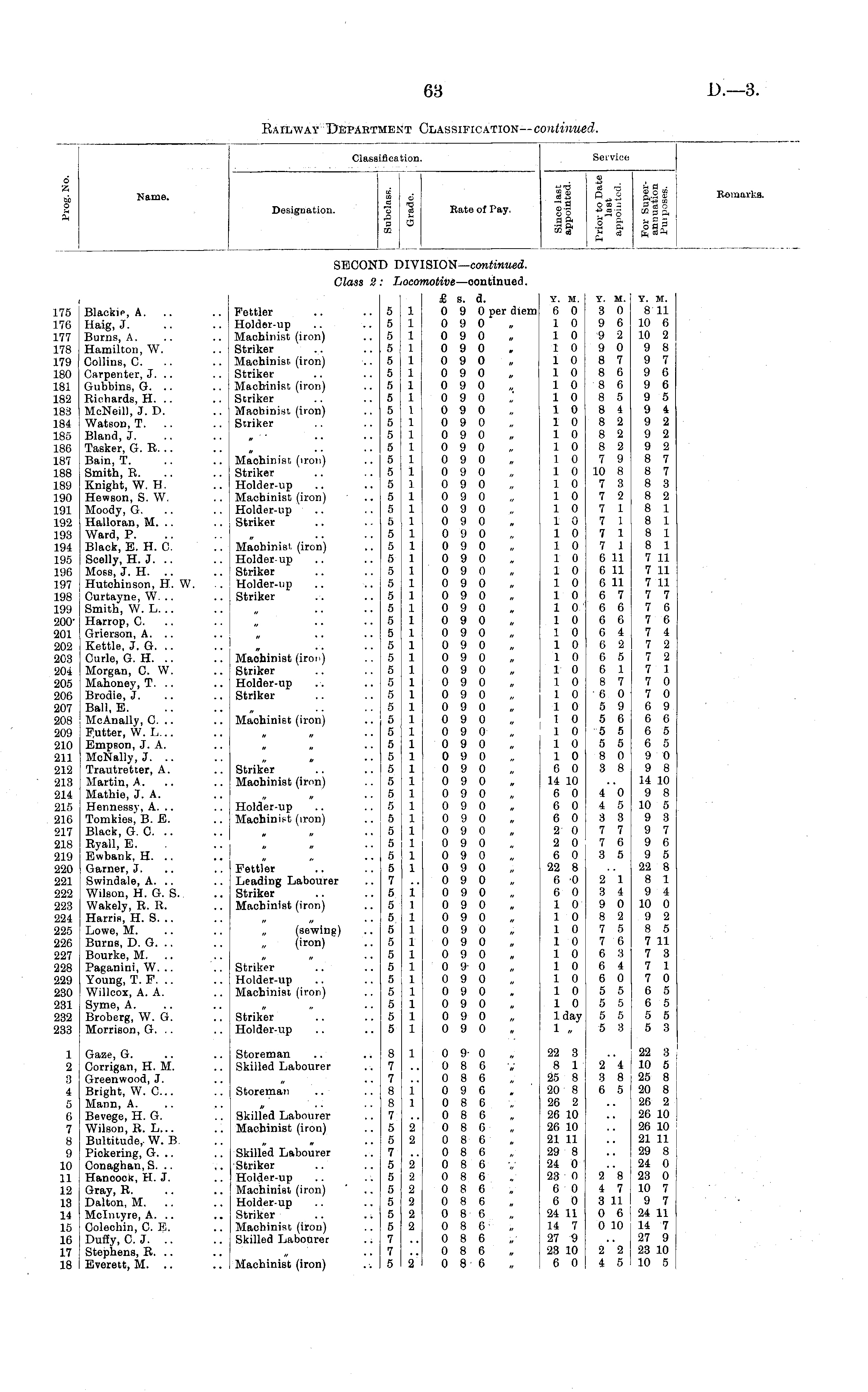 Clasi iifici tion, Service 6 •A i s> Name. Designation. p o & IS Rate of Pay. u & % Us if *1| si I !| -I I III Komarka. SHOOTS >IV SION— continued. Class 2 lOCO' notive —oontinued. 175 176 177 178 179 180 181 182 183 184 185 186 187 188 189 190 191 192 193 194 195 196 197 198 199 200201 202 203 20i 205 206 207 208 209 210 211 212 213 214 215 216 217 218 219 220 221 222 223 224 225 226 227 228 229 230 231 232 233 Blacks, A. .. Haig, J. Burns, A. Hamilton, W. Collins, C. Carpenter, J. .. Gubbins, G. .. Richards, H. .. McNeil), J. D. Watson, T. Bland, J. Tasker, G. E. .. Bain, T. Smith, R. Knight, W. H. Hewson, S. W. Moody, G. Halloran, M. .. Ward, P. Black, E. H. C. Scelly, H. J. Moss, J. H. Hutohinson, H. W. Curtayne, W. .. Smith, W. L. .. Harrop, C. Grierson, A. Kettle, J. G. Curie, G. H. .. Morgan, C. W. Mahoney, T. .. Brodie, J. Ball, E. McAnally, G. .. gutter, W. L... Empson, J. A. McNally, J. .. Trautretter, A. Martin, A.. Mathie, J. A. Hennessy, A. .. Tomkies, B. E. Black, G. C. .. Eyall, E. Ewbank, H. .. Garner, J. Swindale, A. .. Wilson, H. G. S. Wakely, R. R, Harris, H. S. .. Lowe, M. Burns, D. G. Bourke, M. Paganini, W. .. Young, T. P. Willcox, A. A. Syme, A. Broberg, W. G. Morrison, G. .. Pettier Holder-up Machinist (iron) Striker Machinist (iron) Striker Machinist (iron) Striker Machinist, (iron) Striker Machinist (iron) Striker Holder-up Machinist (iron) Holder-up Striker Machinist (iron) Holder-up Striker Holder-np Striker Machinist (iron) Striker Holder-up Striker 5 5 5 5 5 5 5 5 5 5 5 5 5 5 5 5 5 5 5 5 5 5 5 5 5 5 5 5 5 5 5 5 5 B 5 5 5 5 5 5 5 5 r, 5 5 5 7 5 5 5 5 5 5 5 5 5 5 5 5 1 1 1 1 1 1 1 1 1 1 1 1 1 1 3 1 1 1 1 i 1 1 1 1 1 1 1 1 1 1 1 1 1 1 1 1 1 1 1 1 1 1 1 1 1 1 £ s. d. 0 9 0 per diem 0 9 0 0 9 0 0 9 0 0 9 0 0 9 0 0 9 0 0 9 0 0 9 0 0 9 0 0 9 0 0 9 0 0 9 0 0 9 0 0 9 0 0 9 0 0 9 0 0 9 0 0 9 0 0 9 0 0 9 0 0 9 0 0 9 0 0 9 0 0 9 0 0 9 0 0 9 0 0 9 0 0 9 0 0 9 0 0 9 0 0 9 0 0 9 0 0 9 0 0 9 0 0 9 0 0 9 0 0 9 0 0 9 0 0 9 0 0 9 0 0 9 0 0 9 0 0 9 0 0 9 0 0 9 0 0 9 0 0 9 0 0 9 0 0 9 0 0 9 0 0 9 0 0 9 0 0 9 0 0 9 0 0 9 0 0 9 0 0 9 0 0 9 0 Y. M. 6 0 1 0 1 0 1 0 1 0 1 0 1 0 1 0 1 0 1 0 1 0 1 0 1 0 1 0 1 0 1 0 1 0 1 0 1 0 1 0 1 0 1 0 1 0 1 0 1 0 1 0 1 0 1 0 1 0 1 0 1 0 1 0 1 0 1 0 1 0 1 0 1 0 6 0 14 10 6 0 6 0 6 0 2 0 2 0 6 0 22 8 6 0 6 0 1 0 1 0 1 0 1 0 1 0 1 0 1 0 1 0 1 0 1 day 1 Y. M. 3 0 9 6 9 2 9 0 8 7 8 6 8 6 8 5 8 4 8 2 8 2 8 2 7 9 10 8 7 3 7 2 7 1 7 1 7 1 7 1 6 11 6 11 6 11 6 7 6 6 6 6 6 4 6 2 6 5 6 1 8 7 6 0 5 9 5 6 5 5 5 5 8 0 3 8 y. m. 8 11 10 6 10 2 9 8 9 7 9 6 9 6 9 5 9 4 9 2 9 2 9 2 8 7 8 7 8 3 8 2 8 1 8 1 8 1 8 1 7 11 7 11 7 11 7 7 7 6 7 6 7 4 7 2 7 2 7 1 7 0 7 0 6 9 6 6 6 5 6 5 9 0 9 8 14 10 9 8 10 5 9 3 9 7 9 6 9 5 22 8 8 1 9 4 10 0 9 2 8 5 7 11 7 3 7 1 7 0 6 5 6 5 5 5 5 3 Machinist (iron) Striker Machinist (iron) Holder-up Machinist (iron) 4 0 4 5 3 3 7 7 7 6 3 5 Fettler Leading Labourer Striker Machinist (iron) 1 1 1 1 1 1 1 1 1 1 1 1 2 1 3 4 9 0 8 2 7 5 7 6 6 3 6 4 6 0 5 5 5 5 5 5 5 3 „ (sewing) „ (iron) Striker Holder-up Machinist (iron) Striker Holder-up 1 2 3 4 5 6 7 8 9 10 11 12 13 14 15 16 17 18 Gaze, G. Corrigan, H. M. Greenwood, J. Bright, W. C... Mann, A. Bevege, H. G. Wilson, R. L... Bultitude,-W. B. Pickering, G. .. Conaghan, S. .. Hancock, H. J. Gray, R. Dalton, M. Mclniyre, A. .. Colechin, C. E. Duffy, C. J. Stephens, R. .. Everett, M. .. Storeman Skilled Labourer Storeman Skilled Labourer Machinist (iron) Skilled Labourer Striker Holder-up Machinist (iron) Holder-up Striker Machinist (iron) Skilled Labourer 8 7 7 8 8 7 f> 5 7 5 5 5 5 5 5 7 7 r> 1 1 1 2' 2 2 2 2 2 '2 2 0 9 0 0 8 G 0 8 6 0 9 6 0 8 6 0 8 6 0 8 6 0 8 6 0 8 6 0 8 6 0 8 6 0 8 6 0 8 6 0 8 6 0 8 6 0 8 6 0 8 6 0 8 6 22 3 8 1 25 8 20 8 26 2 26 10 26 10 21 11 29 8 24 0 23 0 6 0 6 0 24 11 14 7 27 9 23 10 6 0 2 4 3 8 6 5 22 3 10 5 25 8 20 8 26 2 26 10 26 10 21 11 29 8 24 0 23 0 10 7 9 7 24 11 14 7 27 9 23 10 10 5 2 8 4 7 3 11 0 6 0 10 Machinist (iron) % 2 2 4 5