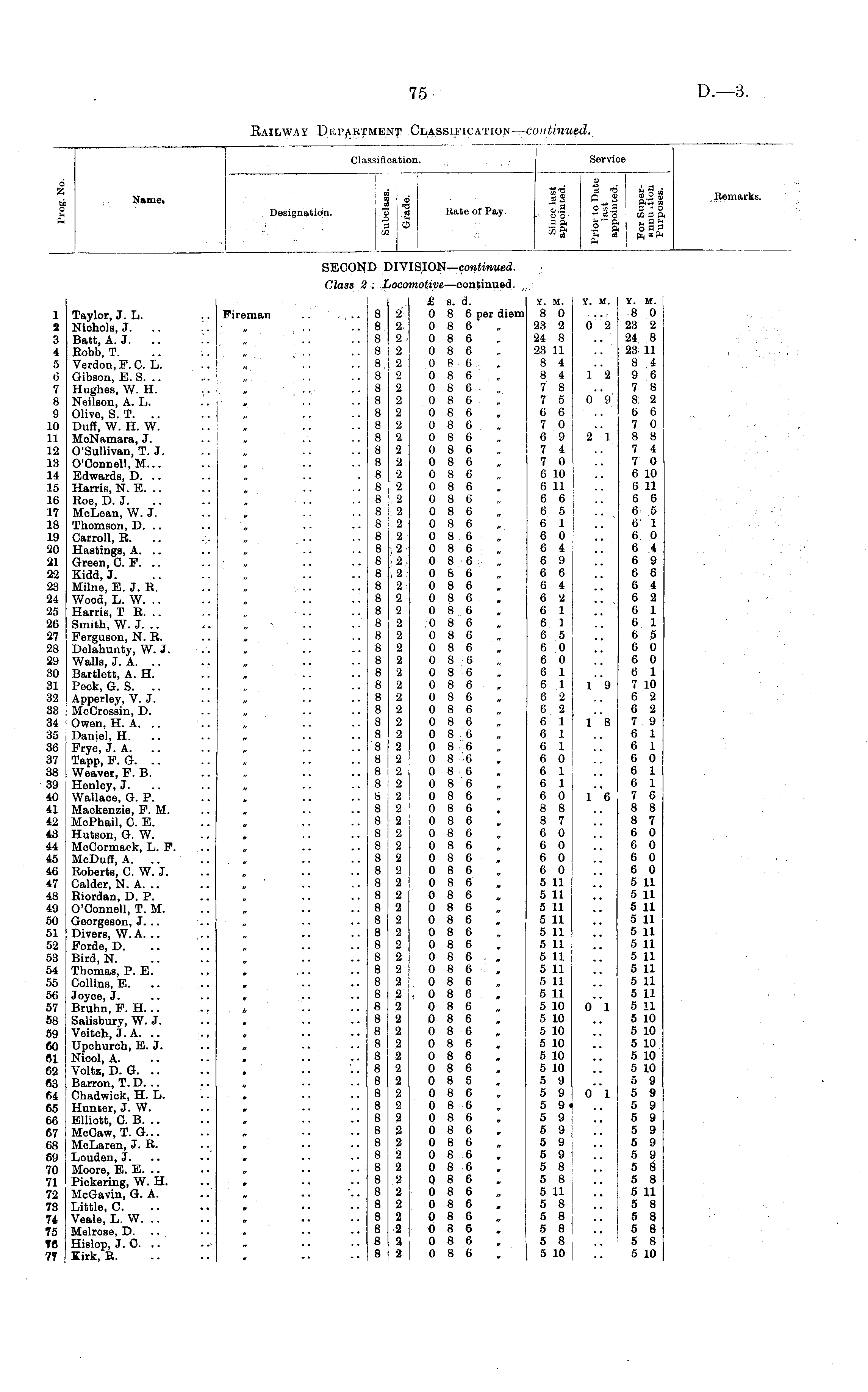 Classifloati( in. Service > 6 X o Name* Designation. 13 Bate of Pay 11 zs •j o a a x OS Li Mi O J! = P - O Remarks. secon: )iv: ESION— continued. Class a ,oc(r, w notive —continued. £ s. a. 0 8 6 per diem 0 8 6 0 8 6 0 8 6 0 8 6 0 8 6, 0 8 6 „ 0 8 6 0 8 6 0 8 6 0 8 6 0 8 6 0 8 6 0 8 6 0 8 6 0 8 6 0 8 6 0 8 6 0 8 6 0 8 6 0 8 6 0 8 6 , 0 8 6 0 8 6 0 8 6 0 8 6 0 8 6 0 8 6 0 8 6 0 8 6 0 8 6 0 8 6 0 8 6 0 8 6 0 8 6 0 8 6 0 8 6 0 8 6 0 8 6 0 8 6 0 8 6 0 8 6 0 8 6 0 8 6 0 8 6 0 8 6 0 8 6 0 8 6 0 8 6 0 8 6 0 8 6 0 8 6 0 8 6 0 8 6 0 8 6 0 8 6 0 8 6 0 8 6 0 8 6 0 8 6 0 8 6 0 8 6 0 8 8 0 8 6 0 8 6 0 8 6 0 8 6 0 8 6 0 8 6 0 8 6 0 8 6 0 8 6 0 8 6 0 8 6 0 8 6 0 8 6 0 8 6 1 I 4 5 6 7 8 8 10 n 12 13 14 15 Lβ 17 18 19 20 21 22 23 •24 ■25 •2ti •21 28 39 30 81 32 88 34 35 36 37 38 89 40 41 42 43 44 45 46 47 48 49 50 51 52 53 54 55 66 57 58 59 Taylor, J. L. Nichols, J. Batt, A. J. Bobb, T. Verdon, P. C. L. Gibson, E. S. Hughes, W. H. Neilson, A. L. Olive, S. T. Duff, W. H. W. McNamara, J. O'Sullivan, T. J. O'Connell, M... Edwards, D. .. Harris, N. E. .. Roe, D. J. McLean, W. J. Thomson, D. .. Carroll, E. Hastings, A. .. Green, C. F. .. Kidd, J. Milne, E. J. R. Wood, L. W. .. Harris, T R. .. Smith, W. J. .. Ferguson, N. R. Delahunty, W. J. Walls, J. A. Bartlett, A. H. Peck, G. S. Apperley, V. J. McCrossin, D. Owen, H. A. Daniel, H. Frye, J. A. Tapp, F. G. Weaver, F. B. Henley, J. Wallace, G. P. Mackenzie, F. M. McPhail, C. E. Hutson, G. W. McCormack, L. F. McDuff, A. .. Roberts, C. W. J. Calder, N. A. .. Riordan, D. P. O'Connell, T. M. Georgeson, J. .. Divers, W. A. .. Forde, D. Bird, N. Thomas, P. E. Collins, E. Joyce, J. Bruhn, F. H... Salisbury, W. J. Veitch, J. A. Upchurch, E. J. Nicol, A. Voltz, D. G. Barron, T. D. .. Chadwick, H. L. Hunter, J. W. Elliott, C. B. McCaw, T. G... McLaren, J. R. Louden, J. Moore, E. E. Pickering, W. H. McGavin, G. A. Little, O. Veale, L. W. Melrose, D. Hislop, J. C. Kirk, E. Fireman 8 8 8 8 8 8 8 8 8 8 8 8 8 8 8 8 8 8 8 8 8 8 8 8 8 8 8 8 8 8 8 8 8 8 8 8 8 8 8 6 8 8 8 8 8 8 H 8 8 8 8 8 8 8 8 8 8 8 8 S 8 8 8 8 8 8 8 8 8 8 8 8 8 3 8 8 8 2 2 2 2 2 2 2 2 2 2 2 2 2 2 2 2 2 2 2 ■ 2 . 2 .2 2 2 2 2 2 2 2 2 2 2 2 2 2 2 2 2 2 2 2 2 2 2 2 2 2 2 2 2 2 2 2 2 2 2 2 2 2 2 2 2 2 2 2 2 2 2 2 2 2 2 2 2 2 2 Y. M. 8 0 23 2 24 8 23 11 8 4 8 4 7 8 7 5 6 6 7 0 6 9 7 4 7 0 6 10 6 11 6 6 6 5 6 1 6 0 6 4 6 9 6 6 6 4 6 2 6 1 6 1 6 5 6 0 6 0 6 1 6 1 6 2 6 2 6 1 6 1 6 1 6 0 6 1 6 1 6 0 8 8 8 7 6 0 6 0 6 0 6 0 5 11 5 11 5 11 5 11 5 11 5 11 5 11 5 11 5 11 5 11 5 10 5 10 5 10 5 10 5 10 5 10 5 9 5 9 5 9 5 9 5 9 5 9 5 9 5 8 5 8 5 11 5 8 5 8 5 8 5 8 5 10 y. m. o"2 1 2 0 9 ! 2 i i •• t i • • 19 - . | ! 1 8 y. m. 8 0 23 2 24 8 23 11 8 4 9 6 7 8 8 2 6 6 7 0 8 8 7 4 7 0 6 10 6 11 6 6 6 5 6 1 6 0 6 4 6 9 6 6 6 4 6 2 6 1 6 1 6 5 6 0 6 0 6 1 7 10 6 2 6 2 7 9 6 1 6 1 6 0 6 1 6 1 7 6 8 8 8 7 6 0 6 0 6 0 6 0 5 11 5 11 5 11 5 11 5 11 5 11 5 11 5 11 5 11 5 11 5 11 5 10 5 10 5 10 5 10 5 10 5 9 5 9 5 9 5 9 5 9 ; 5 9 5 9 5 8 5 8 5 11 5 8 S 8 5 8 5 8 5 10 16 o"i * a S3 18 -.4 55 Sβ 57 18 59 ro n ra !S : i r 5 '8 f 7 m n * o"i