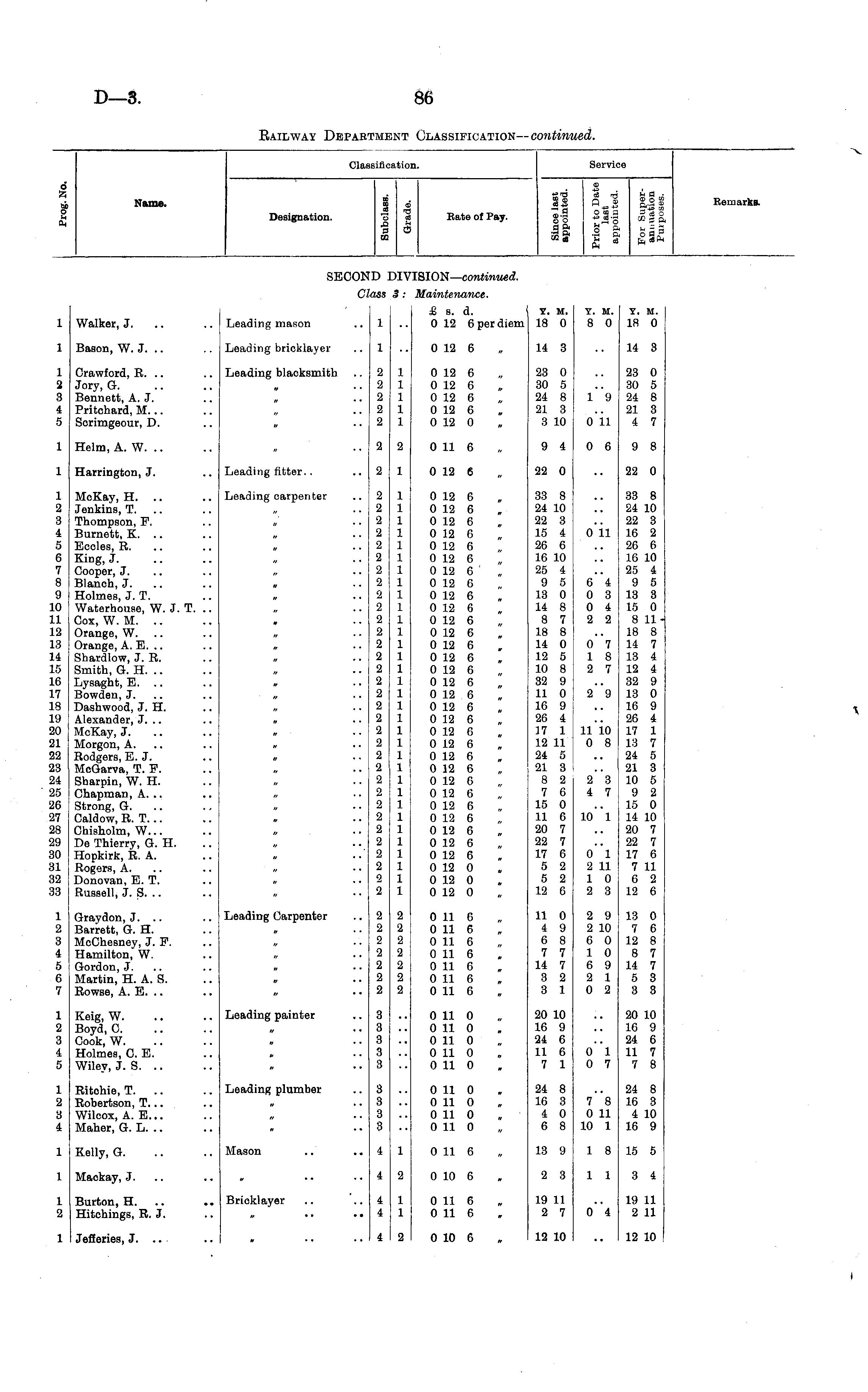 Clasi jification. Service 6 i a< Name. Designation. i 6 ■§ S S A {H Ml Remarks. Bate of Pay. SECOK div: .SION—continued. c< 3: Maintenance. 'ass i Walker, J. Leading mason 1 £ s. d. 0 12 6 per diem Y. M. 18 0 Y. M. 8 0 Y. M. If! 0 i Bason, W. J. .. Leading bricklayer 1 0 12 6 14 3 14 3 i 3 8 4 6 Crawford, B. .. Jory, G. Bennett, A. J. Pritohard, M... Sorimgeour, D. Leading blacksmith 2 2 2 2 2 1 1 1 1 1 0 12 6 0 12 6 0 12 6 0 12 6 0 12 0 23 0 30 5 24 8 21 3 3 10 1 9 23 0 30 5 24 8 21 3 4 7 Oil 1 Helm, A. W. .. 2 2 0 11 6 9 4 0 6 9 8 1 Harrington, J. Leading fitter.. 2 1 0 12 6 22 0 22 0 1 2 3 4 5 G 7 8 9 0 LI .2 13 A .5 .6 .7 .'.) !0 a !2 S3 U !S Sβ !7 !8 !9 10 !l 12 IS McKay, H. .. Jenkins, T. Thompson, F. Burnett, K. Eooles, R. King, J. Cooper, J. Blanch, J. Holmes, J. T. Waterhouse, W. J. T. Cox, W. M. .. Orange, W. .. Orange, A. E. .. Shardlow, J. R. Smith, G. H. .. Lysaght, E. .. Bowden, J. Dashwood, J. H. Alexander, J. .. McKay, J. Morgon, A. Rodgers, E.J. McGarva, T. F. Sharpin, W. H. Chapman, A. .. Strong, G. Caldow, R. T... Chisholm, W... De Thierry, G. H. Hopkirk, R. A. Rogers, A. Donovan, E. T. Russell, J. S. .. Leading carpenter w • • 2 2 2 2 2 2 2 2 2 2 2 2 2 2 2 2 2 2 2 2 2 2 2 2 2 2 2 2 2 2 2 2 2 1 1 1 1 1 1 1 1 1 1 1 1 1 1 1 1 1 1 I 1 J 1 1 1 1 1 1 1 1 1 1 1 1 0 12 6 0 12 6 0 12 6 0 12 6 0 12 6 0 12 6 0 12 6 0 12 6 0 12 6 0 12 6 0 12 6 0 12 6 0 12 6 0 12 6 0 12 6 0 12 6 0 12 6 0 12 6 0 12 6 0 12 6 0 12 6 0 12 6 0 12 6 0 12 6 0 12 6 0 12 6 0 12 6 0 12 6 0 12 6 0 12 6 0 12 0 0 12 0 0 12 0 33 8 24 10 22 3 15 4 26 6 16 10 25 4 9 5 13 0 14 8 8 7 18 8 14 0 12 5 10 8 32 9 11 0 16 9 26 4 17 1 12 11 24 5 21 3 8 2 7 6 15 0 11 6 20 7 22 7 17 6 5 2 5 2 12 6 oil 6 4 0 3 0 4 2 2 0 7 1 8 2 7 2"g 33 8 24 10 22 3 16 2 26 6 16 10 25 4 9 5 13 3 15 0 8 11 18 8 14 7 13 4 12 4 32 9 13 0 16 9 26 4 17 1 13 7 24 5 21 3 10 5 9 2 15 0 14 10 20 7 22 7 17 6 7 11 6 2 12 6 11 10 0 8 It - • 2"3 4 7 10 1 0 1 2 11 1 0 2 3 1 2 3 4 6 6 7 Gray don, J. .. Barrett, G. H. McChesney, J. F. Hamilton, W. Gordon, J. Martin, H. A. S. Rowse, A. E. .. Leading Carpenter 2 2 2 2 2 2 2 2 2 2 3 2 2 2 0 11 6 0 11 6 0 11 6 0 11 6 0 11 6 0 11 6 0 11 6 11 0 4 9 6 8 7 7 14 7 3 2 3 1 2 9 2 10 6 0 1 0 6 9 2 1 0 2 13 0 7 6 12 8 8 7 14 7 5 3 3 3 1 2 3 4 6 Keig, W. Boyd, C. Cook, W. Holmes, C. E. Wiley, J. S. .. Leading painter 3 3 3 3 3 0 11 0 0 11 0 0 11 0 0 11 0 0 11 0 20 10 16 9 24 6 11 6 7 1 0 1 0 7 20 10 16 9 24 6 11 7 7 8 1 2 3 4 Ritchie, T. Robertson, T... Wilcox, A. E... Maher, G. L. .. Leading plumber 8 3 3 3 0 11 0 0 11 0 0 11 0 0 11 0 24 8 16 3 4 0 6 8 7 8 0 11 10 1 24 8 16 3 4 10 16 9 1 Kelly, G. Mason 4 1 0 11 6 13 9 1 8 15 5 1 Mackay, J. 4 2 0 10 6 2 3 1 1 3 4 1 2 Burton, H. .. .. Hitchings, R. J. Bricklayer 4 4 1 1 0 11 6 0 11 6 19 11 2 7 0 4 19 11 2 11 1 JeSeries, J. .. 1 2 0 10 6 12 10 12 10