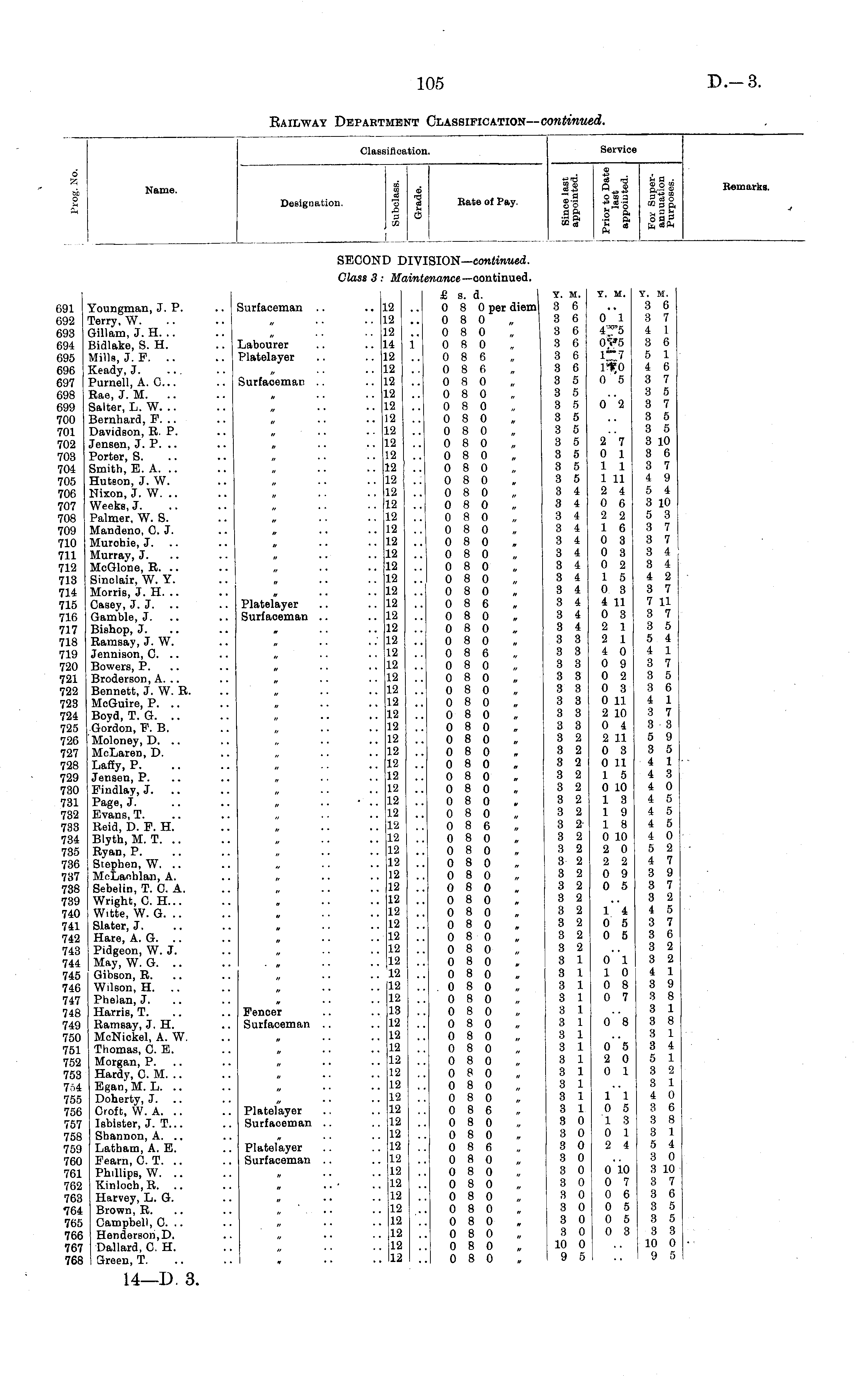 Clasi [ification. Service 6 Z i Name. Designation. I ■§ I a m Bate of Pay. A 1 11 fit Bern arks. ■/ secon: DIV >ION— continued. Class 3: r aim lance —continued. 691 692 693 694 695 696 697 698 699 700 701 702 703 704 705 706 707 708 709 710 711 712 713 714 715 716 717 718 719 720 721 722 723 724 725 726 727 728 729 730 731 732 733 734 735 736 737 738 739 740 741 742 743 744 745 746 747 748 749 750 751 752 753 754 755 756 757 758 759 760 761 762 763 764 765 766 767 768 Youngman, J. P. Terry, W. Gillam, J. H. .. Bidlake, S. H. Mills, J. F. .. Keady, J. Purnell, A. 0... Rae, J. M. Salter, L. W. .. Bernhard, F. .. Davidson, R. P. Jensen, J. P. Porter, S. Smith, E. A. .. Huteon, J. W. Nixon, J. W. .. Weeks, J. Palmer, W. S. Mandeno, C. J. Murohie, J. Murray, J. MoGlone, R. .. Sinclair, W. Y. Morris, J. H. .. Casey, J. J. Gamble, J. Bishop, J. Ramsay, J. W. Jennison, C. .. Bowers, P. Broderson, A. .. Bennett, J. W. R. McGuire, P. .. Boyd, T. G. Gordon, F. B. Moloney, D. .. McLaren, D. Laffy, P. Jensen, P. Findlay, J. .. Page, J. Evans, T. Reid, D. F. H. Blyth, M. T. .. Ryan, P. Stephen, W. .. McLatblan, A. Sebelin, T. C. A. Wright, C. H... Witte, W. G. .. Slater, J. Hare, A. G. Pidgeon, W. J. May, W. G. Gibson, R. Wilson, H. .. Phelan, J. Harris, T. Ramsay, J. H. McNickel, A. W. Thomas, C. E. Morgan, P. Hardy, CM... Egan, M. L. .. Doherty, J. Crofc, W. A. .. Isbister, J. T... Shannon, A. .. Latham, A. E. Fearn, G. T. Phillips, W. .. Kinloch.R. .. Harvey, L. G. Brown, R. Campbell, C. .. Henderson, D. Dallard, C. H. Green, T. Surfaceman Labourer Platelayer Surfaceman a • • * • u • • * * Platelayer Surfaceman 12 12 12 14 12 12 12 12 12 12 12 12 12 12 12 12 12 12 12 12 12 12 12 12 12 12 12 12 12 12 12 12 12 12 12 12 12 12 12 12 12 12 12 12 12 12 12 12 12 12 12 12 12 12 12 12 12 13 12 12 12 12 12 12 12 12 12 12 12 12 12 12 12 12 12 12 . 12 , 12 1 & s. d. 0 8 0 per diem 0 8 0 0 8 0 0 8 0 0 8 6 0 8 6 0 8 0 0 8 0 0 8 0 0 8 0 0 8 0 0 8 0 0 8 0 0 8 0 0 8 0 0 8 0 0 8 0 0 8 0 0 8 0 0 8 0 0 8 0 0 8 0 0 8 0 0 8 0 0 8 6 0 8 0 0 8 0 0 8 0 0 8 6 0 8 0 0 8 0 0 8 0 0 8 0 0 8 0 0 8 0 0 8 0 0 8 0 0 8 0 0 8 0 0 8 0 0 8 0 0 8 0 0 8 6 0 8 0 0 8 0 0 8 0 0 8 0 0 8 0 0 8 0 0 8 0 0 8 0 0 8 0 0 8 0 0 8 0 0 8 0 .080 0 8 0 0 8 0 0 8 0 0 8 0 0 8 0 0 8 0 0 8 0 0 8 0 0 8 0 0 8 6 0 8 0 0 8 0 0 8 6 0 8 0 0 8 0 0 8 0 0 8 0 0 8 0 0 8 0 0 8 0 0 8 0 0 8 0 Y. M. 8 6 3 6 3 6 3 6 3 6 3 6 3 5 3 5 3 5 3 5 3 5 3 5 3 5 3 5 3 5 3 4 3 4 3 4 3 4 3 4 3 4 3 4 3 4 3 4 3 4 3 4 3 4 3 3 3 3 3 3 3 3 3 3 3 3 3 3 3 3 3 2 3 2 3 2 3 2 3 2 3 2 3 2 3 23 2 3 2 3 2 3 2 3 2 3 2 3 2 3 2 3 2 3 2 3 1 3 1 3 1 3 1 3 1 3 1 3 1 3 1 3 1 3 1 3 1 3 1 3 1 3 0 3 0 3 0 3 0 3 0 3 0 3 0 3 0 3 0 3 0 10 0 9 5 Y. M. 0 1 4"*5 0V5 I™ 7 ri?o 0 5 o"2 2 7 0 1 1 1 1 11 2 4 0 6 2 2 1 6 0 3 0 3 0 2 1 5 0 3 4 11 0 3 2 1 2 1 4 0 0 9 0 2 0 3 0 11 2 10 0 4 2 11 0 3 0 11 1 5 0 10 1 3 1 9 1 8 0 10 2 0 2 2 0 9 0 5 Y. M. 3 6 8 7 4 1 8 6 5 1 4 6 3 7 3 5 3 7 3 5 3 5 3 10 3 6 3 7 4 9 5 4 3 10 5 3 3 7 3 7 3 4 3 4 4 2 3 7 7 11 3 7 3 5 5 4 4 1 3 7 3 5 3 6 4 1 3 7 3 3 5 9 3 5 4 1 4 3 4 0 4 5 4 5 4 5 4 0 5 2 4 7 3 9 3 7 3 2 4 5 3 7 3 6 3 2 3 2 4 1 3 9 3 8 3 1 3 8 3 1 3 4 5 1 8 2 3 1 4 0 8 6 3 8 3 1 5 4 3 0 8 10 3 7 3 6 3 5 8 5 3 3 10 0 9 5 1 4 0 5 0 5 0 1 1 0 0 8 0 7 Fencer Surfaceman o"8 0 5 2 0 0 1 Platelayer Surfaceman 1 1 0 5 1 3 0 1 2 4 Platelayer Surfaceman 0 10 0 7 0 6 0 5 0 5 0 3