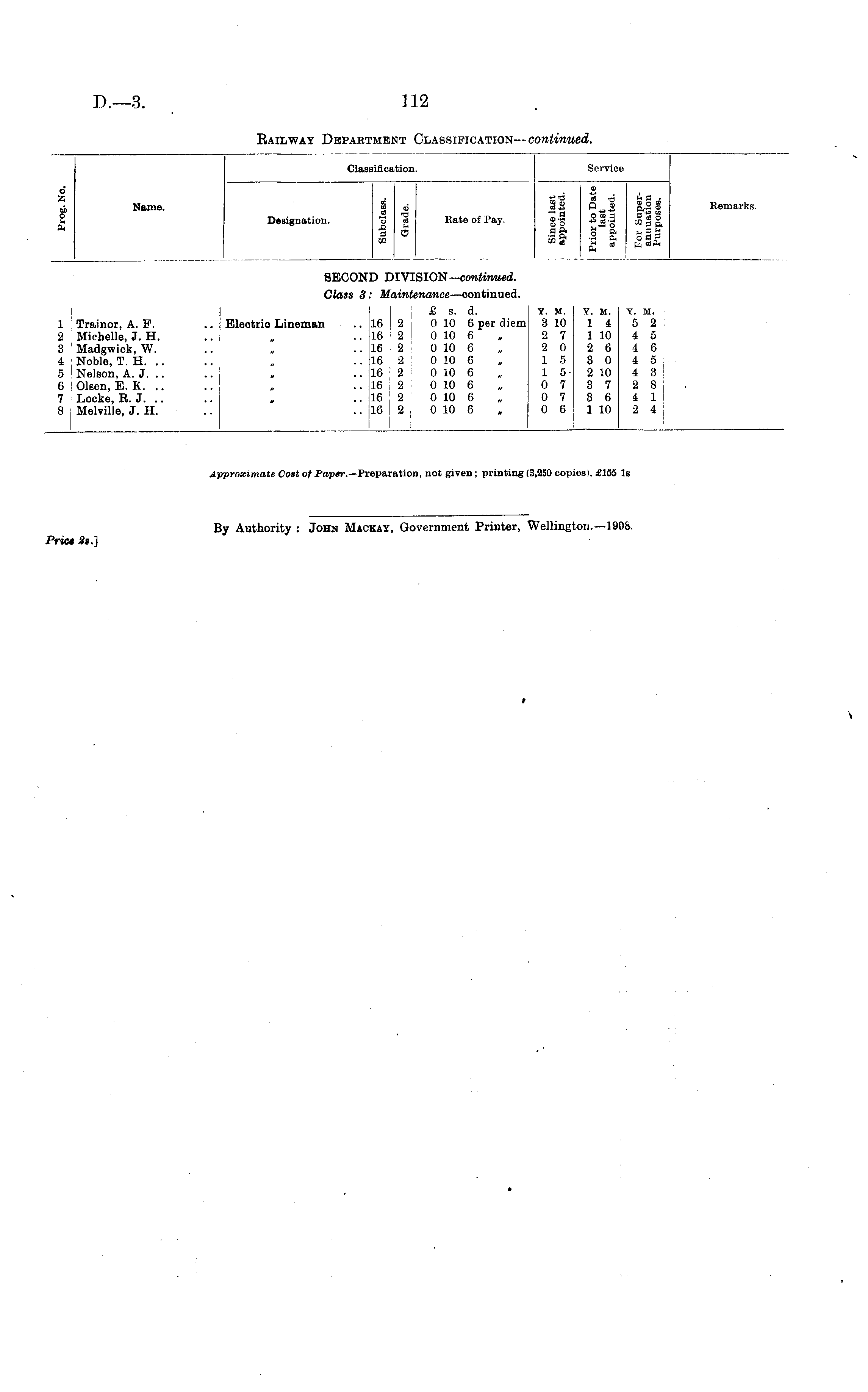 Classification. Service d t Name. Designation. i 3 I X. 6 6 Bate of Fay. s & I §• gas Remarks SECON uv: SION —continued. Class 3 I lint '.nance — continued. 1 Trainor, A. F. 2 Michelle, J. H. 3 Madgwick, W. 4 Noble, T. H. 5 Nelson, A. J. 6 Olsen, E. K. .. 7 Locke, E. J. 8 Melville, J. H. I I Elootrio Lineman 16 16 16 16 Lβ Lβ 16 w> 2 2 '2 2 2 2 2 2 £ s. d. 0 10 6 pet diem 0 10 6 0 10 6 0 10 6 0 10 6 0 10 6 0 10 6 0 10 6 Y. M. 3 10 2 7 2 0 1 6 1 50 7 0 7 0 6 Y. M. 1 4 1 10 2 6 3 0 2 10 3 7 3 6 1 10 Y. M. 5 2 4 5 4 6 4 5 4 3 2 8 4 1 2 4