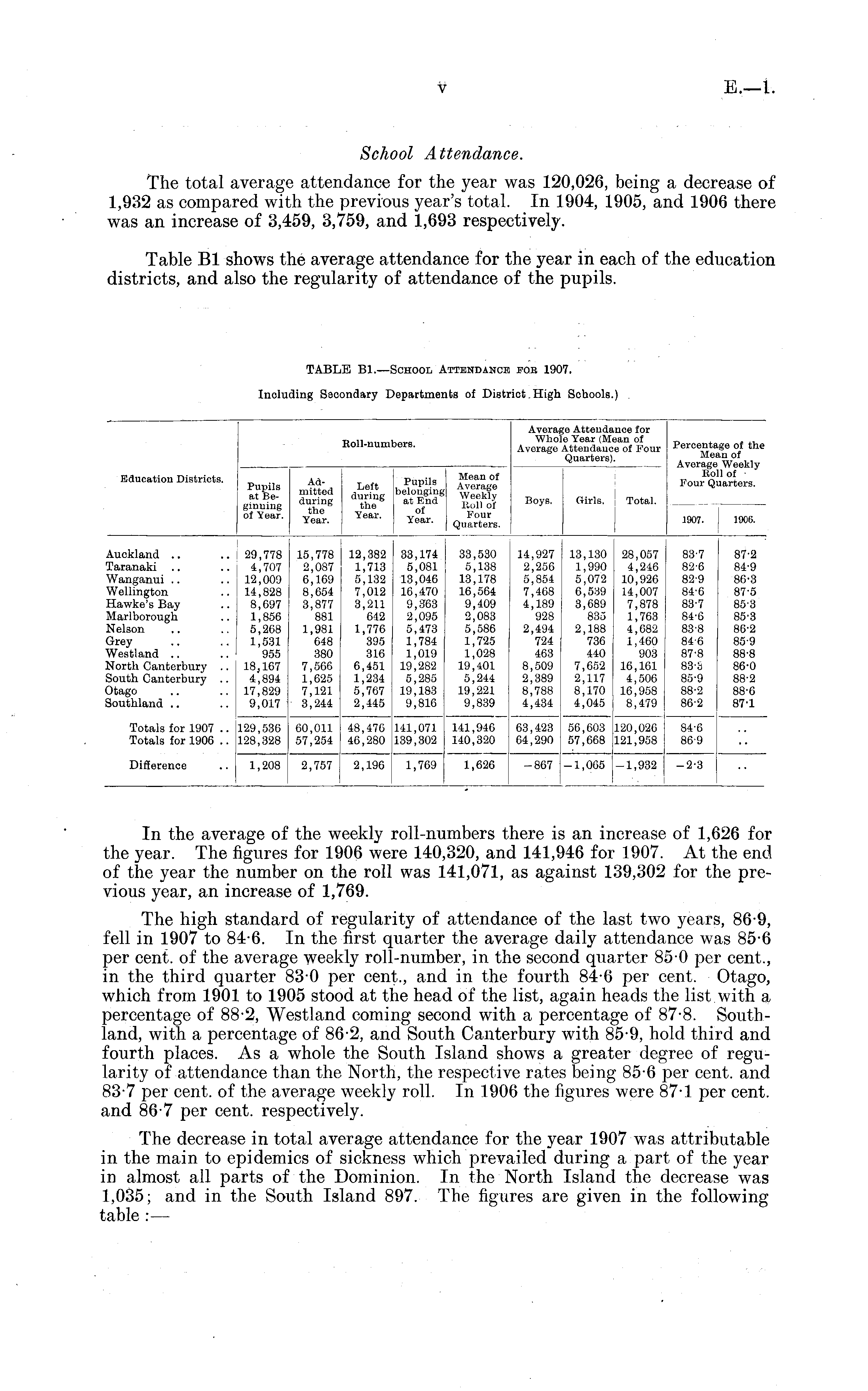 School Attendance. The total average attendance for the year was 120,026, being a decrease of 1,932 as compared with the previous year's total. In 1904, 1905, and 1906 there was an increase of 3,459, 3,759, and 1,693 respectively. Table Bl shows the average attendance for the year in each of the education districts, and also the regularity of attendance of the pupils.