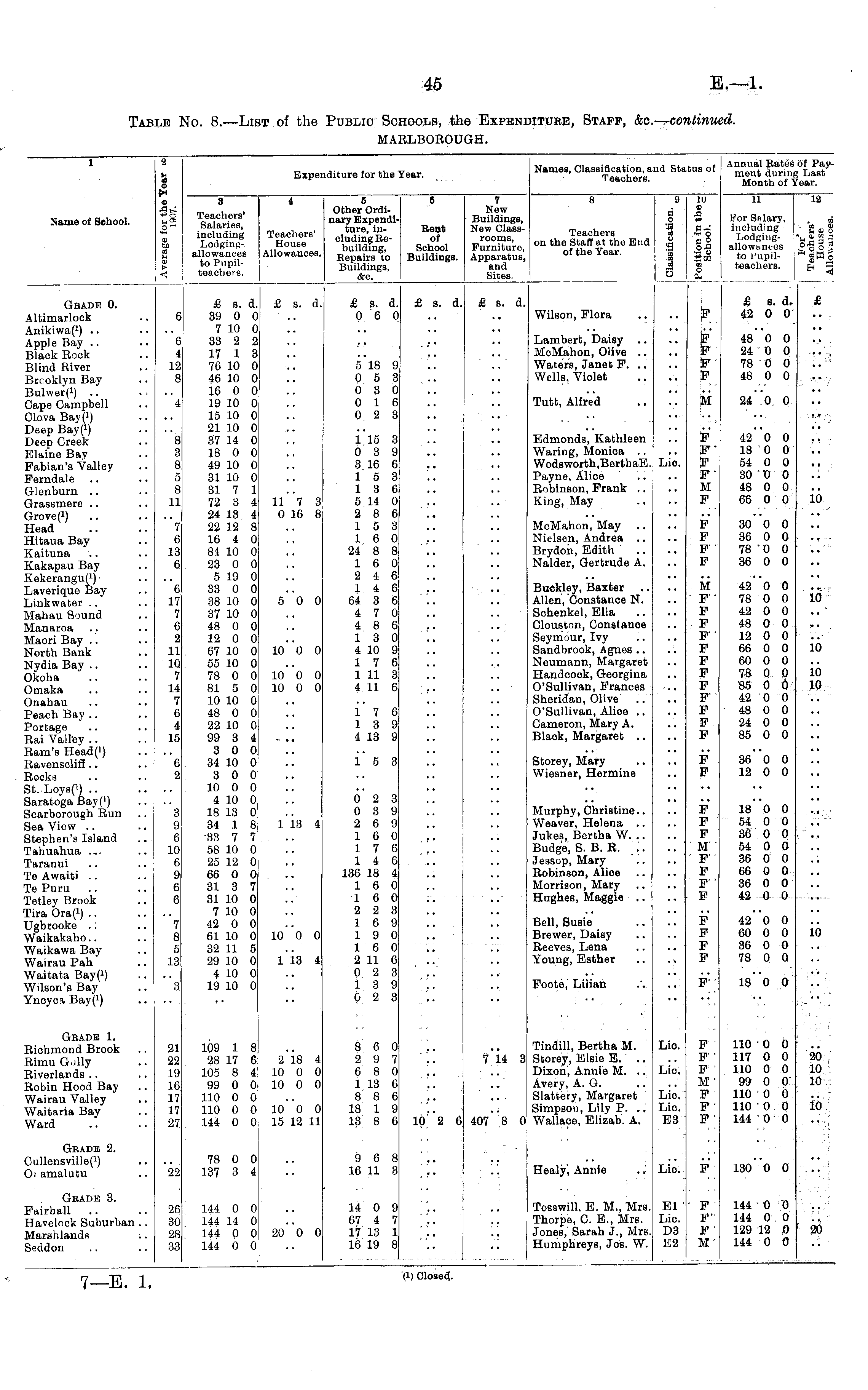 ma: 1 2 Names, Classification, ai Teachers. id Status of Annual Rates of Payment during Last Month of Year. s 9 9 1-2 <2 9 3 E 9 > < Expel iditure for the r ear. Name of School. 3 4 5 Other Ordinary Expenditure, including Rebuilding, Repairs to Buildings, Sec. 6 7 New Buildings, New Classrooms, Furniture, Apparatus, and Sites. 8 9 111 CD § a aS ■•-" o H C o S OrO S3 s o c& to 3 £ 11 12 Teachers' Salaries, including LoclginL:allowances to Pupilteachers. Teachers' House Allowances. Rent of School Buildings. Teachers on the Staff at the End of the Year. For Salary, including Lodgingallowanc.es to t'upilteachers. - cn CO 9 fH CD CJ Hoi Gbade 0. Altimarlock Anikiwaf 1 ) Apple Bay Black Rock Blind River Brroklyn Bay Bulwer) 1 ) Cape Campbell Clova Bayft Deep Bay( J ) Deep Creek Elaine Bay Fabian's Valley Ferndale Glenburn Grassmere Grove (i) Head Hitaua Bay Kaituna Kakapau Bay Kekeranguf 1 ) Laverique Bay Linkwater Mahau Sound £ s. d. 39 0 0 7 10 0 33 2 2 17 1 3 76 10 0 46 10 0 16 0 0 19 10 0 15 10 0 21 10 0 37 14 0 18 0 0 49 10 0 31 10 0 31 7 1 72 3 4 24 13 4 22 12 8 16 4 0 84 10 0 23 0 0 5 19 0 33 0 0 38 10 0 37 10 0 48 0 0 12 0 0 67 10 0 55 10 0 78 0 0 81 5 0 10 10 0 48 0 0 22 10 0 99 3 4 3 0 0 34 10 0 3 0 0 10 0 0 4 10 0 18 13 0 34 1 8 •33 7 7 58 10 0 25 12 0 66 0 0 31 3 7 31 10 0 7 10 0 42 0 0 61 10 0 32 11 5 29 10 0 4 10 0 19 10 0 £ s. d. £ s. d. 0 6 0 £ s. d. £ s. d. F &•• F F M F F F F M F F F F F £ s. d. 42 0 0 £ 6 Wilson, Flora 6 4 12 8 5 18 9 0 5 3 0 3 0 0 16 0 2 3 Lambert, Daisy .. McMahon, Olive .. Waters, Janet F. .. Wells, Violet 48 0 0 24 0 0 78 0 0 48 0 0 24 - 0 0 4 Tutt, Alfred M 8 3 8 5 8 11 7 6 13 6 ll"7 3 0 16 8 1 15 3 0 3 9 3 16 6 1 5 3 13 6 5 14 0 2 8 6 15 3 16 0 24 8 8 16 0 2 4 6 14 6 64 3 6 4 7 0 4 8 6 13 0 4 10 9 17 6 1 11 3 4 11 6 Edmonds, Kathleen Waring, Monioa .. Wodsworth.BerthaE. Payne, Alice Robinson, Frank .. King, May McMahon, May Nielsen, Andrea .. Brydon, Edith Nalder, Gertrude A. Lio. 42 0 0 18 0 0 54 0 0 30 0 0 48 0 0 66 0 0 30 0 0 36 0 0 78 0 0 36 0 0 • * io Manaroa Maori Bay North Bank Nydia Bay Okoha Omaka Onabau Peach Bay Portage Rai Valley Ram's Head(') Ravenscliff Rocks St. Loys(') Saratoga Bay(') Scarborough Run Sea View Stephen's Island Tahuahua ... Taranui Te Awaiti Te Puru Tetley Brook Tira Ora( l ) Ugbrooke .: Waikakaho.. Waikawa Bay Wairau Pah Waitata BayO) Wilson's Bay Ynoyca Bay( J ) 6 17 7 6 2 11 10 7 14 7 6 4 15 5"o 0 io"o 0 Buckley, Baxter Allen, Constance N. Schenkel, Ella Clouston, Constanoe Seymour, Ivy Sandbrook, Agnes .. Neumann, Margaret Handcock, Georgina O'Sullivan, Frances Sheridan, Olive O'Sullivan, Alioe .. Cameron, Mary A. Black, Margaret .. M F ' F F F F F F F F' F F F 42 0 0 78 0 0 42 0 0 48 0 0 12 0 0 66 0 0 60 0 0 78 0 0 85 0 0 42 0 0 48 0 0 24 0 0 85 0 0 io io io 10 io"o 0 10 0 0 17 6 13 9 4 13 9 "6 2 15 3 Storey, Mary Wiesner, Hermine F F 36*0 0 12 0 0 3 9 6 10 6 9 6 6 113 4 0 2 3 0 3 9 2 6 9 16 0 1 7 6 14 6 136 18 4 16 0 16 0 2 2 3 1 6 9 19 0 16 0 2 11 6 0 2 3 13 9 0 2 3 . t * Murphy, Christine.. Weaver, Helena .. Jukes, Bertha W. .. Budge, S. B. R. \ .'. Jessop, Mary Robinson, Alice Morrison, Mary Hughes, Maggie .. F F F M ' F F p-' F 18 0 0 54 0 0 36 0 0 54 0 0 36 0 0 66 0 0 36 0 0 42 O 0 7 8 5 13 io"o 0 Bell, Susie Brewer, Daisy Reeves, Lena Young, Esther F F F F 42 0 0 60 0 0 36 0 O 78 0 0 io 113 4 "3 Foote, Lilian F" 18*0 0 Gbade 1. Richmond Brook Rimu G>iliy Riverlands Robin Hood Bay Wairau Valley Waitaria Bay Ward 21 22 19 10 17 17 27 109 1 8 28 17 6 105 8 4 99 0 0 110 0 0 110 0 0 144 0 0 2 18 4 10 0 0 10 0 0 8 6 0 2 9 7 6 8 0 1 13 6 8 8 6 18 1 9 13 8 6 7*14 3 Tindill, Bertha M. Storey, Elsie E. .. Dixon, Annie M. .. Avery, A. G. Slattery, Margaret Simpson, Lily P. .. Wallace, Elizab. A. Lio. Lie. Lie. Lio. E3 F ' F p ■ M ' F F F 110 0 0 117 0 0 110 0 0 99 0 0 110 0 0 110 0 0 144 0 0 20 10 10 10 0 0 15 12 11 io 10 "2 6 407 8 0 Geade 2. Cullensvillel 1 ) Oi amalutu 78 0 0 137 3 4 9 6 8 16 11 3 Healy, Annie Lio. F 130' 0 0 '22 Geade 3. Fairhall Havelock Suburban .. Marshlands -.. Seddon ... 26 30 28 33 144 0 0 144 14 0 144 0 0 144 0 0 14 0 9 67 4 7 17 13 1 16 19 8 Tosswill, E. M., Mrs. Thorpe, C. E., Mrs. Jones, Sarah J., Mrs. Humphreys, Jos. W. El ' Lie. D3 E2 p F' F M' 144 0 0 144 0 0 129 12 0 144 0 0 26 20 0 0 (i) Closed.