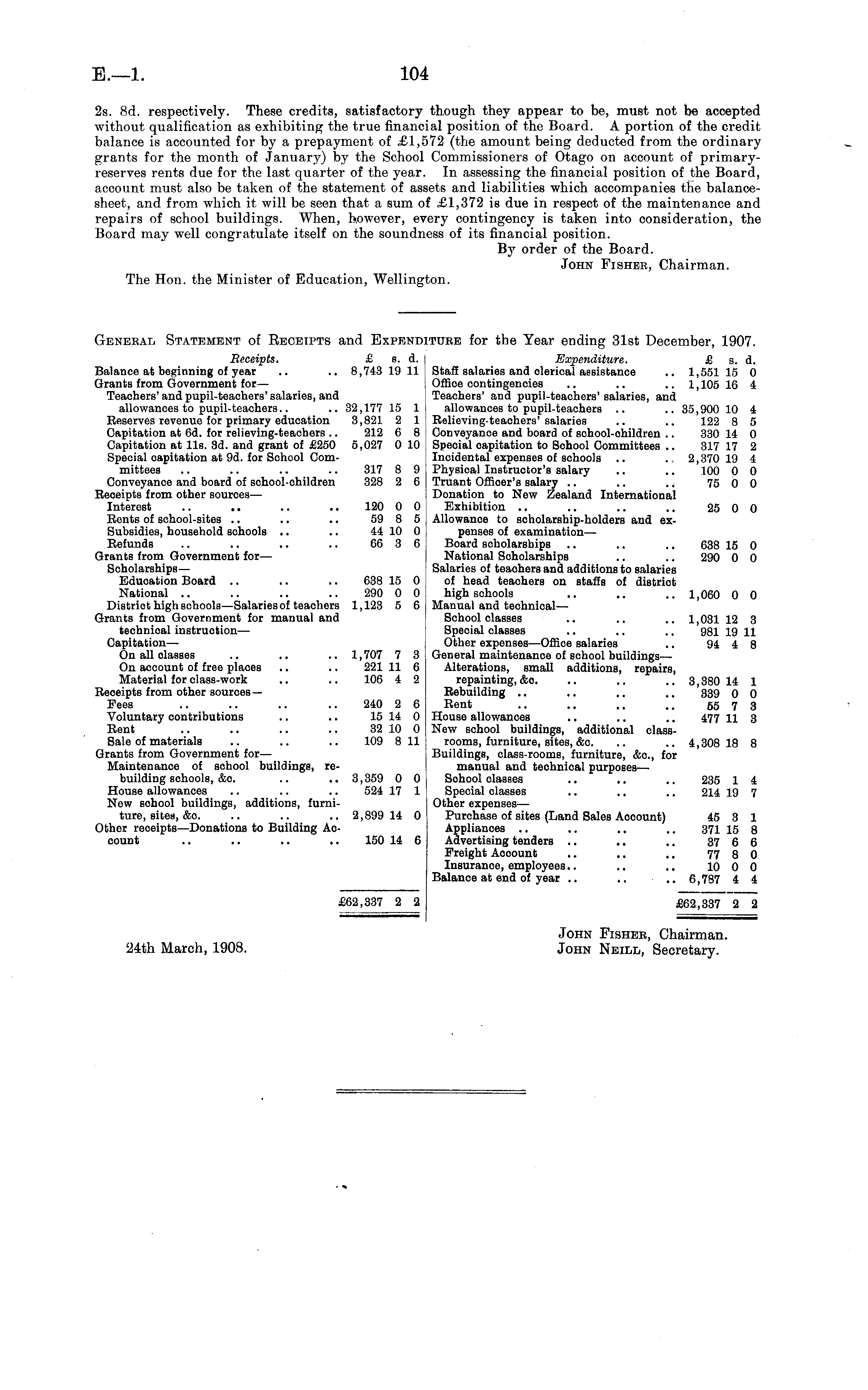 2s. Bd. respectively. These credits, satisfactory though they appear to be, must not be accepted without qualification as exhibiting the true financial position of the Board. A portion of the credit balance is accounted for by a prepayment of £1,572 (the amount being deducted from the ordinary grants for the month of January) by the School Commissioners of Otago on account of primaryreserves rents due for the last quarter of the year. In assessing the financial position of the Board, account must also be taken of the statement of assets and liabilities which accompanies the balancesheet, and from which it will be seen that a sum of £1,372 is due in respect of the maintenance and repairs of school buildings. When, however, every contingency is taken into consideration, the Board may well congratulate itself on the soundness of its financial position. By order of the Board. John Fisher, Chairman. The Hon. the Minister of Education, Wellington.