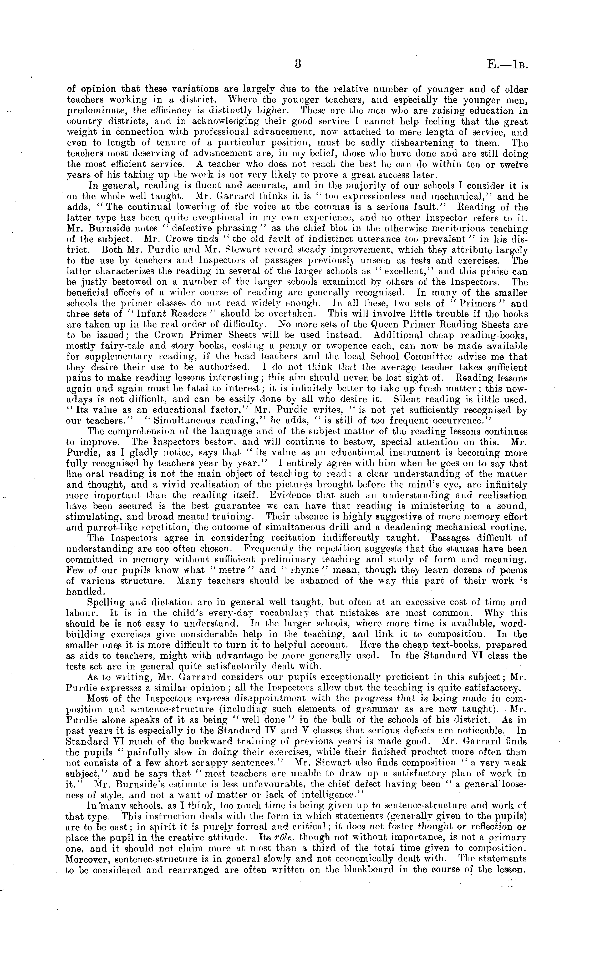 of opinion that these variations are largely due to the relative number of younger and of older teachers working in a district. Where the younger teachers, and especially the younger men, predominate, the efficiency is distinctly higher. These are the men who are raising education in country districts, and in acknowledging their good service I cannot help feeling that the great weight in connection with professional advancement, now attached to mere length of service, and even to length of tenure of a particular position, must be sadly disheartening to them. The teachers most deserving of advancement are, in my belief, those who have done and are still doing the most efficient service. A teacher who does not reach the best he can do within ten or twelve years of his taking up the w r ork is not very likely to prove a great success later. In general, reading is fluent and accurate, and in the majority of our schools I consider it is on the whole well taught. Air. Garrard thinks it is ''too expressionless and mechanical," and he adds, " The continual lowering of the voice at the commas is a serious fault." Reading of the latter type has been quite exceptional in my own experience, and no other Inspector refers to it. Mr. Burnside notes " defective phrasing " as the chief blot in the otherwise meritorious teaching of the subject. Mr. Crowe finds "the old fault of indistinct utterance too prevalent" in his district. Both Mr. Purdic and Mr. Stewart record steady improvement, which they attribute largely to the use by teachers and Inspectors of passages previously unseen as tests and exercises. The latter characterizes the vending in several of the larger schools as " excellent," and this praise can be justly bestowed on a number of the larger schools examined by others of the Inspectors. The beneficial effects of a wider course of reading are generally recognised. In many of the smaller schools the primer classes do not read widely enough. In all these, two sets of "Primers" and three sets of " Infant Readers " should be overtaken. This will involve little trouble if the books are taken up in the real order of difficulty. No more sets of the Queen Primer Reading Sheets are to be issued; the Crown Primer Sheets will be used instead. Additional cheap reading-books, mostly fairy-tale and story books, costing a penny or twopence each, can now be made available for supplementary reading, if the head teachers and the local School Committee advise me that they desire their use to be authorised. Ido not think that the average teacher takes sufficient pains to make reading lessons interesting; this aim should never.be lost sight of. Reading lessons again and again must be fatal to interest; it is infinitely better to take up fresh matter; this nowadays is not difficult, and can be easily done by all who desire it. Silent reading is little used. " Its value as an educational factor," Mr. Purdie writes, " is not yet sufficiently recognised by our teachers." " Simultaneous reading," he adds, "is still of too frequent occurrence." The comprehension of the language and of the subject-matter of the reading lessons continues to improve. The Inspectors bestow, and will continue to bestow, special attention on this. Mr. Purdie, as I gladly notice, says that " its value as an educational instrument is becoming more fully recognised by teachers year by year." I entirely agree with him when he goes on to say that fine oral reading is not the main object of teaching to read : a clear understanding of the matter and thought, and a vivid realisation of the pictures brought before the mind's eye, are infinitely more important than the reading itself. Evidence that such an understanding and realisation have been secured is the best guarantee we can have that reading is ministering to a sound, stimulating, and broad mental training. Their absence is highly suggestive of mere memory effort and parrot-like repetition, the outcome of simultaneous drill and a deadening mechanical routine. The Inspectors agree in considering recitation indifferently taught. Passages difficult of understanding are too often chosen. Frequently the repetition suggests that the stanzas have been committed to memory without sufficient preliminary teaching and study of form and meaning. Few of our pupils know what " metre " and " rhyme " mean, though they learn dozens of poems of various structure. Many teachers should be ashamed of the way this part of their work *s handled. Spelling and dictation are in general well taught, but often at an excessive cost of time and labour. It is in the child's every-day vocabulary that mistakes are most common. Why this should be is not easy to understand. In the larger schools, where more time is available, wordbuilding exercises give considerable help in the teaching, and link it to composition. In the smaller onqg it is more difficult to turn it to helpful account. Here the cheap text-books, prepared as aids to teachers, might with advantage be more generally used. In the Standard VI class the tests set are in general quite satisfactorily dealt with. As to writing, Mr. Garrard considers our pupils exceptionally proficient in this subject; Mr. Purdie expresses a similar opinion ; all the Inspectors allow that the teaching is quite satisfactory. Most of the Inspectors express disappointment with the progress that is being made in composition and sentence-structure (including such elements of grammar as are now taught). Mr. Purdie alone speaks of it as being "well done " in the bulk of the schools of his district. As in past years it is especially in the Standard IV and V classes that serious defects are noticeable. In Standard VI much of the backward training of previous years is made good. Mr. Garrard finds the pupils " painfully slow in doing their exercises, while their finished product more often than not consists of a few short scrappy sentences." Mr. Stewart also finds composition " a very weak subject,