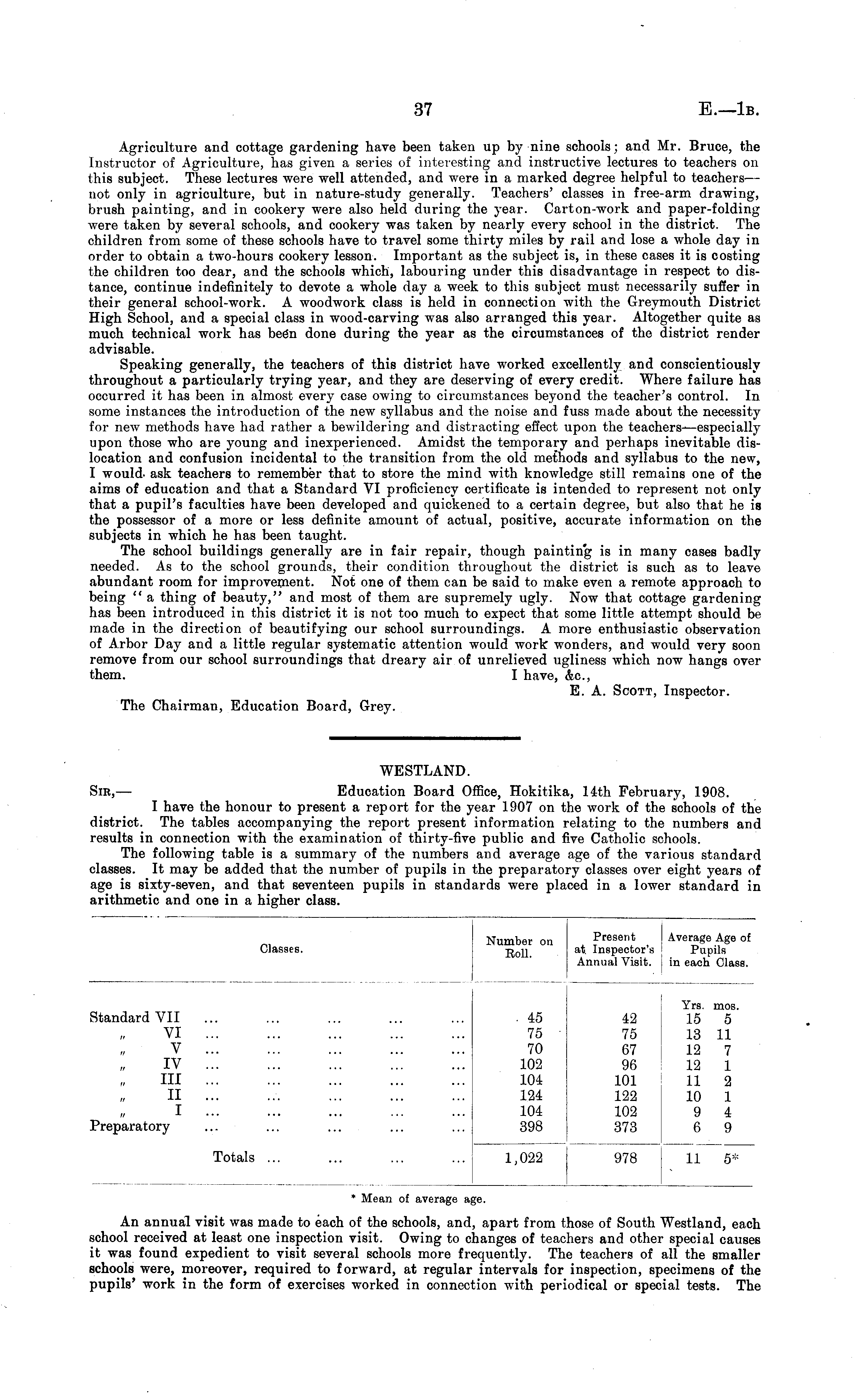 WESTLAND. Sib, — Education Board Office, Hokitika, 14th February, 1908. I have the honour to present a report for the year 1907 on the work of the schools of the district. The tables accompanying the report present information relating to the numbers and results in connection with the examination of thirty-five public and five Catholic schools. The following table is a summary of the numbers and average age of the various standard classes. It may be added that the number of pupils in the preparatory classes over eight years of age is sixty-seven, and that seventeen pupils in standards were placed in a lower standard in arithmetic and one in a higher class.