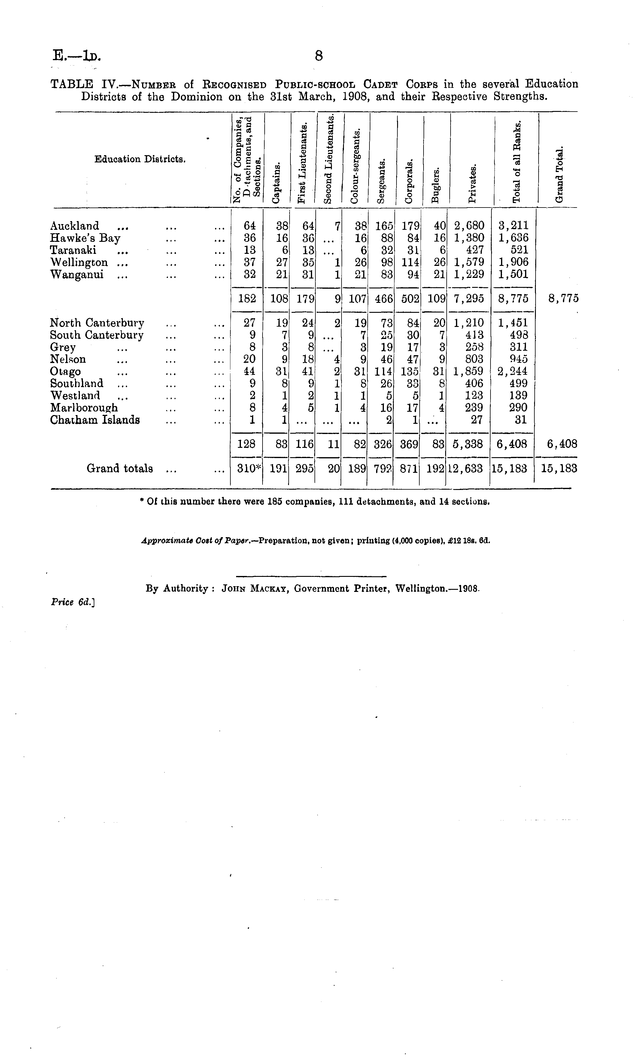 TABLE IV.—Number of Recognised Public-school Cadet Corps in the several Education Districts of the Dominion on the 31st March, 1908, and their Respective Strengths.