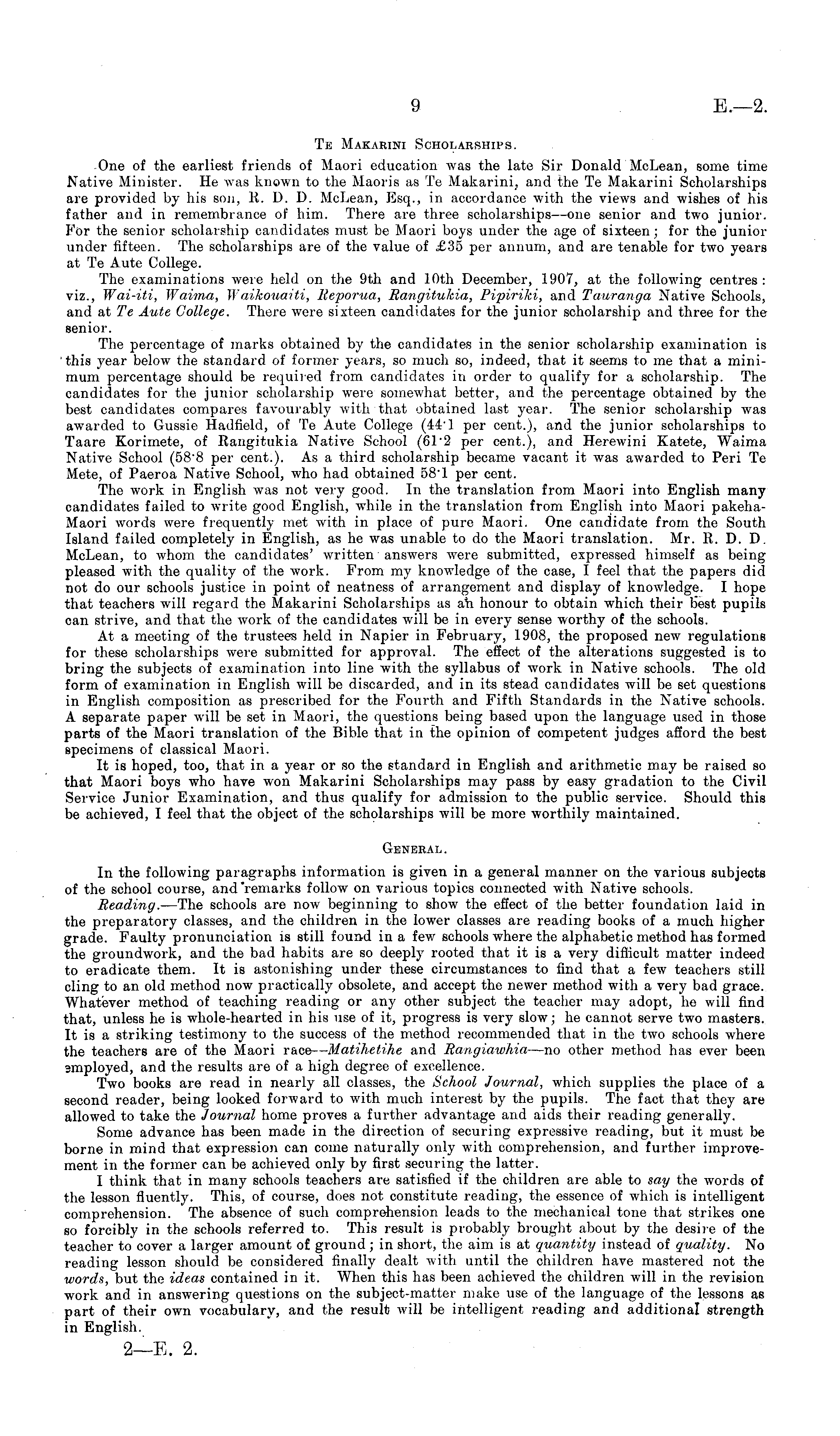 One of the earliest friends of Maori education was the late Sir Donald McLean, some time Native Minister. He was known to the Maoris as Te Makarini, and the Te Makarini Scholarships are provided by his son, R. D. D. McLean, Esq., in accordance with the views and wishes of his father and in remembrance of him. There are three scholarships—one senior and two junior. For the senior scholarship candidates must be Maori boys under the age of sixteen; for the junior under fifteen. The scholarships are of the value of £35 per annum, and are tenable for two years at Te Aute College. The examinations were held on the 9th and 10th December, 1907, at the following centres : viz., Wai-iti, Waima, Waikouaiti, Reporua, Rangitukia, Pipiriki, and Tauranga Native Schools, and at Te Aute College. There were sixteen candidates for the junior scholarship and three for the senior. The percentage of marks obtained by the candidates in the senior scholarship examination is this year below the standard of former years, so much so, indeed, that it seems to me that a minimum percentage should be required from candidates in order to qualify for a scholarship. The candidates for the junior scholarship were somewhat better, and the percentage obtained by the best candidates compares favourably with that obtained last year. The senior scholarship was awarded to Gussie Hadfield, of Te Aute College (441 per cent.), and the junior scholarships to Taare Korimete, of Rangitukia Native School (61 '2 per cent.), and Herewini Katete, Waima Native School (588 per cent.). As a third scholarship became vacant it was awarded to Peri Te Mete, of Paeroa Native School, who had obtained 58"1 per cent. The work in English was not very good. In the translation from Maori into English many candidates failed to write good English, while in the translation from English into Maori pakehaMaori words were frequently met with in place of pure Maori. One candidate from the South Island failed completely in English, as he was unable to do the Maori translation. Mr. R. D. D. McLean, to whom the candidates' written answers were submitted, expressed himself as being pleased with the quality of the work. From my knowledge of the case, I feel that the papers did not do our schools justice in point of neatness of arrangement and display of knowledge. I hope that teachers will regard the Makarini Scholarships as atr honour to obtain which their best pupils can strive, and that the work of the candidates will be in every sense worthy of the schools. At a meeting of the trustees held in Napier in February, 1908, the proposed new regulations for these scholarships were submitted for approval. The effect of the alterations suggested is to bring the subjects of examination into line with the syllabus of work in Native schools. The old form of examination in English will be discarded, and in its stead candidates will be set questions in English composition as prescribed for the Fourth and Fifth Standards in the Native schools. A separate paper will be set in Maori, the questions being based upon the language used in those parts of the Maori translation of the Bible that in the opinion of competent judges afford the best specimens of classical Maori. It is hoped, too, that in a year or so the standard in English and arithmetic may be raised so that Maori boys who have won Makarini Scholarships may pass by easy gradation to the Civil Service Junior Examination, and thus qualify for admission to the public service. Should this be achieved, I feel that the object of the scholarships will be more worthily maintained. General. In the following paragraphs information is given in a general manner on the various subjects of the school course, and "remarks follow on various topics connected with Native schools. Reading. —The schools are now beginning to show the effect of the better foundation laid in the preparatory classes, and the children in the lower classes are reading books of a much higher grade. Faulty pronunciation is still found in a few schools where the alphabetic method has formed the groundwork, and the bad habits are so deeply rooted that it is a very difficult matter indeed to eradicate them. It is astonishing under these circumstances to find that a few teachers still cling to an old method now practically obsolete, and accept the newer method with a very bad grace. Whatever method of teaching reading or any other subject the teacher may adopt, he will find that, unless he is whole-hearted in his use of it, progress is very slow; he cannot serve two masters. It is a striking testimony to the success of the method recommended that in the two schools where the teachers are of the Maori race — Matihetihe and Rangiawhia —no other method has ever been smployed, and the results are of a high degree of excellence. Two books are read in nearly all classes, the School Journal, which supplies the place of a second reader, being looked forward to with much interest by the pupils. The fact that they are allowed to take the Journal home proves a further advantage and aids their reading generally. Some advance has been made in the direction of securing expressive reading, but it must be borne in mind that expression can come naturally only with comprehension, and further improvement in the former can be achieved only by first securing the latter. I think that in many schools teachers are satisfied if the children are able to say the words of the lesson fluently. This, of course, does not constitute reading, the essence of which is intelligent comprehension. The absence of such comprehension leads to the mechanical tone that strikes one so forcibly in the schools referred to. This result is probably brought about by the desire of the teacher to cover a larger amount of ground; in short, the aim is at quantity instead of quality. No reading lesson should be considered finally dealt with until the children have mastered not the words, but the ideas contain