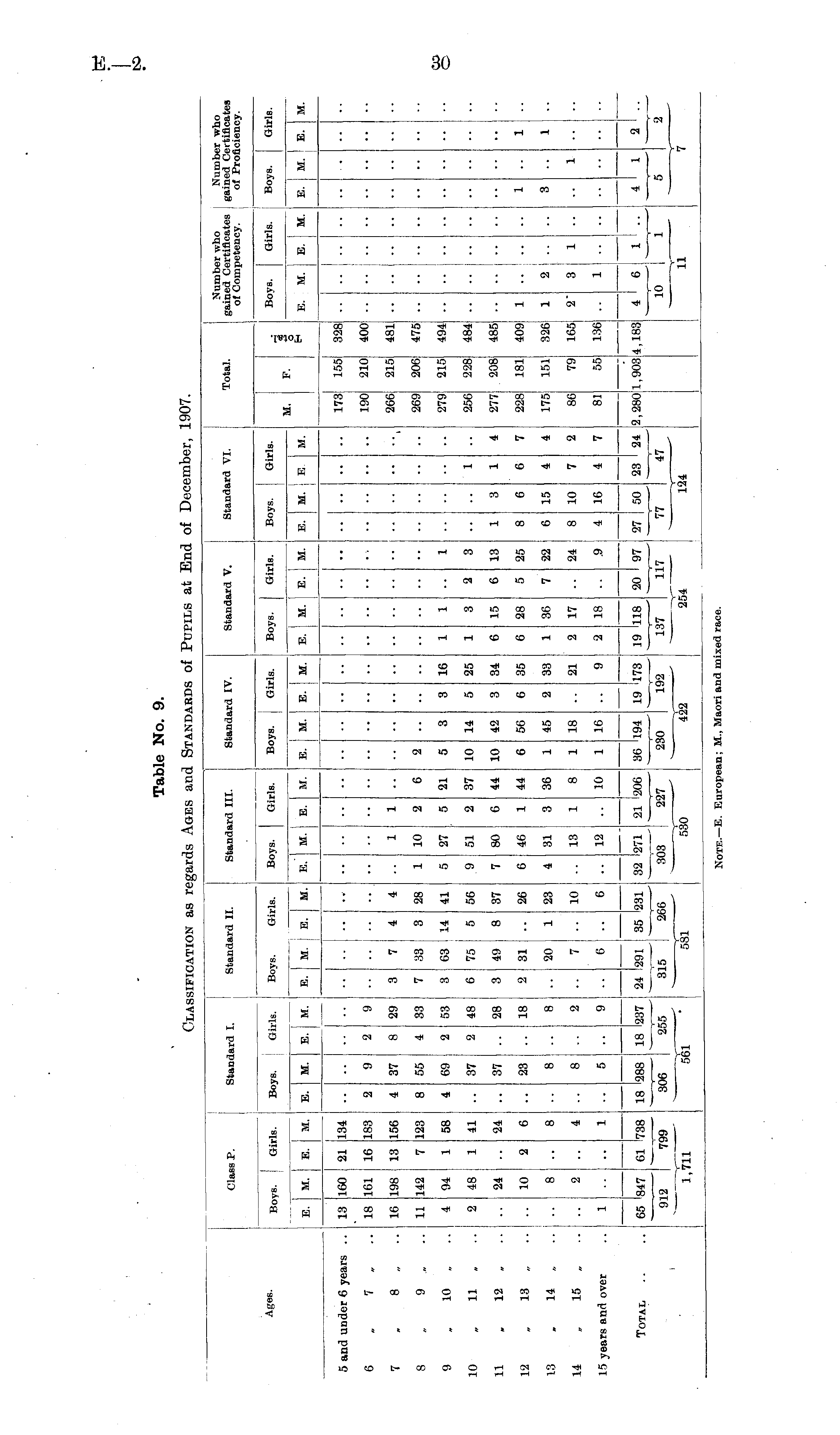Table No. 9. Classification as regards Ages and Standards of Pupils at End of December, 1907.
