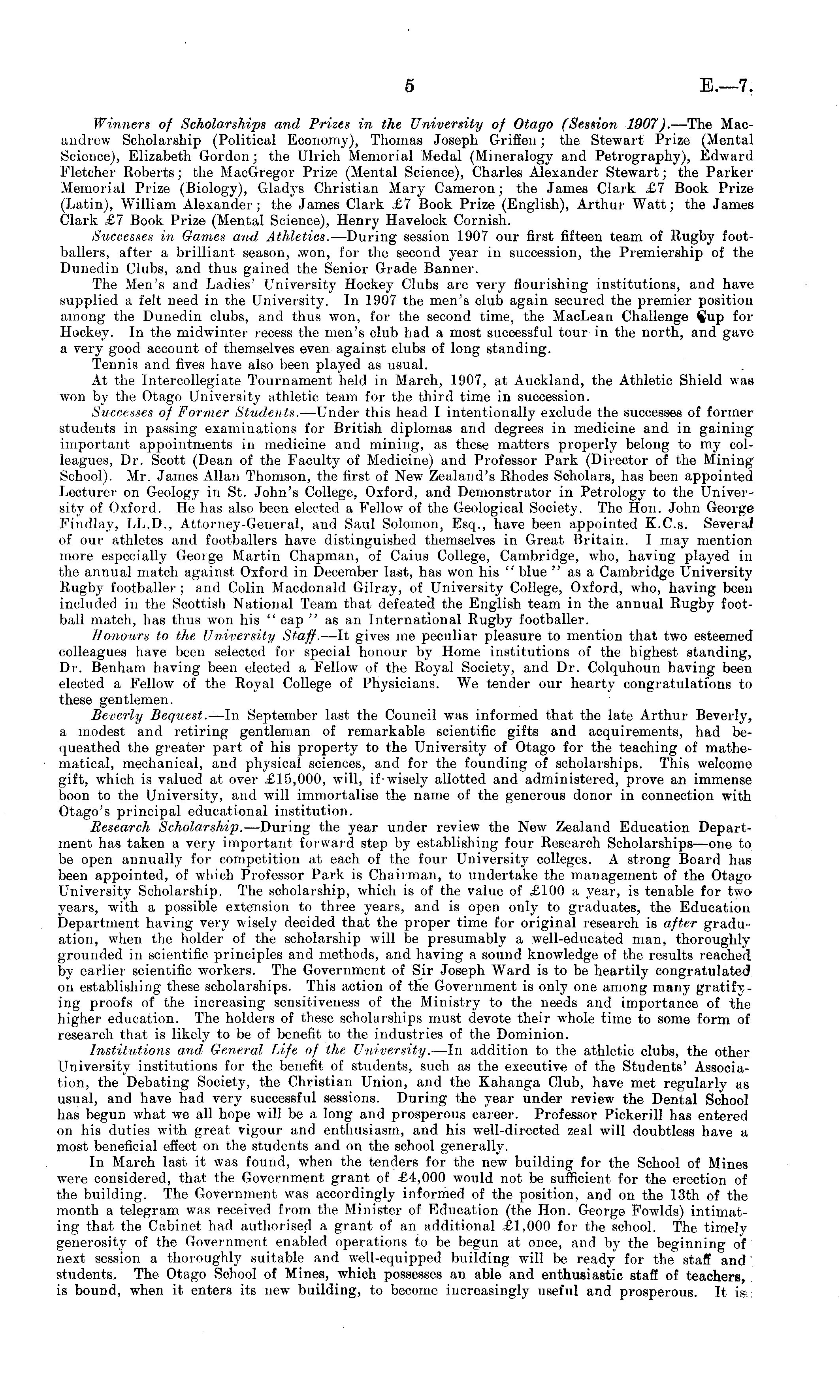 Winners of Scholarships and Prizes in the University of Otago (Session 1907). —The Macaudrew Scholarship (Political Economy), Thomas Joseph Griffen; the Stewart Prize (Mental Science), Elizabeth Gordon ; the Ulrich Memorial Medal (Mineralogy and Petrography), Edward Fletcher Roberts; the MacGregor Prize (Mental Science), Charles Alexander Stewart; the Parker Memorial Prize (Biology), Gladys Christian Mary Cameron; the James Clark £7 Book Prize (Latin), William Alexander; the James Clark £7 Book Prize (English), Arthur Watt; the James Clark £7 Book Prize (Mental Science), Henry Havelock Cornish. Successes in Games and Athletics. —During session 1907 our first fifteen team of Rugby footballers, after a brilliant season, .won, for the second year in succession, the Premiership of the Dunedin Clubs, and thus gained the Senior Grade Banner. The Men's and Ladies' University Hockey Clubs are very flourishing institutions, and have supplied a felt need in the University. In 1907 the men's club again secured the premier position among the Dunedin clubs, and thus won, for the second time, the Mac Lean Challenge for Hockey. In the midwinter recess the men's club had a most successful tour in the north, and gave a very good account of themselves even against clubs of long standing. Tennis and fives have also been played as usual. At the Intercollegiate Tournament held in March, 1907, at Auckland, the Athletic Shield was won by the Otago University athletic team for the third time in succession. Successes of Former Students. —Under this head I intentionally exclude the successes of former students in passing examinations for British diplomas and degrees in medicine and in gaining important appointments in medicine and mining, as these matters properly belong to my colleagues, Dr. Scott (Dean of the Faculty of Medicine) and Professor Park (Director of the Mining School). Mr. James Allan Thomson, the first of New Zealand's Rhodes Scholars, has been appointed Lecturer on Geology in St. John's College, Oxford, and Demonstrator in Petrology to the University of Oxford. He has also been elected a Fellow of the Geological Society. The Hon. John George Findlay, LL.D., Attorney-General, and Saul Solomon, Esq., have been appointed K.C.s. Several of our athletes and footballers have distinguished themselves in Great Britain. I may mention more especially Geoige Martin Chapman, of Caius College, Cambridge, who, having played in the annual match against Oxford in December last, has won his " blue " as a Cambridge University Rugby footballer ; and Colin Macdonald Gilray, of University College, Oxford, who, having been included in the Scottish National Team that defeated the English team in the annual Rugby football match, has thus won his " cap " as an International Rugby footballer. Honours to the University Staff. —It gives me peculiar pleasure to mention that two esteemed colleagues have been selected for special honour by Home institutions of the highest standing, Dr. Benharn having been elected a Fellow of the Royal Society, and Dr. Colquhoun having been elected a Fellow of the Royal College of Physicians. We tender our hearty congratulations to these gentlemen. Beverly Bequest.— -In September last the Council was informed that the late Arthur Beverly, a modest and retiring gentleman of remarkable scientific gifts and acquirements, had bequeathed the greater part of his property to the University of Otago for the teaching of mathematical, mechanical, and physical sciences, and for the founding of scholarships. This welcome gift, which is valued at over £15,000, will, if-wisely allotted and administered, prove an immense boon to the University, and will immortalise the name of the generous donor in connection with Otago's principal educational institution. Besearch Scholarship. —During the year under review the New Zealand Education Department has taken a very important forward step by establishing four Research Scholarships—one to be open annually for competition at each of the four University colleges. A strong Board has been appointed, of which Professor Park is Chairman, to undertake the management of the Otago University Scholarship. The scholarship, which is of the value of £100 a year, is tenable for twoyears, with a possible extension to three years, and is open only to graduates, the Education Department having very wisely decided that the proper time for original research is after graduation, when the holder of the scholarship will be presumably a well-educated man, thoroughly grounded in scientific principles and methods, and having a sound knowledge of the results reached by earlier scientific workers. The Government of Sir Joseph AVard is to be heartily congratulated on establishing these scholarships. This action of the Government is only one among many gratifying proofs of the increasing sensitiveness of the Ministry to the needs and importance of the higher education. The holders of these scholarships must devote their whole time to some form of research that is likely to be of benefit to the industries of the Dominion. Institutions and General Life of the University. —ln addition to the athletic clubs, the other University institutions for the benefit of students, such as the executive of the Students' Association, the Debating Society, the Christian Union, and the Kahanga Club, have met regularly as usual, and have had very successful sessions. During the year under review the Dental School has begun what we all hope will be a long and prosperous career. Professor Pickerill has entered on his duties with great vigour and enthusiasm, and his well-directed zeal will doubtless have a most beneficial effect on the students and on the school generally. In March last it was found, when the tenders for the new building for the School of Mines were considered, that the Government grant of £4,000 would not be sufficient for the erection of the building. The Government was accordi