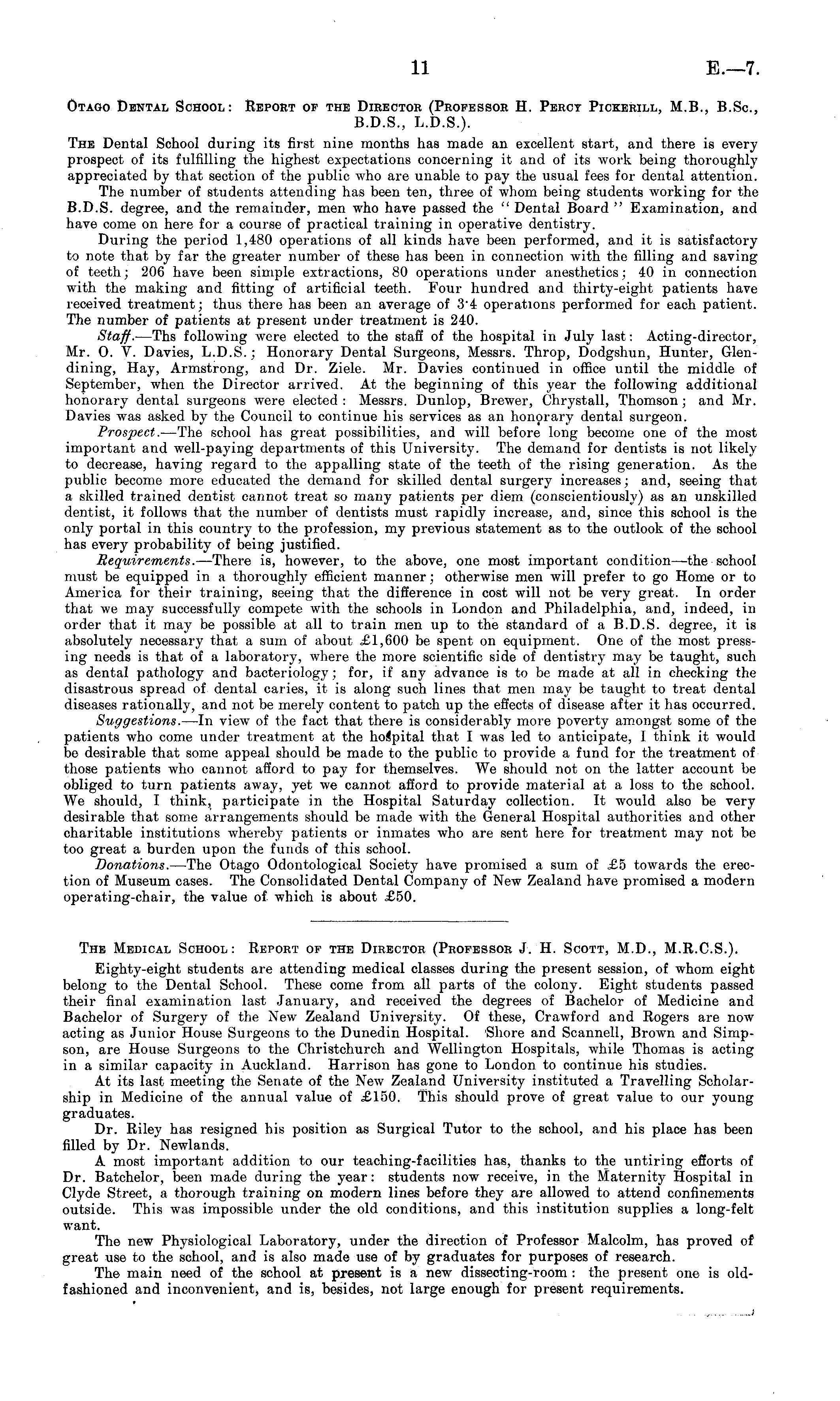 Otago Dental School: Report op the Director (Professor H. Percy Pickerill, M.8., B.Sc, 8.D.5., L.D.S.). The Dental School during its first nine months has made an excellent start, and there is every prospect of its fulfilling the highest expectations concerning it and of its work being thoroughly appreciated by that section of the public who are unable to pay the usual fees for dental attention. The number of students attending has been ten, three of whom being students working for the B.D.S. degree, and the remainder, men who have passed the " Dental Board " Examination, and have come on here for a course of practical training in operative dentistry. During the period 1,480 operations of all kinds have been performed, and it is satisfactory to note that by far the greater number of these has been in connection with the filling and saving of teeth; 206 have been simple extractions, 80 operations under anesthetics; 40 in connection with the making and fitting of artificial teeth. Four hundred and thirty-eight patients have received treatment; thus there has been an average of 34 operations performed for each patient. The number of patients at present under treatment is 240. Staff. —Ths following were elected to the staff of the hospital in July last: Acting-director, Mr. O. V. Davies, L.D.S.; Honorary Dental Surgeons, Messrs. Throp, Dodgshun, Hunter, Glendining, Hay, Armstrong, and Dr. Ziele. Mr. Davies continued in office until the middle of September, when the Director arrived. At the beginning of this year the following additional honorary dental surgeons were elected : Messrs. Dunlop, Brewer, Chrystall, Thomson; and Mr. Davies was asked by the Council to continue his services as an honorary dental surgeon. Prospect. —The school has great possibilities, and will before long become one of the most important and well-paying departments of this University. The demand for dentists is not likely to decrease, having regard to the appalling state of the teeth of the rising generation. As the public become more educated the demand for skilled dental surgery increases; and, seeing that a skilled trained dentist cannot treat so many patients per diem (conscientiously) as an unskilled dentist, it follows that the number of dentists must rapidly increase, and, since this school is the only portal in this country to the profession, my previous statement as to the outlook of the school has every probability of being justified. Requirements. —There is, however, to the above, one most important condition —the school must be equipped in a thoroughly efficient manner; otherwise men will prefer to go Home or to America for their training, seeing that the difference in cost will not be very great. In order that we may successfully compete with the schools in London and Philadelphia, and, indeed, in order that it may be possible at all to train men up to the standard of a B.D.S. degree, it is absolutely necessary that a sum of about £1,600 be spent on equipment. One of the most pressing needs is that of a laboratory, where the more scientific side of dentistry may be taught, such as dental pathology and bacteriology; for, if any advance is to be made at all in checking the disastrous spread of dental caries, it is along such lines that men may be taught to treat dental diseases rationally, and not be merely content to patch up the effects of disease after it has occurred. Suggestions. —ln view of the fact that there is considerably more poverty amongst some of the patients who come under treatment at the hospital that I was led to anticipate, I think it would be desirable that some appeal should be made to the public to provide a fund for the treatment of those patients who cannot afford to pay for themselves. We should not on the latter account be obliged to turn patients away, yet we cannot afford to provide material at a loss to the school. We should, I think, participate in the Hospital Saturday collection. It would also be very desirable that some arrangements should be made with the General Hospital authorities and other charitable institutions whereby patients or inmates who are sent here for treatment may not be too great a burden upon the funds of this school. Donations. —The Otago Odontological Society have promised a sum of £5 towards the erection of Museum cases. The Consolidated Dental Company of New Zealand have promised a modern operating-chair, the value of which is about £50.