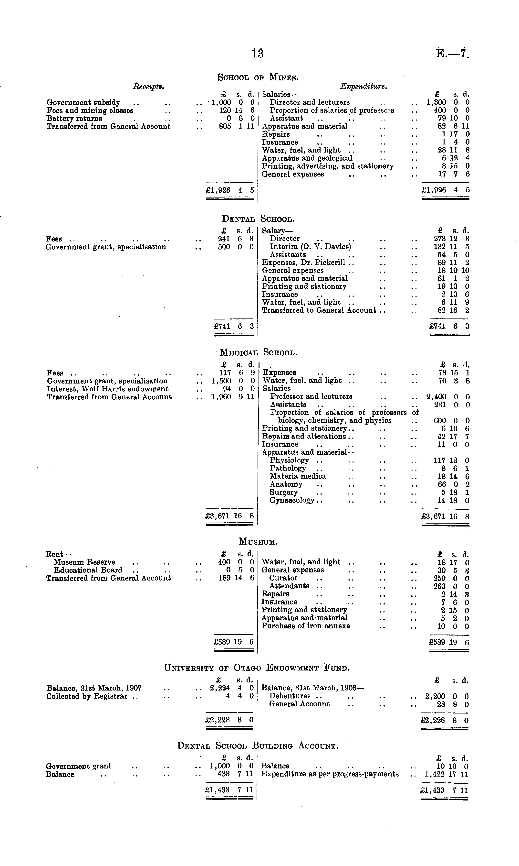School op Mines. Beceiptt. Expenditure. £ s. d. Salaries— £ s. d. Government subsidy .. .. .. 1,000 0 0 Director and lecturers .. .. 1,300 0 0 Pees and mining olasses .. .. 120 14 6 Proportion of salaries of professors .. 400 0 0 Battery returns .. .. .. 0 8 0 Assistant .. .'. .. .. 79 10 0 Transferred from General Account .. 805 111 Apparatus and material .. .. 82 611 Repairs ' .. .. .. .. 1 17 0 Insurance .. .. .. .. 14 0 Water, fuel, and light .. .. .. 28 11 8 Apparatus and geological .. .. 6 12 4 Printing, advertising, and stationery .. 815 0 General expenses .. .. .. 17 7 6 £1,926 4 5 £1,926 4 5 Dental School. £ s. d. Salary— £ a. d. Fees .. .. .. .. .. 241 6 3 Director .. .. .. .. 273 12 3 Government grant, specialisation .. 500 0 0 Interim (O. V. Davies) .. .. 132 11 5 Assistants .. .. .. .. 54 5 0 Expenses, Dr. Pickerill .. .. .. 89 11 2 General expenses .. .. .. 18 10 10 Apparatus and material .. .. 61 1 2 Printing and stationery .. .. 19 13 0 Insurance .. .. .. .. 2 13 6 Water, fuel, and light .. .. .. 6 11 9 Transferred to General Acoount .. .. 82 16 2 £741 6 3 £741 6 3 Medical School. £ a. d. £ s. d. Fees .. .. .. .. .. 117 6 9 Expenses .. .. .. .. 78 15 1 Government grant, specialisation .. 1,500 0 0 Water, fuel, and light .. .. .. 70 3 8 Interest, Wolf Harris endowment .. 94 0 0 Salaries — Transferred from General Account .. 1,960 9 11 Professor and lecturers .. .. 2,400 0 0 Assistants .. .. .. .. 231 0 0 Proportion of salaries of professors of biology, chemistry, and physios .. 600 0 0 Printing and stationery.. .. .. 6 10 6 Repairs and alterations .. .. .. 42 17 7 Insurance .. .. .. .. 110 0 Apparatus and material — Physiology .. .. .. .. 117 13 0 Pathology .. .. .. .. 8 6 1 Materia medica .. .. .. 18 14 6 Anatomy .. .. .. .. 66 0 2 Surgery .. .. .. .. 518 1 Gynaecology.. .. .. .. 14 18 0 £3,671 16 8 £3,671 16 8 Museum. Bent— £ s. d. £ s. a. Museum Reserve .. .. .. 400 0 0 Water, fuel, and light .. .. .. 18 17 0 Educational Board .. .. .. 0 5 0 General expenses .. .. .. 30 5 3 Transferred from General Account .. 189 14 6 Curator .. .. .. .. 250 0 0 Attendants .. .. .. .. 263 0 0 Repairs .. .. .. .. 2 14 3 Insurance .. .. .. .. 7 6 0 Printing and stationery .. .. 2 15 0 Apparatus and material .. .. 5 2 0 Purchase of iron annexe .. .. 10 0 0 £589 19 6 £589 19 6 Qniveesity of Otago Endowment Fund. £ s. d. £ s. d. Balance, 31st March, 1907 .. .. 2,224 4 0 Balance, 31st Maroh, 1908— Collected by Registrar .. .. .. 4 4 0 Debentures .. .. .. .. 2,200 0 0 General Account .. .. .. 28 8 0 £2,228 8 0 £2,228 8 0 Dental School Building Account. £ s. d. £ s. d. Government grant .. .. .. 1,000 0 0 Balance .. .. .. .. 10 10 0 Balance .. .. .. .. 433 711 Expenditure as per progress-payments .. 1,422 17 11 £1,433 7 11 £1,433 7 11