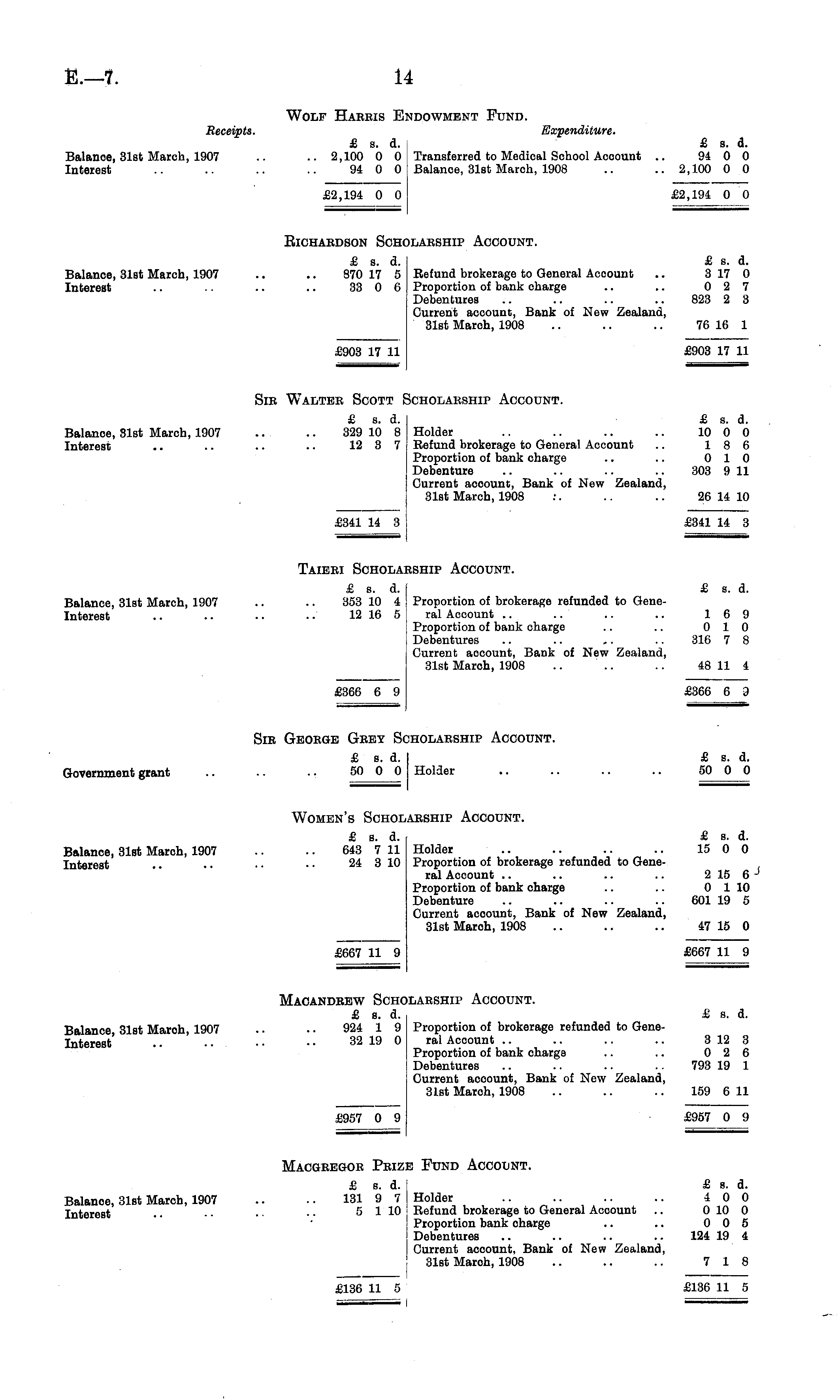 Wolf Haeeis Endowment Fund. Receipts. Expenditure. £ s. d. £ s. a. Balance, 31st March, 1907 .. .. 2,100 0 0 Transferred to Medical School Account .. 94 0 0 Interest .. .. .. .. 94 0 0 Balance, 31st March, 1908 .. .. 2,100 0 0 £2,194 0 0 £2,194 0 0 EICHAEDSON SCHOLAESHIP ACCOUNT. £ s. d. £ s. d. Balance, 31st March, 1907 .. .. 870 17 5 Refund brokerage to General Account .. 317 0 Interest .. .. .. .. 33 0 6 Proportion of bank charge .. .. 0 2 7 Debentures .. .. .. .. 823 2 3 Current account, Bank of New Zealand, 31st March, 1908 .. .. .. 76 16 1 £903 17 11 £903 17 11 Sic Walter Scott Scholarship Account. £ s. d. £ s. d. Balance, 31st March, 1907 .. .. 329 10 8 Holder .. .. .. .. 10 0 0 Interest .. .. .. .. 12 3 7 Refund brokerage to General Account .. 18 6 Proportion of bank charge .. .. 0 10 Debenture .. .. .. .. 303 9 11 Current account, Bank of New Zealand, 31st March, 1908 .'. .. .. 26 14 10 £341 14 3 £341 14 3 Taibei Scholaeship Account. £ s. d. £ s. d. Balance, 31st March, 1907 .. .. 353 10 4 Proportion of brokerage refunded to GeneInterest .. .. •. • • 12 16 5 ral Account .. .. .. .. 169 Proportion of bank charge .. .. 0 10 Debentures .. .. ~ .. 316 7 8 Current aocount, Bank of New Zealand, 31st Maroh, 1908 .. .. .. 48 11 4 £366 6 9 £366 6 9 Sic Geobge Grey Scholaeship Account. £ s. a. £ s. d. Government grant .. .. .. 50 0 0 Holder .. .. .. .. 50 0 0 Women's Scholaeship Account. £ s. d. £ s. d. Balance, 31st Maroh, 1907 .. .. 643 711 Holder .. .. .. .. 15 0 0 Interest .. . • • • • • 24 310 Proportion of brokerage refunded to General Account .. .. .. .. 2 15 6 J Proportion of bank charge .. .. 0 1 10 Debenture .. .. .. .. 601 19 5 Current account, Bank of New Zealand, 31st Maroh, 1908 .. .. .. 47 15 0 £667 11 9 £667 11 9 Macandeew Scholaeship Account. £ s. d. £ s. d. Balance 31st Maroh, 1907 .. • • 924 1 9 Proportion of brokerage refunded to GeneInterest .. .. • • • • 32 19 0 ralAccount .. .. .. .. 312 3 Proportion of bank charge .. .. 0 2 6 Debentures .. .. .. .. 793 19 1 Current account, Bank of New Zealand, 31st March, 1908 .. .. .. 159 6 11 £957 0 9 £957 0 9 Macgbegob Peize Fund Account. £ s. d. I £ s. a. Balanoe, 31st March, 1907 .. .. 131 97 ! Holder .. .. .. .. 40 0 Interest .. • • • • ■ 5 110 Refund brokerage to General Acoount .. 010 0 ! Proportion bank charge .. .. 0 0 5 Debentures .. .. .. .. 124 19 4 Current account, Bank of New Zealand, 31st Maroh, 1908 .. .. .. 7 18 I £136 11 5 £136 11 5