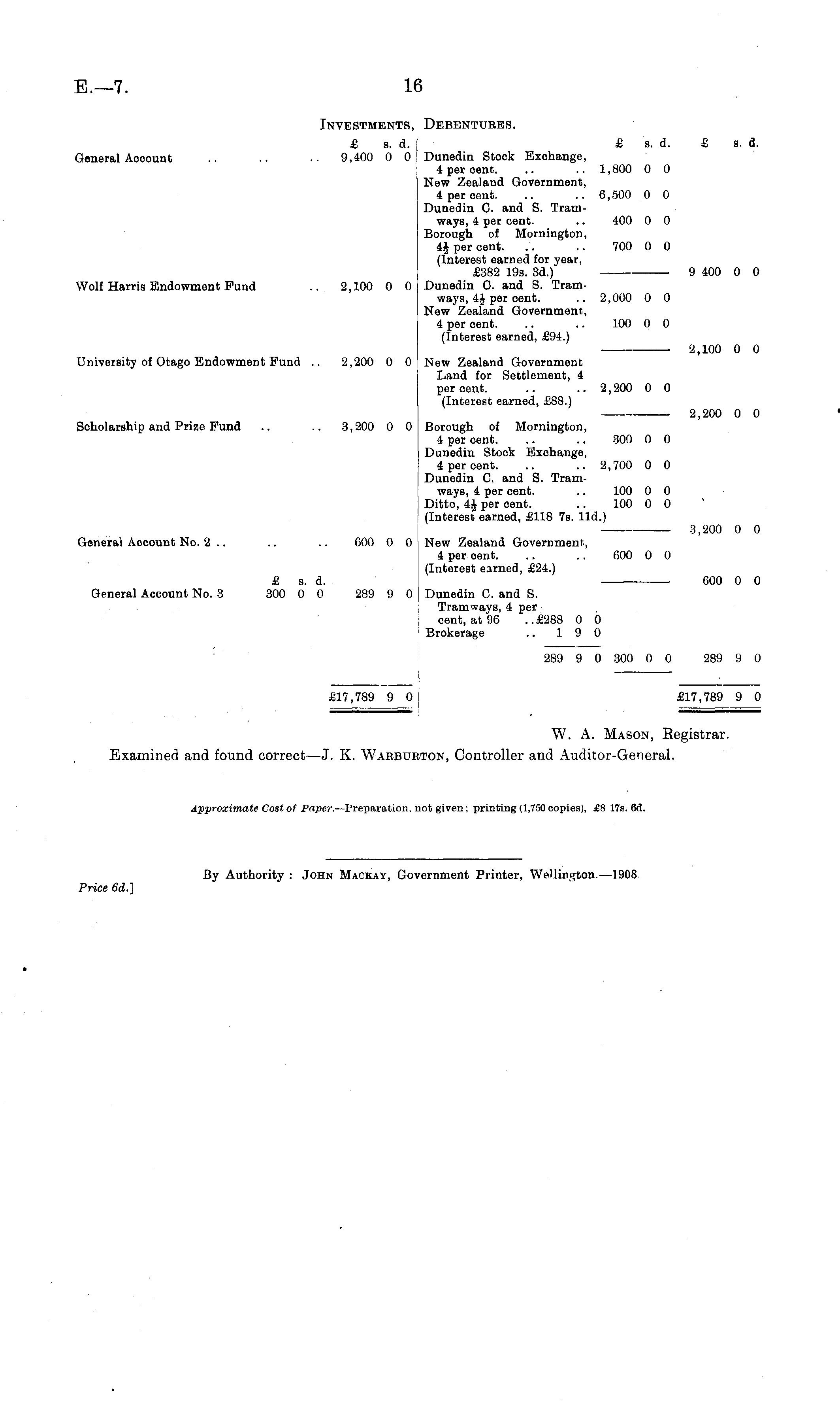 Investments, Debentures. £ s. d. £ s. d. £ a. d. General Aooount .. .. .. 9,400 0 0 Dunedin Stock Exchange, 4 per cent. .. .. 1,800 0 0 New Zealand Government, 4 per oenfc. .. .. 6,500 0 0 Dunedin C. and S. Tramways, 4 per cent. .. 400 0 0 Borough of Mornington, 4J per cent. .. .. 700 0 0 (Interest earned for year, £382 19s. 3d.) 9 400 0 0 Wolf Harris Endowment Fund .. 2,100 0 0 , Dunedin 0. and S. Tramways, 4J per cent. .. 2,000 0 0 New Zealand Government, 4 per cent. .. .. 100 0 0 (Interest earned, £94.) 2,100 0 0 University of Otago Endowment Fund .. 2,200 0 0 New Zealand Government Land for Settlement, 4 percent. .. .. 2,200 0 0 (Interest earned, £88.) — 2,200 0 0 Scholarship and Prize Fund .. .. 3,200 0 0 Borough of Mornington, 4 per cent. .. .. 300 0 0 Dunedin Stock Exchange, 4 per cent. .. .. 2,700 0 0 Dunedin C. and S. Tramways, 4 per cent. .. 100 0 0 Ditto, 4£ per cent. .. 100 0 0 (Interest earned, £118 7s. lid.) 3,200 0 0 General Aocount No. 2 .. .. .. 600 0 0 New Zealand Government, 4 per cent. .. .. 600 0 0 (Interest earned, £24.) £ s. d. ■ 600 0 0 General Account No. 3 300 0 0 289 9 0 Dunedin C. and S. Tramways, 4 per cent, at 96 ..£2BB 0 0 Brokerage .. 19 0 289 9 0 300 0 0 289 9 0 £17,789 9 0 [ £17,789 9 0 W. A. Mason, Registrar. Examined and found correct — J. K. Warbueton, Controller and Auditor-General.