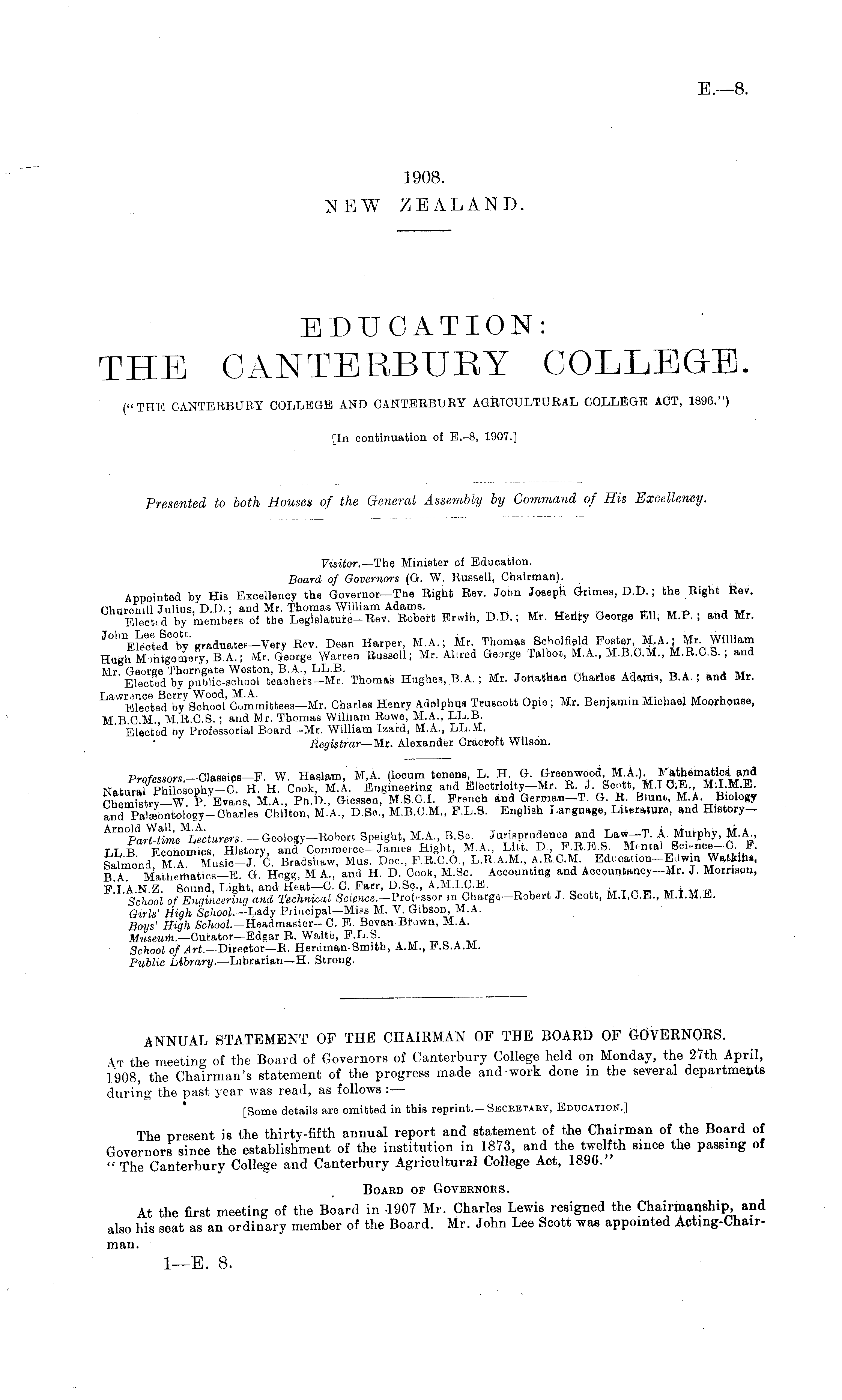 ANNUAL STATEMENT OF THE CHAIRMAN OF THE BOARD OF GOVERNORS. At the meeting of the Board of Governors of Canterbury College held on Monday, the 27th April, 1908, the Chairman's statement of the progress made and-work done in the several departments during the past year was read, as follows : — [Some details are omitted in this reprint.—Secretary, Education.] The present is the thirty-fifth annual report and statement of the Chairman of the Board of Governors since the establishment of the institution in 1873, and the twelfth since the passing of " The Canterbury College and Canterbury Agricultural College Act, 1896." Board op Governors. At the first meeting of the Board in 1907 Mr. Charles Lewis resigned the Chairmanship, and also his seat as an ordinary member of the Board. Mr. John Lee Scott was appointed Acting-Chair-man.