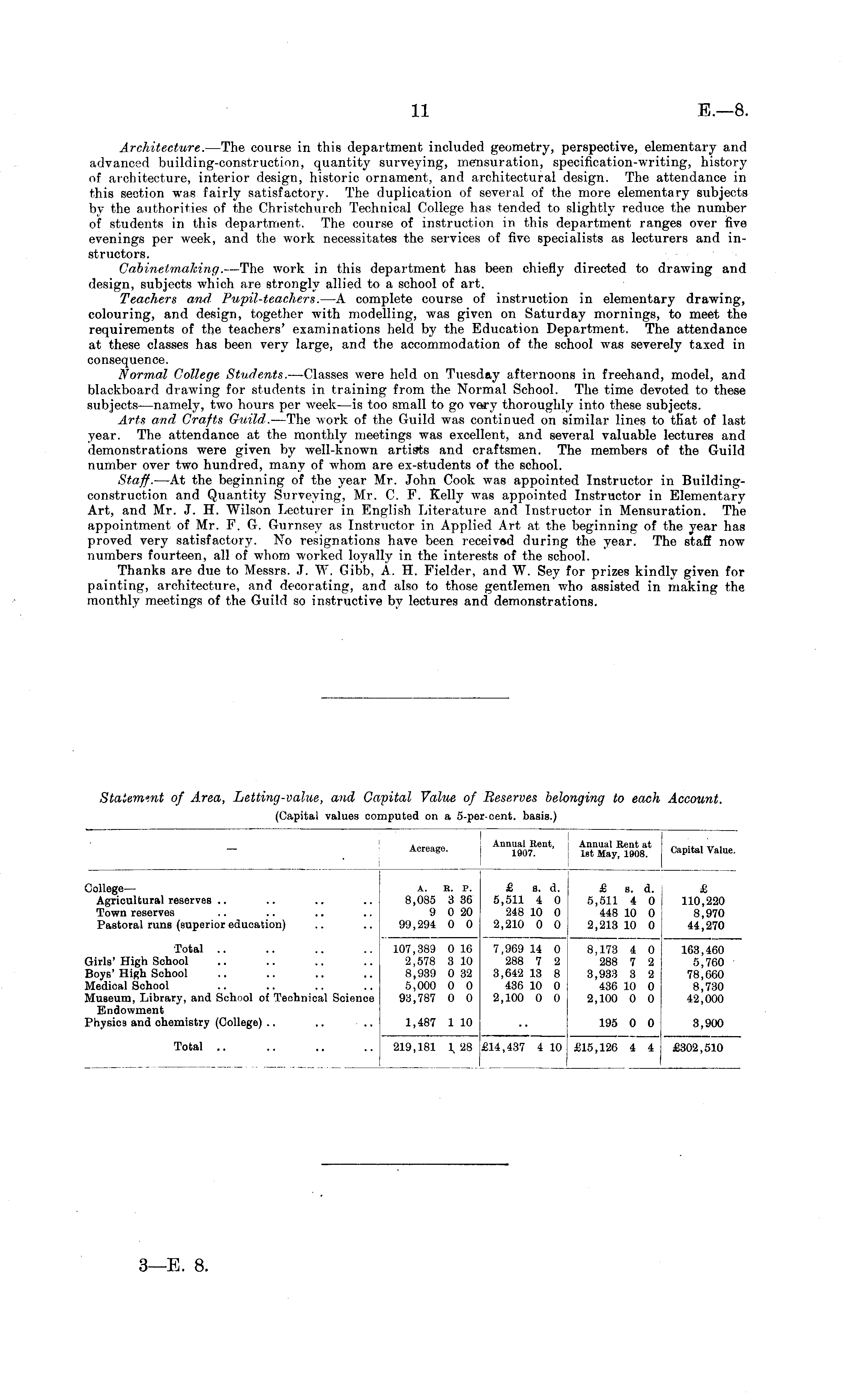 Architecture. —The course in this department included geometry, perspective, elementary and advanced building-construction, quantity surveying, mensuration, specification-writing, history of architecture, interior design, historic ornament, and architectural design. The attendance in this section was fairly satisfactory. The duplication of several of the more elementary subjects by the authorities of the Christchurch Technical College has tended to slightly reduce the number of students in this department. The course of instruction in this department ranges over five evenings per week, and the work necessitates the services of five specialists as lecturers and instructors. Oabinetmaking. —The work in this department has been chiefly directed to drawing and design, subjects which are strongly allied to a school of art. Teachers and Pupil-teachers. —A complete course of instruction in elementary drawing, colouring, and design, together with modelling, was given on Saturday mornings, to meet the requirements of the teachers' examinations held by the Education Department. The attendance at these classes has been very large, and the accommodation of the school was severely taxed in consequence. Normal College Students. —Classes were held on Tuesday afternoons in freehand, model, and blackboard drawing for students in training from the Normal School. The time devoted to these subjects—namely, two hours per week—is too small to go vary thoroughly into these subjects. Arts and, Crafts Guild. —The work of the Guild was continued on similar lines to tKat of last year. The attendance at the monthly meetings was excellent, and several valuable lectures and demonstrations were given by well-known artists and craftsmen. The members of the Guild number over two hundred, many of whom are ex-students of the school. Staff. —At the beginning of the year Mr. John Cook was appointed Instructor in Buildingconstruction and Quantity Surveying, Mr. C. F. Kelly was appointed Instructor in Elementary Art, and Mr. J. H. Wilson Lecturer in English Literature and Instructor in Mensuration. The appointment of Mr. F. G. Gurnsey as Instructor in Applied Art at the beginning of the year has proved very satisfactory. No resignations have been received during the year. The staff now numbers fourteen, all of whom worked loyally in the interests of the school. Thanks are due to Messrs. J. W. Gibb, A. H. Fielder, and W. Sey for prizes kindly given for painting, architecture, and decorating, and also to those gentlemen who assisted in making the monthly meetings of the Guild so instructive by lectures and demonstrations.