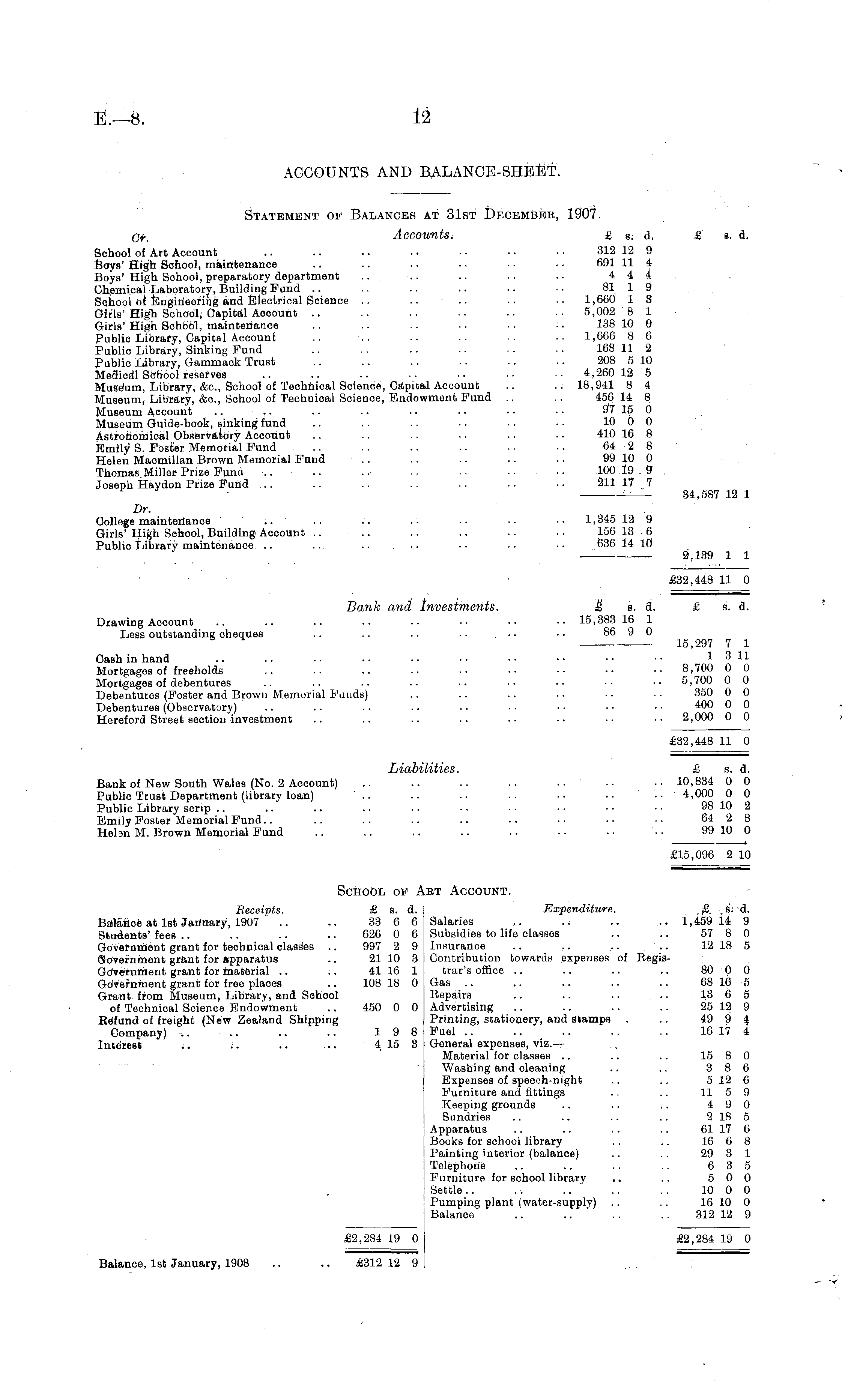 Statement or Balances at 31st December, 1907. Or, Accounts. £ s. d. £ s. d. School of Art Account .. .. .. • • • ■ • • • • 312 12 9 Boys' High School, maintenance .. .. .. .. • ■ • • 691 11 4 Boys' High School, preparatory department .. .. .. .. .. 444. Chemical Laboratory, Building Fund .. .. .. .. •. ■ • 81 1 9 School of Engineering and Electrical Science .. .. .. .. .. 1,660 1 3 Girls' High School, Capital Account .. .. .. .. .. •■ 5,002 8 1 Girls' High School, maintenance .. .. .. .. .. •• 138 10 0 Publio Library, Capital Account .. .. .. ■• ■• •• 1,666 8 6 Public Library, Sinking Fund .. .. .. .. . . • ■ 168 11 2 Public Library, Gammack Trust .. .. .. .. .. .. 208 510 Medical School reserves .. .. .. .. .. ■• •• 4,260 12 5 Museum, Library, &c, School of Technical Science, Capital Account .. .. 18,941 8 4 Museum, Library, &c, School of Technical Science, Endowment Fund .. .. 456 14 8 Museum Account .. .. .. .. ■. •. • • • • 97 15 0 Museum Guide-book, sinking fund .. .. .. .. .. .. 10 0 0 Astronomical Observatory Accouut .. .. . • ■ • • ■ 410 16 8 Emily S. Foster Memorial Fund .. .. .. .. •• •• 64 2 8 Helen Macmillan Brown Memorial Fund .. .. .. .. .. 99 10 0 Thomas Miller Prize Fund .. .. .. • ■ • ■ ■ • 100 19 9 Joseph Haydon Prize Fund .. .. .. .. .. . • ■. 211 17 7 34,587 12 1 Dr. College maintenance .. .. .. .". .. ■• •• 1,345 12 9 Girls' High School, Building Account .. - .. .. .. .. .. 156 13 6 Public Library maintenance .. .. .. . ... ■• •• •• 636 14 10 2,139 1 1 £32,448 11 0 Bank and Investments. £ s. d. £ s. d. Drawing Account .. .. .. .. •■ •• •• •• 15,383 16 1 Less outstanding cheques .. .. .. .. ... • • 86 9 0 t5,297 7 1 Cash in hand .. .. •■ •• •• •• •• •■ •• •■ 1311 Mortgages of freeholds .. .. .. .. .. •• •• •• •• 8,700 0 0 Mortgages of debentures .. .. .. .. •• •• •• •• •• 5,700 0 0 Debentures (Foster and Brown Memorial Funds) .. .. .. .. .. ■ ■ 350 0 0 Debentures (Observatory) .. .. .. .. .. .. . • • • • • 400 0 0 Hereford Street section investment .. .. .. •• .. •• •■ •• 2,000 0 0 £32,448 11 0 Liabilities. £ s. d. Bank of New South Wales (No. 2 Account) .. .. .. .. .. •• .. 10,834 0 0 Public Trust Department (library loan) ' .. .. .. .. ■• •• ■• 4,000 0 0 Public Library scrip .. .. .. .. .. •. •••• • • ■ • 98 10 2 Emily Foster Memorial Fund.. .. .. .. .. .. •■ •■ •• 64 2 8 Hebn M. Brown Memorial Fund .. .. .. .. .. .. •■ ■■ 99 10 0 1. £15,096 2 10 School of Art Account. Receipts. £ s. d. Expenditure. £ s. d. Balance at Ist January, 1907 .. .. 33 6 6 Salaries .. .. .. .. 1,459 14 9 Students' fees .. .. .. .. 620 0 6 Subsidies to life classes .. .. 57 8 0 Government grant for technical classes .. 997 2 9 Insurance .. .. .. .. 12 18 5 Government grant for apparatus .. 21 10 3 i Contribution towards expenses of RegisGovernment grant for material .. .. 41 16 1 trar's office .. .. .. .. 80 0 0 Government grant for free places .. 108 18 0 Gas .. .. .. .. .. 68 16 5 Grant from Museum, Library, and School Repairs .. .. .. .. 13 6 5 of Technical Science Endowment .. 450 0 0 Advertising .. .. .. .. 25 12 9 Refund of freight (New Zealand Shipping Printing, stationery, and stamps .. 49 9 4 Company) .. .. .. .. 19 8 Fuel .. .. .. .. .. 16 17 4 Interest .. .. .. .. 4 15 3 General expenses, viz.— Material for classes .. .. .. 15 8 0 Washing and cleaning .. .. 3 8 6 Expenses of speech-night .. .. 5 12 6 Furniture and fittings .. .. 11 5 9 Keeping grounds .. .. .. 4 9 0 Sundries .. .. .. .. 2 18 5 Apparatus .. .. .. .. 61 17 6 Books for school library .. .. 16 6 8 I Painting interior (balance) .. .. 29 3 1 Telephone .. .. .. .. 6 3 5 Furniture for school library .. .. 5 0 0 Settle.. .. .. .. .. 10 0 0 Pumping plant (water-supply) .. .. 16 10 0 Balance .. .. .. .. 312 12 9 £2,284 19 0 £2,284 19 0 Balance, Ist January, 1908 .. .. £312 12 9
