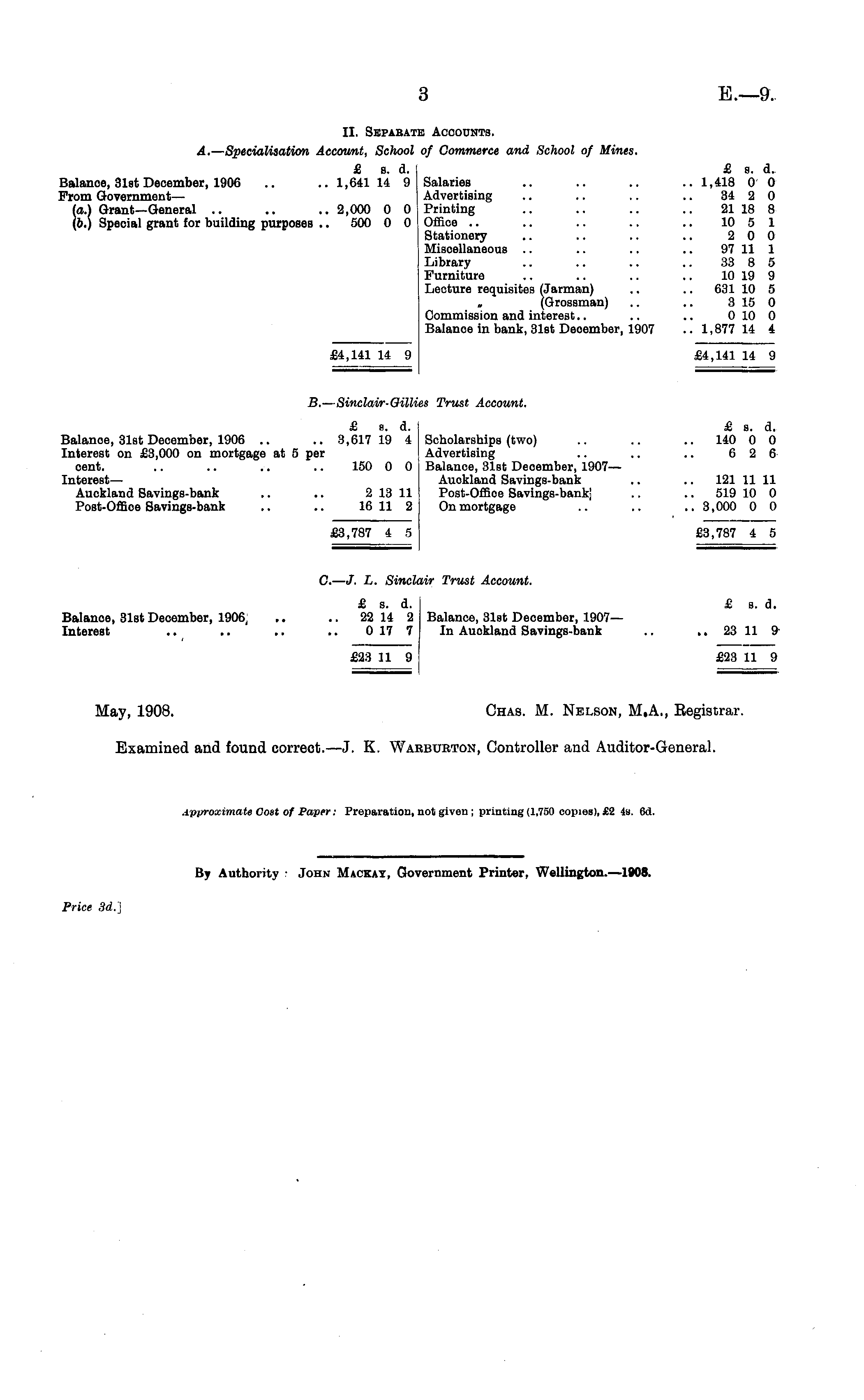 11. Separate Accounts. A. — Specialisation Account, School of Commerce and School of Mines. £ a. d. £ s. d. Balanoe, 31st December, 1906 .. .. 1,64114 9 Salaries .. .. .. .. 1,418 0 0 From Government — Advertising .. .. .. .. 34 2 0 [a.) Grant—General .. .. .. 2,000 0 0 Printing .. .. .. .. 21 18 8 (6.) Special grant for building purposes .. 500 0 0 Office .. .. .. .. .. 10 5 1 Stationery .. .. .. .. 2 0 0 Miscellaneous .. .. .. .. 97 11 1 Library .. .. .. .. 33 8 5 Furniture .. .. .. .. 10 19 9 Lecture requisites (Jarman) .. .. 631 10 5 „ (Grossman) .. .. 315 0 Commission and interest.. .. .. 0 10 0 Balance in bank, 31at Deoember, 1907 .. 1,877 14 4 £4,141 14 9 £4,141 14 9 B. — Sinclair-Gillies Trust Account. £ s. d. £ s. d. Balanoe, 31st December, 1906 .. .. 3,617 19 4 Scholarships (two) .. .. .. 140 0 0 Interest on £3,000 on mortgage at 5 per Advertising .. .. .. 6 2 6 oent. .. .. .. .. 150 0 0 Balance, 31st Deoember, 1907— Interest — Auokland Savings-bank .. .. 121 11 11 Auckland Savings-bank .. .. 2 13 11 Post-Ofißoe Savings-bank] .. .. 519 10 0 Post-Ofßoe Savings-bank .. .. 16 11 2 On mortgage .. .. .. 3,000 0 0 £3,787 4 5 £3,787 4 5 C.—/. L. Sinclair Trust Account. £ s. d. £ s. d. Balanoe, 31st December, 1906, .. .. 22 14 2 Balance, 31st December, 1907— Interest .. .. .. .. 017 7 In Auokland Savings-bank .. .. 23 11 9 £23 11 9 £23 11 9 May, 1908. Chas. M. Nelson, M.A., Registrar. Examined and found correct.—J. K. Waebueton, Controller and Auditor-General.