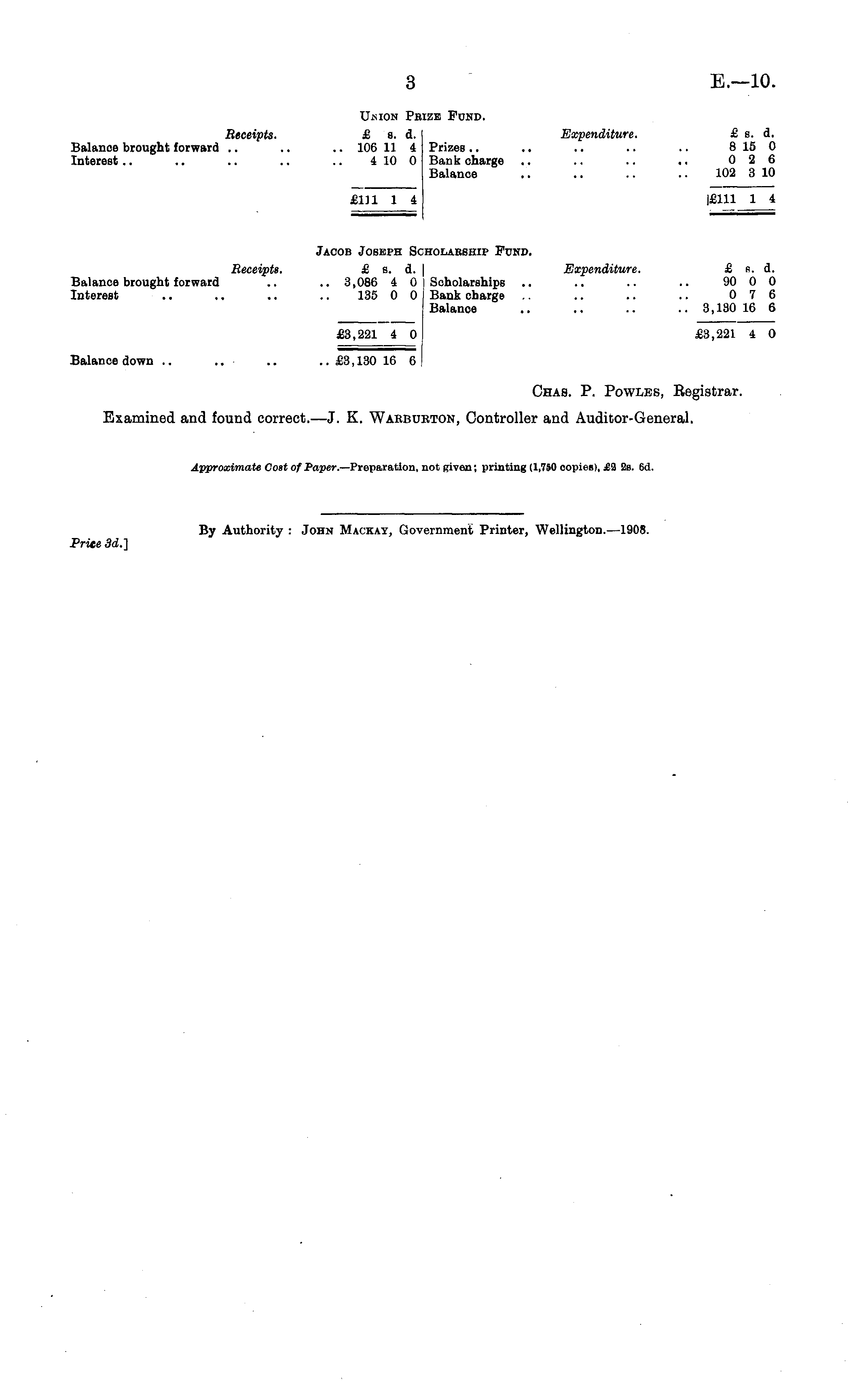Umon Pbize Fdnd. Receipts. £ s. d. Expenditure. £ s. d. Balance brought forward .. .. .. 106 11 4 Prizes .. .. .. .. .. 8 15 0 Interest.. .. .. .. .. 4 10 0 Bank charge .. .. .. .. 0 2 6 Balance .. .. .. .. 102 3 10 £1U 1 4 |£111 1 4 Jacob Joseph Scholabship Fund. Receipts. £ s. d. | Expenditure. £ s. d. Balance brought forward .. .. 3,086 i 0 Scholarships .. .. .. .. 90 0 0 Interest .. .. .. .. 135 0 0 Bank charge .. .. .. .. 0 7 6 Balance .. .. .. .. 3,130 16 6 £3,221 4 0 £3,221 4 0 Balance down .. .. .. ..£3,130 16 6 Chas. P. Powles, Eegistrar. Examined and found correct.— J. K. Warbukton, Controller and Auditor-General.