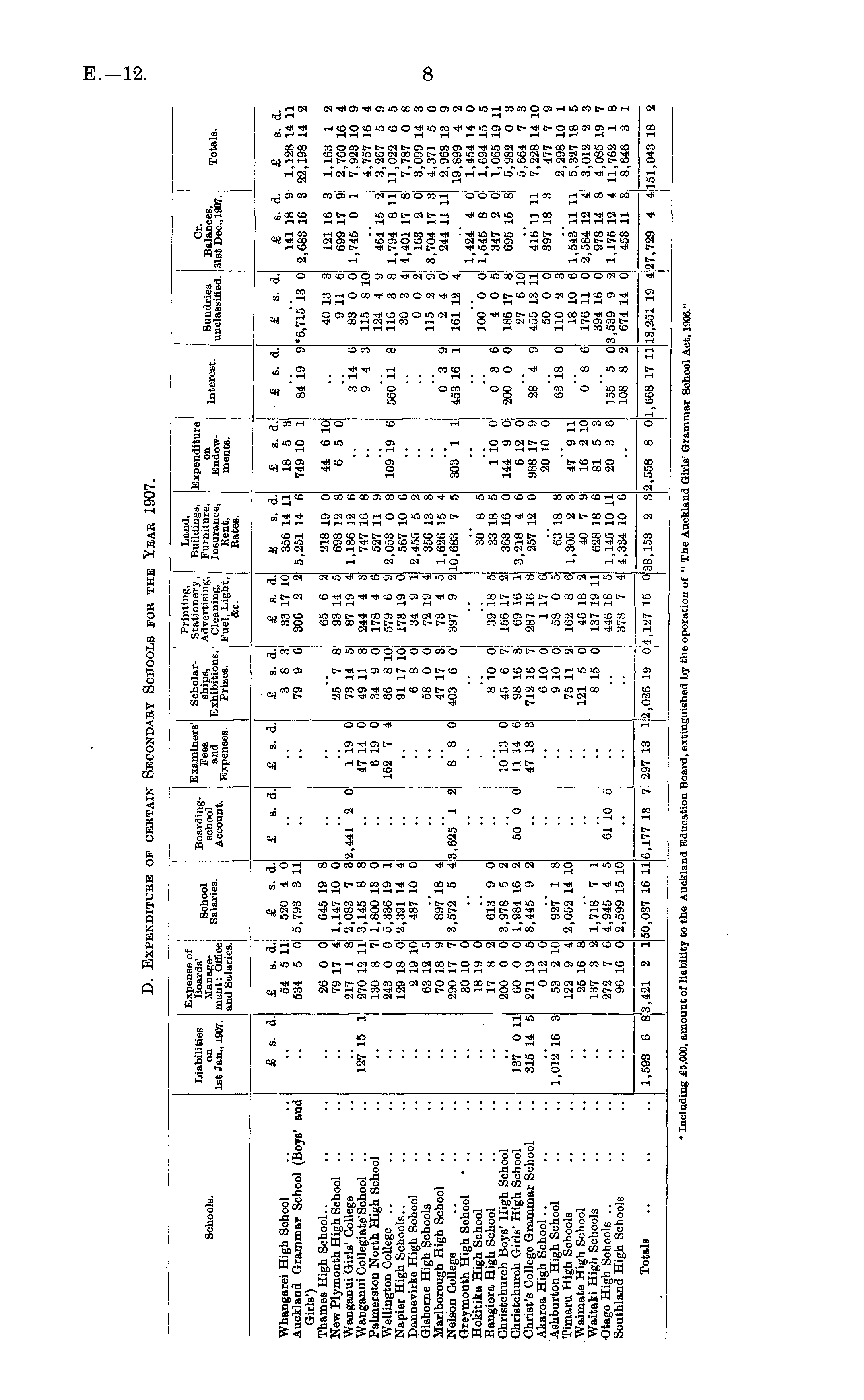 Printing, Stationery, Advertising, Cleaning, Fuel, Light, &c. Land, Buildings, Furniture, Insurance, Rent, Rates. Expenditure I Endow- j Interest, ments. I Schools. Liabilities on 1st Jan., 1907. Expense of Boards' Management: Office and Salaries. School Salaries. Boardingschool Account. Examiners' Fees and Expenses. Scholarships, Exhibitions, Prizes. Cr. Sundries Balances, unclassified. 31st Dec, 1907. Totals. £ s. d. £ 8. d. 54 5 11 534 5 0 £ s. d. 520 4 0 5,793 3 11 £ s. a. £ s. a. £ s. a. £ s. d. 3 8 3 33 17 10 79 9 6 306 2 2 £ s. d. 356 14 11 5,251 14 6 £ s. a. 18 5 3 749 10 1 £ s. a. £ s. a. £ s. a. 141 18 9 2,683 16 3 £ s. a. 1,128 14 11 22,198 14 S Whangarei High School Auckland Grammar School (Boys' and Girls') Thames High School.. New Plymouth High School Wanganui Girls' College Wanganui Collegiate' School .. Palmerston North High School Wellington College Napier High Schools.. Dannevirke High School Gisborne High Schools Marlborough High School Nelson College Greymouth High School ' .. Hokitika High School Rangiora High School Christohurch Boys' High School Christohurch Girls' High School Christ's College Grammar School Akaroa High School Ashburton High School Timaru High Schools Waimate High School Waitaki High Schools Otago High Schools .. Southland High Schools 127 15 1 I 26 0 0 79 17 4 217 1 8 270 12 ll 1 130 8 7! 243 0 0 129 18 0 2 19 10 63 12 5 70 18 9 290 17 7 30 10 0 18 19 0 17 8 2 200 0 0 60 0 0 271 19 5 0 12 0 53 2 10 122 9 4 25 16 8 137 3 2 272 7 6 96 16 0 645 19 8 1,147 10 0 2,083 7 3 3,145 8 8 1,800 13 0 5,336 19 1 2,391 14 4 437 10 0 897' 18 4 3,572 5 4 2,441 2 0 3,625 "l 2 1 19 0 47 14 0 6 19 0 162 7 4 8 "8 0 65 6 2 25 7 8 93 14 5 73 14 5 87 19 4 49 11 8 244 4 3 34 9 0 178 4 6 66 8 10 579 6 9 91 17 10 173 19 0 6 8 0 34 9 1 58 0 0 72 19 4 47 17 3 73 4 5 403 6 0 397 9 2 218 19 0 698 12 8 1,186 12 6 747 16 8 527 11 9 2,053 0 8 567 10 6 2,455 5 2 356 13 3 1,626 15 4 10,683 7 5 44 6 10 6 5 0 109 19 6 303 "l 1 84i9 9 3 14 6 9 4 3 560 il 8 0 "3 9 453 16 1 *6,715 "l3 0 40 13 3 9 11 6 83 0 0 115 8 10 124 4 9 116 3 8 30 3 4 0 0 2 115 2 9 2 4 0 161 12 4 121 16 3 699 17 9 1,745 0 1 464 15 2 1,794 8 11 4,401 17 8 163 2 0 3,704 17 3 244 11 11 1,424 4 0 1,545 8 0 347 2 0 695 15 8 1,163 1 2 2,760 16 4 7,923 10 £ 4,757 16 4 3,267 5 £ 11,022 6 £ 7,787 0 c 3,099 14 £ 4,371 5 C 2,963 13 £ 19,899 4 S 1,454 14 C 1,694 15 £ 1,065 19 11 5,982 0 i 5,664 7 £ 7,228 14 1C 477 7 £ 2,298 10 1 5,327 18 £ 3,012 2 £ 4,085 19 7 11,762 1 i 8,646 3 1 •• \ 137 0 11 315 14 5 613 9 0 3,978 5 2 1,984 16 2 3,445 9 2 50 0 0 10 13 0 11 14 6 47 18 3 8 10 0 ! 39 18 5 45 6 7 156 17 2 98 16 3' 69 16 1 712 16 7 i 287 16 8 6 10 0| 1 17 6 9 10 0: 58 0 5 75 11 2 162 8 6 121 5 0, 46 18 2 8 15 Oi 137 19 11 446 18 5 1 378 7 4 30 8 5 33 18 5 363 16 0 3,218 4 6 257 12 0 1 10 0 144 9 0 6 12 0 988 17 9 20 10 0 03 6 200 0 0 100 0 0 4 0 5 186 17 8 27 6 10 455 13 11 50 0 0 110 2 3 18 10 6 176 11 0 394 16 0 3,539 9 2 674 14 0 28 "4 9 41611 11 397 18 3 1,01216 3 927' 1 8 2,052 14 10 63 18 8 1,305 2 3 40 7 9 628 18 6 1,145 10 11 4,334 10 6 63i8 0 1,718 7 1 4,945 4 5 2,599 15 10 •• 47 9 11 16 2 10 81 5 3 20 3 6 0 "*8 6 1,543 11 11 2,584 12 4 978 14 8 1,175 12 4 453 11 3 6l'io 5 155"5 0 108 8 2 •• Totals 1,593 6 8 3,421 2 1 50,037 16 11 6,177 13 7 ■ 297 13 1 2,026 19 0 4,127 15 0 38,153 2 3 2,558 8 0 1,668 17 11 13,251 19 4 27,729 4 4 151,043 18 * Including £5,000, amount of liability to the Auckland Education Board, extinguished by the operation of " The Auckland Girls' Grammar School Act, L"