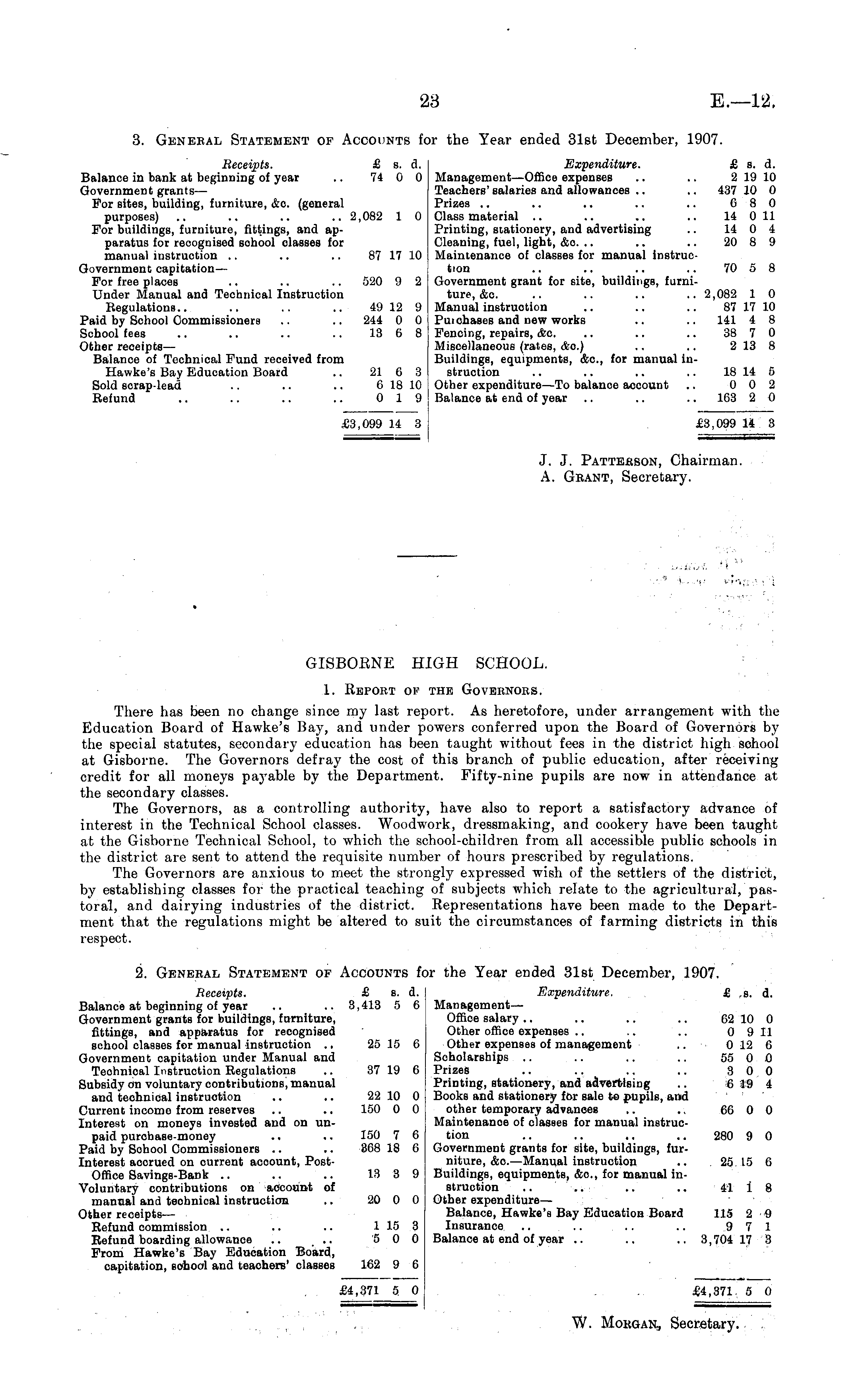 GISBOENE HIGH SCHOOL. 1. Report op the Governors. There has been no change since my last report. As heretofore, under arrangement with the Education Board of Hawke's Bay, and under powers conferred upon the Board of Governors by the special statutes, secondary education has been taught without fees in the district high school at Gisborne. The Governors defray the cost of this branch of public education, after receiving credit for all moneys payable by the Department. Fifty-nine pupils are now in attendance at the secondary classes. The Governors, as a controlling authority, have also to report a satisfactory advance of interest in the Technical School classes. Woodwork, dressmaking, and cookery have been taught at the Gisborne Technical School, to which the school-children from all accessible public schools in the district are sent to attend the requisite number of hours prescribed by regulations. The Governors are anxious to meet the strongly expressed wish of the settlers of the district, by establishing classes for the practical teaching of subjects which relate to the agricultural, pastoral, and dairying industries of the district. Representations have been made to the Department that the regulations might be altered to suit the circumstances of farming districts in this respect. 2. General Statement op Accounts for the Year ended 31st December, 1907. Receipts. £ s. d. Expenditure. £ s. d. Balance at beginning of year .. .. 3,413 5 6 Management— Government grants for buildings, furniture, Office salary .. .. .. .. 62 10 0 fittings, and apparatus for recognised Other office expenses .. .. .. 0 9 11 school classes for manual instruction .. 25 15 6 Other expenses of management .. 0 12 6 Government capitation under Manual and Scholarships .. .. .. .. 55 0 0 Technical Instruction Regulations .. 37 19 6 Prizes .. .. .. .. 3 0 0 Subsidy on voluntary contributions, manual Printing, stationery, and advertising .. 6 19 4 and technical instruction .. .. 22 10 0 Books and stationery for sale to pupils, and Current income from reserves .. .. 150 0 0 other temporary advances .. .. 66 0 0 Interest on moneys invested and on un- Maintenance of classes for manual instrucpaid purobase-money .. .. 150 7 6 tion .. .. .. .. 280 9 0 Paid by Sohool Commissioners .. .. 368 18 6 Government grants for site, buildings, furInterest accrued on ourrent acoount, Post- niture, &c.—Manual instruction .. 25 15 6 Office Savings-BaDk .. .. .. 13 3 9 Buildings, equipments, &c, for manual inVoluntary contributions on account of struction .. .. .. .. 41 1 8 manual and technical instruction .. 20 0 0 Other expenditure— Other receipts— Balance, Hawke's Bay Education Board 115 2 9 Refund commission .. .. .. 1 15 3 Insurance .. .. .. .. 9 7 1 Refund boarding allowance .. .. 5 0 0 Balance at end of year .. .. .. 3,704 17 3 From Hawke's Bay Education Board, capitation, sohool and teachers' classes 162 9 6 £4,371 5 0 £4,371 5 0 W. Morgan., Secretary.