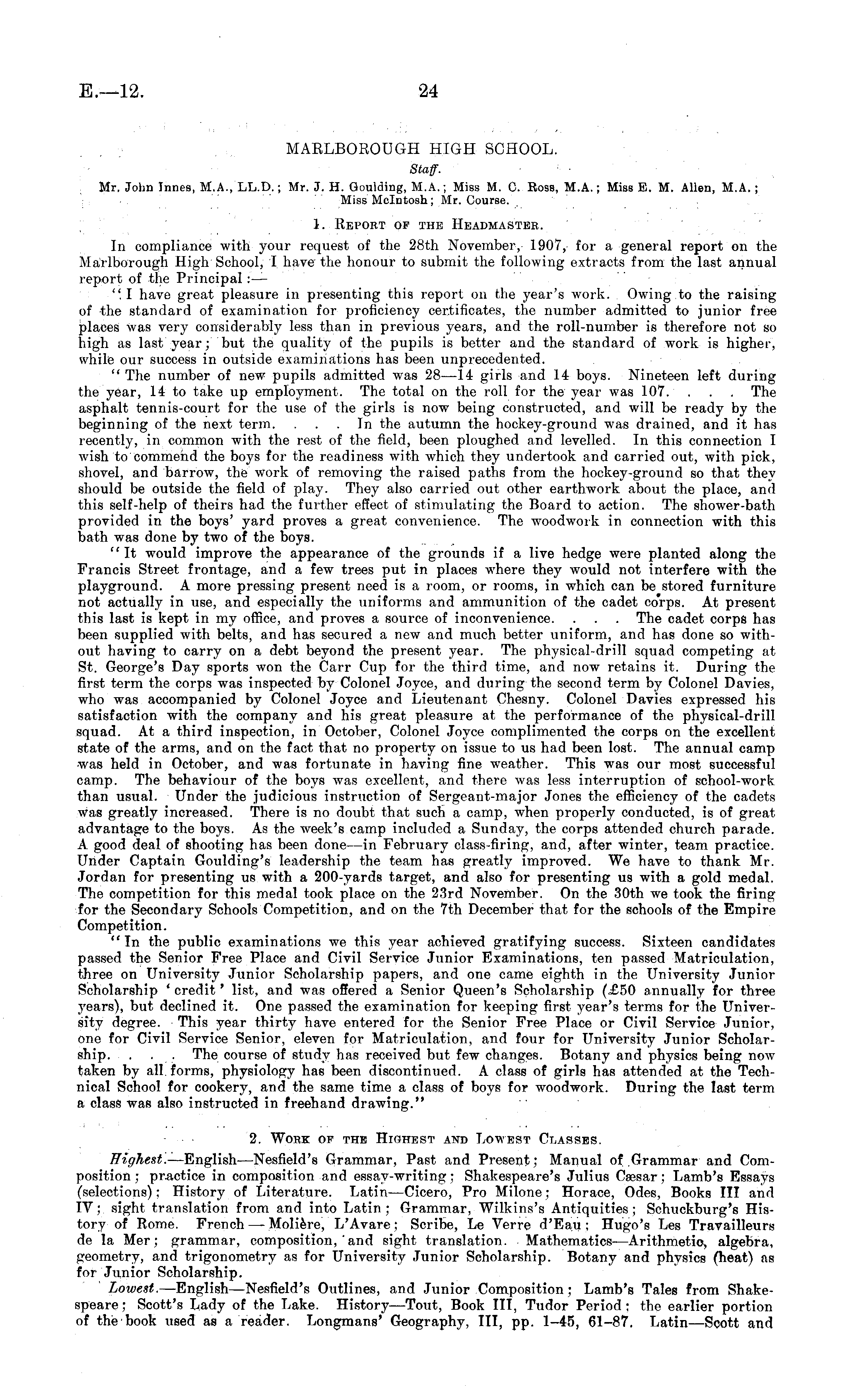 MAELBOROUGH HIGH SCHOOL. Staff. Mr. John Innes, M.A., LL.D.; Mr. J. H. Goulding, M.A.; Miss M. C. Ross, M.A.; Miss E. M. Allen, M.A.; Miss Mclntosh ; Mr. Course. 1. Report of the Headmasteh. In compliance with your request of the 28th November, 1907, for a general report on the Marlborough High School, I have the honour to submit the following extracts from the last annual report of the Principal :—- -".I have great pleasure in presenting this report on the year's work. Owing to the raising of the standard of examination for proficiency certificates, the number admitted to junior free places was very considerably less than in previous years, and the roll-number is therefore not so high as last year; but the quality of the pupils is better and the standard of work is higher, while our success in outside examinations has been unprecedented. " The number of new pupils admitted was 28—14 girls and 14 boys. Nineteen left during the year, 14 to take up employment. The total on the roll for the year was 107. . . . The asphalt tennis-court for the use of the girls is now being constructed, and will be ready by the beginning of the next term. ... In the autumn the hockey-ground was drained, and it has recently, in common with the rest of the field, been ploughed and levelled. In this connection I wish to commend the boys for the readiness with which they undertook and carried out, with pick, shovel, and barrow, the work of removing the raised paths from the hockey-ground so that they should be outside the field of play. They also carried out other earthwork about the place, and this self-help of theirs had the further effect of stimulating the Board to action. The shower-bath provided in the boys' yard proves a great convenience. The woodwork in connection with this bath was done by two of the boys. " It would improve the appearance of the grounds if a live hedge were planted along the Francis Street frontage, and a few trees put in places where they would not interfere with the playground. A more pressing present need is a room, or rooms, in which can be stored furniture not actually in use, and especially the uniforms and ammunition of the cadet corps. At present this last is kept in my office, and proves a source of inconvenience. . . . The cadet corps has been supplied with belts, and has secured a new and much better uniform, and has done so without having to carry on a debt beyond the present year. The physical-drill squad competing at St. George's Day sports won the Carr Cup for the third time, and now retains it. During the first term the corps was inspected by Colonel Joyce, and during the second term by Colonel Davies, who was accompanied by Colonel Joyce and Lieutenant Chesny. Colonel Davies expressed his satisfaction with the company and his great pleasure at the performance of the physical-drill squad. At a third inspection, in October, Colonel Joyce complimented the corps on the excellent state of the arms, and on the fact that no property on issue to us had been lost. The annual camp was held in October, and was fortunate in having fine weather. This was our most successful camp. The behaviour of the boys was excellent, and there was less interruption of school-work than usual. Under the judicious instruction of Sergeant-major Jones the efficiency of the cadets was greatly increased. There is no doubt that such a camp, when properly conducted, is of great advantage to the boys. As the week's camp included a Sunday, the corps attended church parade. A good deal of shooting has been done—in February class-firing, and, after winter, team practice. Under Captain Goulding's leadership the team has greatly improved. We have to thank Mr. Jordan for presenting us with a 200-yards target, and also for presenting us with a gold medal. The competition for this medal took place on the 23rd November. On the 30th we took the firing for the Secondary Schools Competition, and on the 7th December that for the schools of the Empire Competition. "In the public examinations we this year achieved gratifying success. Sixteen candidates passed the Senior Free Place and Civil Service Junior Examinations, ten passed Matriculation, three on University Junior Scholarship papers, and one came eighth in the University Junior Scholarship ' credit ' list, and was offered a Senior Queen's Scholarship (£5O annually for three 3 r ears), but declined it. One passed the examination for keeping first year's terms for the University degree. This year thirty have entered for the Senior Free Place or Civil Service Junior, one for Civil Service Senior, eleven for Matriculation, and four for University Junior Scholarship. . . . The course of study has received but few changes. Botany and physics being now taken by all forms, physiology has been discontinued. A class of girls has attended at the Technical School for cookery, and the same time a class of boys for woodwork. During the last term a class was also instructed in freehand drawing." 2. Work op the Hiohest and Lowest Classes. Highest. —English—Nesfield's Grammar, Past and Present; Manual of Grammar and Composition ; practice in composition and essay-writing ; Shakespeare's Julius Caesar; Lamb's Essays (selections); History of Literature. Latin—Cicero, Pro Milone; Horace, Odes, Books 111 and IV; sight translation from and into Latin ; Grammar, Wilkins's Antiquities; Schuckburg's History of Rome. French — Moliere, L'Avare ; Scribe, Le Verre d'Eau ; Hugo's Les Travailleurs de la Mer; grammar, composition, ' and sight translation. Mathematics—Arithmetic, algebra, geometry, and trigonometry as for University Junior Scholarship. Botany and physics (heat) as for Junior Scholarship. Lowest. —English—Nesfield's Outlines, and Junior Composition; Lamb's Tales from Shakespeare ; Scott's Lady of the Lake. History—Tout, Book 111, Tudor Period ; the earlier portion of the book used as a reader. Longmans' Geography, 111, pp. 1-45, 61-87. Latin—Scott and