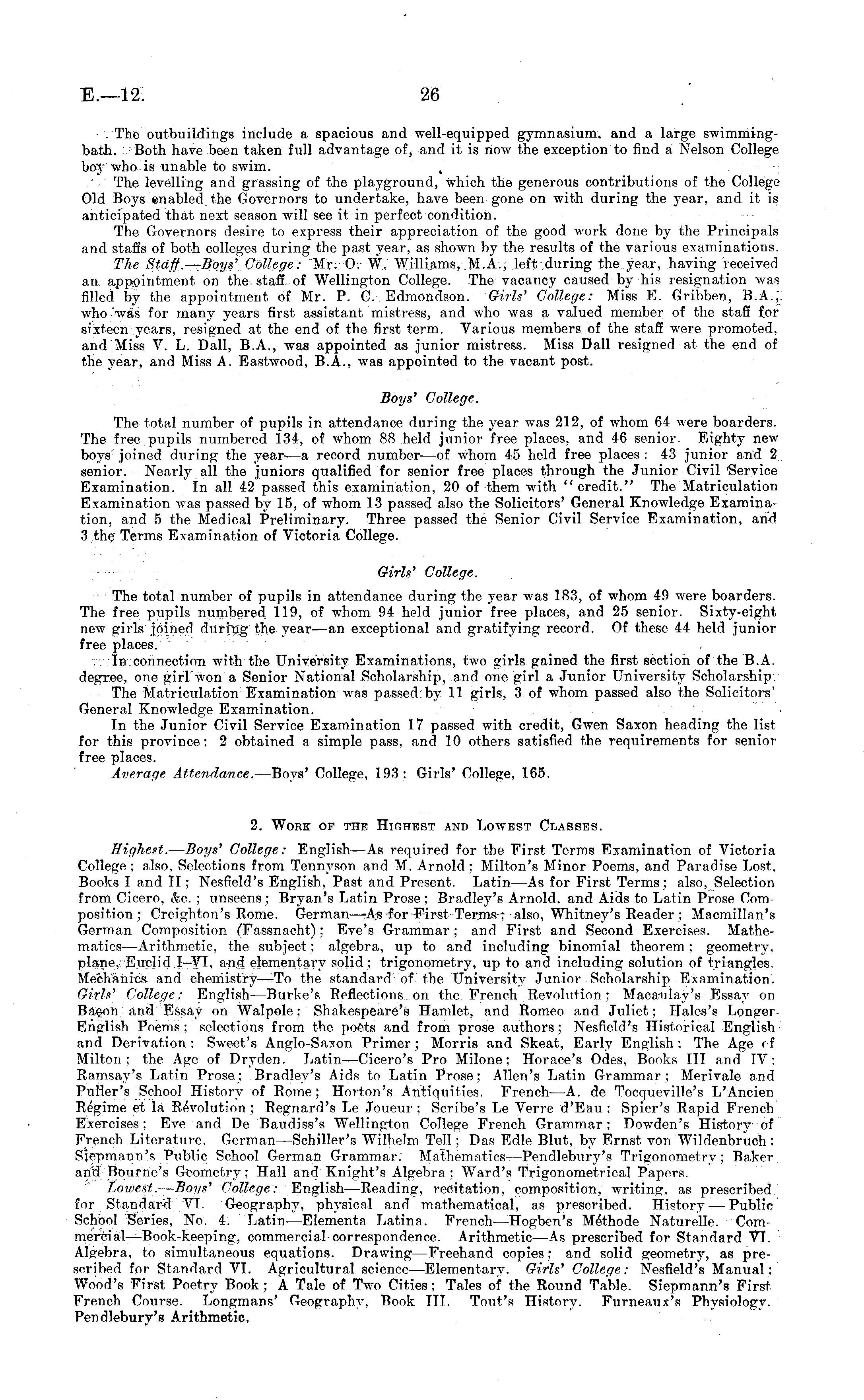 .The outbuildings include a spacious and well-equipped gymnasium, and a large swimmingbath. Both have been taken full advantage of, and it is now the exception to find a Nelson College boy who is unable to swim. , • The levelling and grassing of the playground, which the generous contributions of the College Old Boys enabled the Governors to undertake, have been gone on with during the year, and it is anticipated that next season will see it in perfect condition. The Governors desire to express their appreciation of the good work done by the Principals and staffs of both colleges during the past year, as shown by the results of the various examinations. The Staff. — rßoys , College: Mr; 0. W, Williams, M.A., left during the year, having received an appointment on the. staff of Wellington College. The vacancy caused by his resignation was filled by the appointment of Mr. P. C. Edmondson. Girls' College: Miss E. Gribben, 8.A.,'. who 'was for many years first assistant mistress, and who was a valued member of the staff for sixteen years, resigned at the end of the first term. Various members of the staff were promoted, and Miss V. L. Dall, 8.A., was appointed as junior mistress. Miss Dall resigned at the end of the year, and Miss A. Eastwood, 8.A., was appointed to the vacant post. Boys' College. The total number of pupils in attendance during the year was 212, of whom 64 were boarders. The free pupils numbered 134, of whom 88 held junior free places, and 46 senior. Eighty new boys' joined during the year—a record number—of whom 45 held free places : 43 junior and 2 senior. Nearly all the juniors qualified for senior free places through the Junior Civil Service Examination. In all 42 passed this examination, 20 of them with "credit." The Matriculation Examination was passed by 15, of whom 13 passed also the Solicitors' General Knowledge Examination, and 5 the Medical Preliminary. Three passed the Senior Civil Service Examination, and 3 the Terms Examination of Victoria College. Girls' College. The total number of pupils in attendance during the year was 183, of whom 49 were boarders. The free pupils numbered 119, of whom 94 held junior free places, and 25 senior. Sixty-eight new girls joined during the year —an exceptional and gratifying record. Of these 44 held junior free places. ;■. In connection with the University Examinations, two girls gained the first section of the B.A. degree, one girl won a Senior National Scholarship, and one girl a Junior University Scholarship. The Matriculation Examination was passedby 11.girls, 3 of whom passed also the Solicitors' General Knowledge Examination. In the Junior Civil Service Examination 17 passed with credit, Gwen Saxon heading the list for this province: 2 obtained a simple pass, and 10 others satisfied the requirements for senior free places. Average Attendance. —Boys' College, 193: Girls' College, 165. 2. Wobk op the Highest and Lowest Classes. Highest. — Boys' College: English—As required for the First Terms Examination of Victoria College ; also. Selections from Tennyson and M. Arnold ; Milton's Minor Poems, and Paradise Lost. Books I and II: Nesfield's English, Past and Present. Latin—As for First Terms; also, Selection from Cicero, &c. ; unseens; Bryan's Latin Prose ; Bradley's Arnold, and Aids to Latin Prose Composition ; Creighton's Rome. German—As-for First Terms-; also, Whitney's Reader ; Macmillan's German Composition (Fassnacht); Eve's Grammar; and First and Second Exercises. Mathematics—Arithmetic, the subject; algebra, up to and including binomial theorem : geometry, plane,- EucJid .I—VI, a-nd elementary solid ; trigonometry, up to and including solution of triangles. Mechanics and chemistry— L To the standard of the University Junior Scholarship Examination. Girls' College: English—Burkes Reflections on the French Revolution: Macaulay's Essay on BaG/on and Essay on Walpole: Shakespeare's Hamlet, and Romeo and Juliet: Hales's Longer English Poems; selections from the poets and from prose authors; Nesfield's Historical English and Derivation; Sweet's Anglo-Saxon Primer; Morris and Skeat, Early English; The Age r-f Milton; the Age of Dryden. Latin—Cicero's Pro Milone: Horace's Odes, Books 111 and IV: Ramsay's Latin Prose; Bradley's Aids to Latin Prose; Allen's Latin Grammar; Merivale and Puller's School History of Rome; Horton's Antiquities. French—A. de Tocqueville's L'Ancien Regime et la Revolution ; Regnard's Le Joueur ; Scribe's Le Verre d'Eau : Spier's Rapid French Exercises; Eve and De Baudiss's Wellington College French Grammar; Dowden's History of French Literature. German —Schiller's Wilhelm Tell; Das Edle Blut, by Ernst yon Wildenbruch : Sjepmann's Public School German Grammar. Mathematics—Pendlebury's Trigonometry; Baker aiVd Bourne's Geometry; Hall and Knight's Algebra; Ward's Trigonometrical Papers. Lowest. — Boys' College: English—Reading, recitation, composition, writing, as prescribed, for Standard VI. Geography, physical and mathematical, as prescribed. History — Public School Series, No. 4. Latin—Elementa Latina. French —Hogben's M4thode Naturelle. Com mercial—Book-keeping, commercial correspondence. Arithmetic—As prescribed for Standard VT. Algebra, to simultaneous equations. Drawing—Freehand copies; and solid geometry, as prescribed for Standard VI. Agricultural science—Elementary. Girls' College: Nesfield's Manual: Wood's First Poetry Book ; A Tale of Two Cities; Tales of the Round Table. Siepmann's First French Course. Longmans' Geography, Book ITT. Tout's History. Furneaux's Physiology. Pendlebury's Arithmetic,