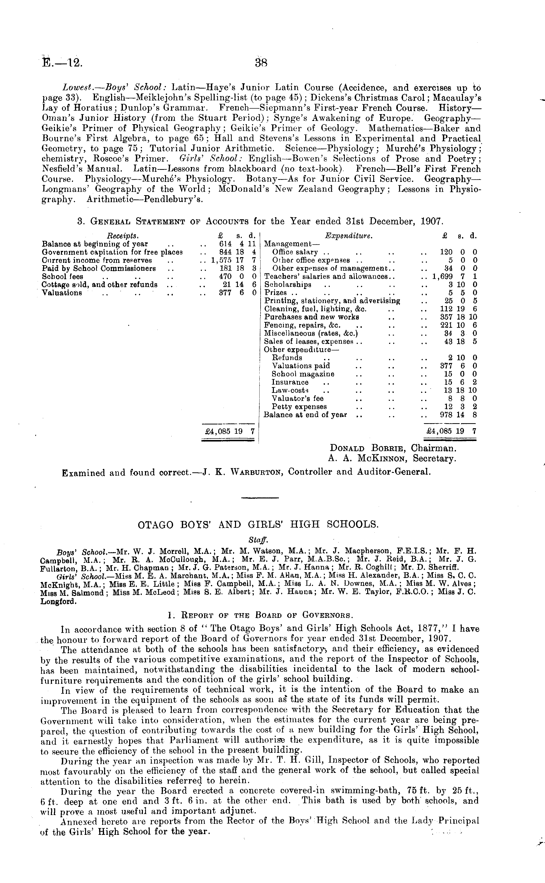 Lowest. — Boys' School: Latin—Haye's Junior Latin Course (Accidence, and exercises up to page 33). English —Meiklejohn's Spelling-list (to page 45); Dickens's Christmas Carol; Macaulay's Lay of Horatius; Dunlop's Grammar. French—Siepmann's First-year French Course. History— Oman's Junior History (from the Stuart Period); Synge's Awakening of Europe. Geography — Geikie's Primer of Physical Geography; Geikie's Primer of Geology. Mathematics —Baker and Bourne's First Algebra, to page 65 ; Hall and Stevens's Lessons in Experimental and Practical Geometry, to page 75; Tutorial Junior Arithmetic. Science —Physiology; Murche's Physiology; chemistry, Roscoe's Primer. Girls' School: English—Bowen's Selections of Prose and Poetry; Nesfield's Manual. Latin—Lessons from blackboard (no text-book) French—Bell's First French Course. Physiology—Murche's Physiology. Botany—As for Junior Civil Service. Geography — Longmans' Geography of the World; McDonald's New Zealand Geography; Lessons in Physiography. Arithmetic—Pendlebury's. 3. General Statement of Accounts for the Year ended 31st December, 1907. Receipts, £ s. d. Expenditure. £ s. d. Balance at beginning of year .. .. 614 411 Management— Government capitation for free places .. 844 18 4 Offico salary .. .. .. .. 120 0 0 Current income from reserves .. .. 1,575 17 7 Other office exp»nses .. .. .. 5 0 0 Paid by School Commissioners .. .. 181 18 3 Other expenses of management.. .. 84 0 0 School fees .. .. .. .. 470 0 0 Teachers' salaries and allowances.. .. 1,699 7 1 Cottage s >ld, and other refunds .. .. 21 14 6 Scholarships .. .. .. .. 310 0 Valuations .. .. .. .. 377 6 0 I Prizes .. .. .. .. .. 550 ■ Printing, stationery, and advertising .. 25 0 5 Cleaning, fuel, lighting, &o. .. .. 112 19 6 Purchases and new works .. .. 357 18 10 ! Fencing, repairs, &c. .. .. 221 10 6 Miscellaneous (rates, &o.) .. .. 34 3 0 Sales of leases, expenses .. .. .. 43 18 5 Other expenditure— Refunds .. .. .. .. 210 0 Valuations paid .. .. .. 377 6 0 School magazine .. .. .. 15 0 0 Insurance .. .. .. .. 15 6 2 Law-costs .. .. .. .. 13 18 10 Valuator's fee .. .. .. 8 8 0 Petty expenses .. .. .. 12 3 2 Balance at end of year .. .. .. 978 14 8 £4,085 19 7 £4,085 19 7 Donald Borrie, Chairman. A. A. McKinnon, Secretary. Examined and found correct. — J. K. Warburton, Controller and Auditor-General.