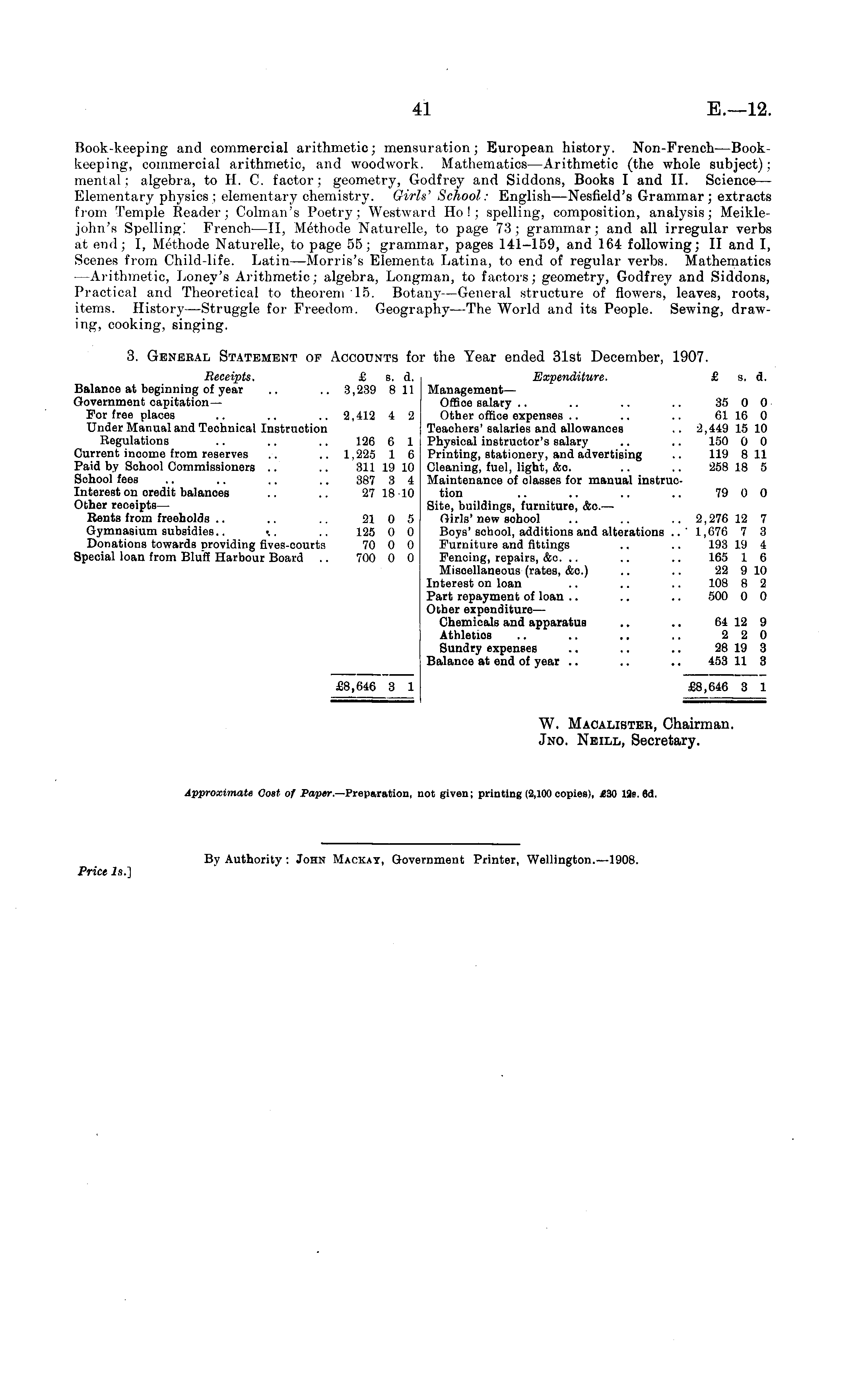Book-keeping and commercial arithmetic; mensuration; European history. Non-French—Book-keeping, commercial arithmetic, and woodwork. Mathematics—Arithmetic (the whole subject); mental; algebra, to H. C. factor; geometry, Godfrey and Siddons, Books I and 11. Science— Elementary physics; elementary chemistry. Girls , School: English—Nesfield's Grammar; extracts from Temple Reader; Colman's Poetry; Westward Ho!; spelling, composition, analysis; Meiklejohn's Spelling! French—ll, Methode Naturelle, to page 73; grammar; and all irregular verbs at end ; I, Methode Naturelle, to page 55; grammar, pages 141-159, and 164 following; II and I, Scenes from Child-life. Latin—Morrises Elementa Latina, to end of regular verbs. Mathematics —Arithmetic, Loney's Arithmetic; algebra, Longman, to factors; geometry, Godfrey and Siddons, Practical and Theoretical to theorem 15. Botany—General structure of flowers, leaves, roots, items. History—Struggle for Freedom. Geography—The World and its People. Sewing, drawing, cooking, singing. 3. General Statement op Accounts for the Year ended 31st December, 1907. Receipts. £ s. d. Expenditure. £ s. d. Balance at beginning of year .. .. 3,239 811 ManagementGovernment capitation— Office salary .. .. .. .. 35 0 0 For free places .. .. .. 2,412 4 2 Other office expenses .. .. .. 61 16 0 Under Manual and Teohnical Instruction Teaohers'salaries and allowances .. 2,449 15 10 Regulations .. .. .. 126 6 1 Physical instructor's salary .. .. 150 0 0 Current inoome from reserves .. .. 1,225 1 6 Printing, stationery, and advertising .. 119 811 Paid by Sohool Commissioners .. .. 311 19 10 Cleaning, fuel, light, &o. .. .. 258 18 5 School fees .. .. .. .. 387 3 4 Maintenance of classes for manual instrucInterest on oredit balanoes .. .. 27 18 10 tion .. .. .. .. 79 0 0 Other receipts— Site, buildings, furniture, &c— Rents from freeholds .. .. .. 21 0 5 Girls'new sohool .. .. .. 2,276 12 7 Gymnasium subsidies.. •.. .. 125 0 0 Boys'school, additions and alterations ..' 1,676 7 3 Donations towards providing fives-courts 70 0 0 Furniture and fittings .. .. 193 19 4 Bpecial loan from Bluff Harbour Board .. 700 0 0 Fencing, repairs, &c. .. .. .. 165 1 6 Miscellaneous (rates, &o.) .. .. 22 910 Interest on loan .. .. .. 108 8 2 Part repayment of loan .. .. .. 500 0 0 Other expenditure— Chemicals and apparatus .. .. 64 12 9 Athletios .. .. .. .. 2 2 0 Sundry expenses .. .. .. 28 19 3 Balance at end of year .. .. .. 453 11 3 £8,646 3 1 £8,646 3 1 W. Macalistbe, Chairman. Jno. Nbill, Secretary.