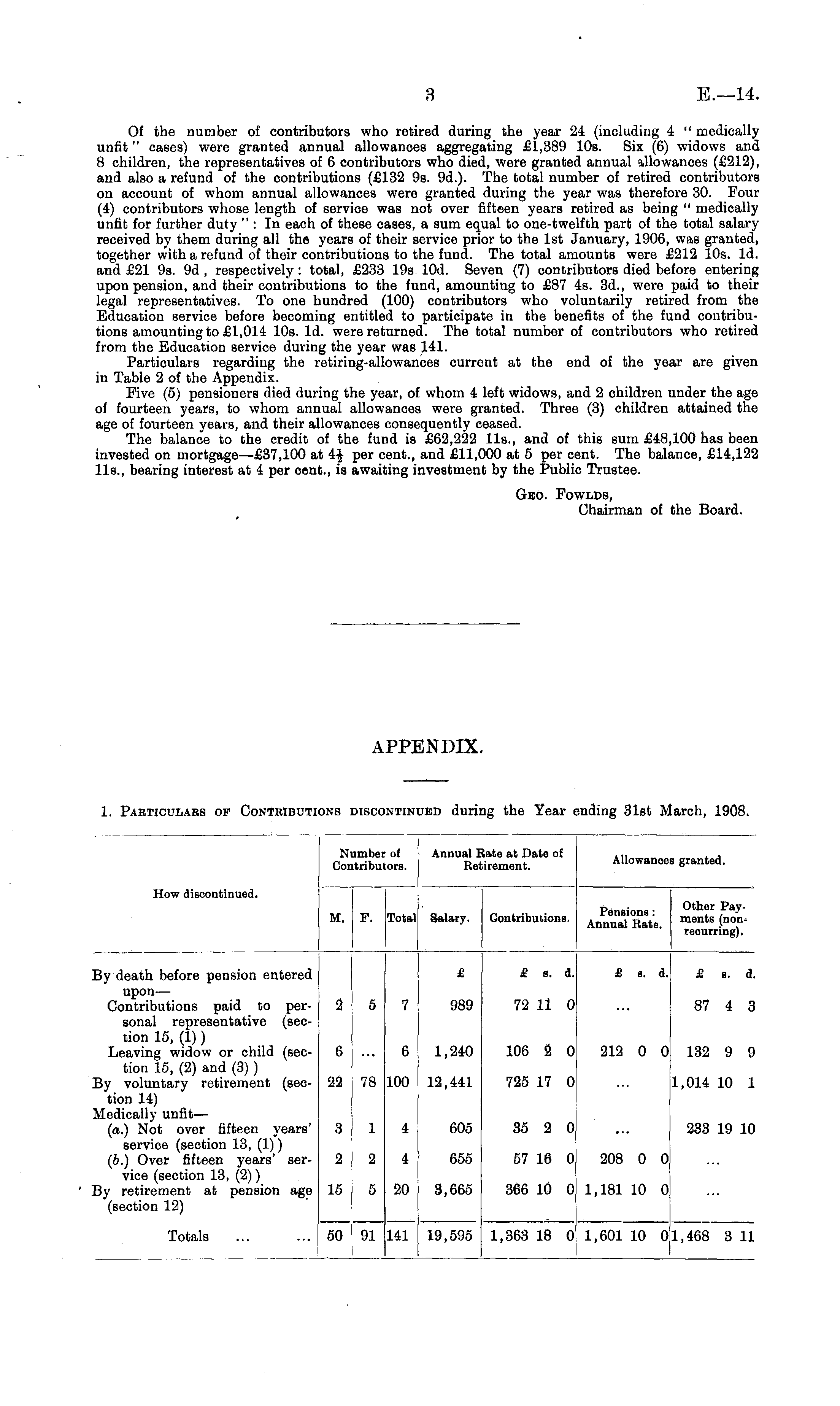1. Particulars of Contributions discontinued during the Year ending 31st March, 1908.