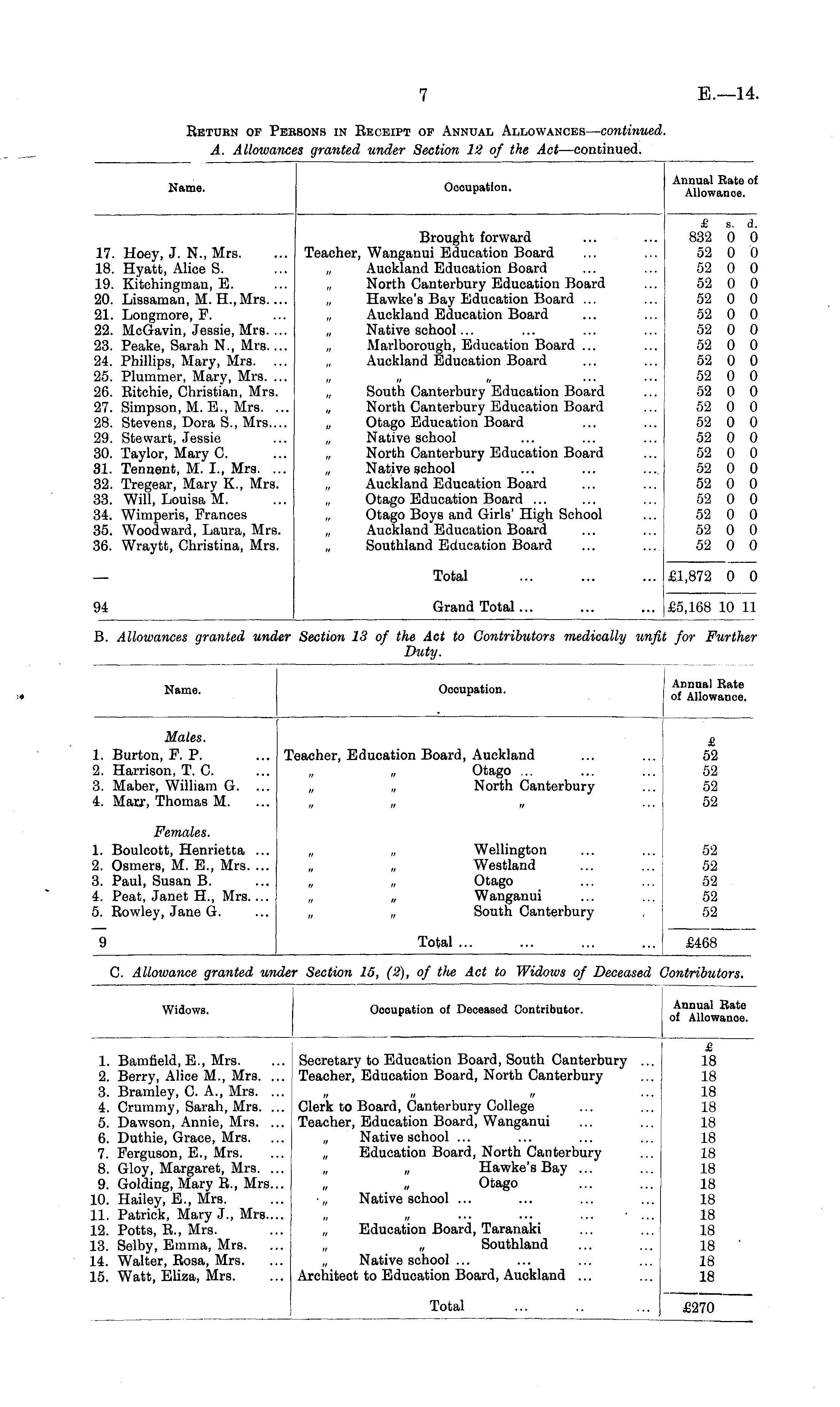 Name. Occupation. Annual Bate of Allowance. 17. Hoey, J. N., Mrs. 18. Hyatt, Alice S. 19. Kitchingman, E. 20. Lissaman, M. H.,Mrs.... 21. Longmore, F. 22. McGavin, Jessie, Mrs. ... 23. Peake, Sarah N., Mrs.... 24. Phillips, Mary, Mrs. ... 25. Plummer, Mary, Mrs. ... 26. Ritchie, Christian, Mrs. 27. Simpson, M. E., Mrs. ... 28. Stevens, Dora S., Mrs.... 29. Stewart, Jessie 30. Taylor, Mary C. 31. Tennent, M. I., Mrs. ... 32. Tregear, Mary K., Mrs. 33. Will, Louisa M. 34. Wimperis, Frances 35. Woodward, Laura, Mrs. 36. Wraytt, Christina, Mrs. Brought forward Teacher, Wanganui Education Board „ Auckland Education Board „ North Canterbury Education Board „ Hawke's Bay Education Board ... „ Auckland Education Board „ Native school... „ Marlborough, Education Board ... Auckland Education Board // it u ■•• „ South Canterbury Education Board „ North Canterbury Education Board „ Otago Education Board „ Native school „ North Canterbury Education Board „ Native school „ Auckland Education Board „ Otago Education Board ... „ Otago Boys and Girls' High School „ Auckland Education Board „ Southland Education Board £ 832 52 52 52 52 52 52 52 52 52 52 52 52 52 52 52 52 52 52 52 52 s. a. 0 0 0 0 0 0 0 0 0 0 0 0 0 0 0 0 0 0 0 0 0 0 0 0 0 0 0 0 0 0 0 0 0 0 0 0 0 0 0 0 0 0 Total £1,872 0 0 94 Grand Total... £5,168 10 11