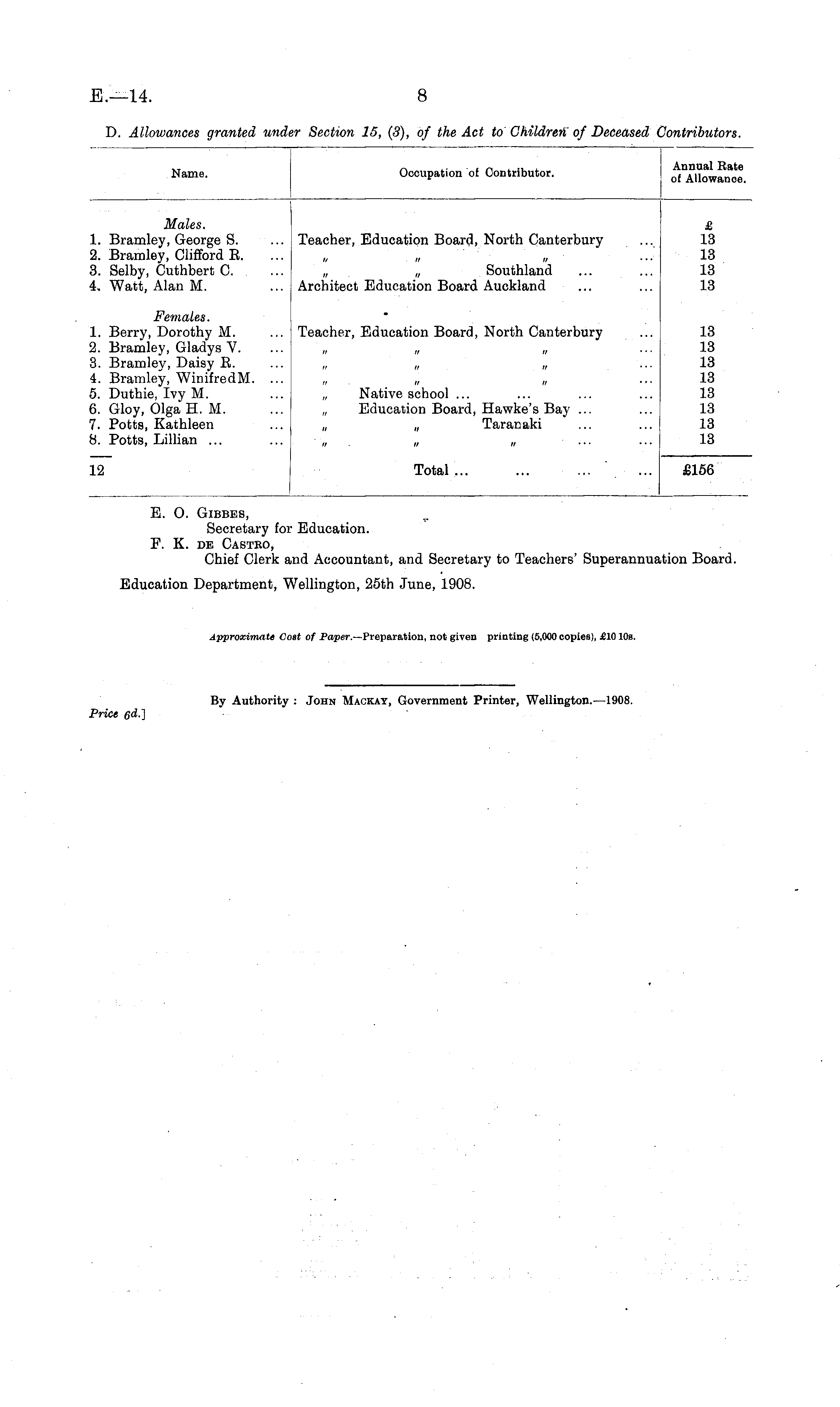 E. O. GlBBES, Secretary for Education. F. K. de Castro, Chief Clerk and Accountant, and Secretary to Teachers' Superannuation Board. Education Department, Wellington, 25th June, 1908.