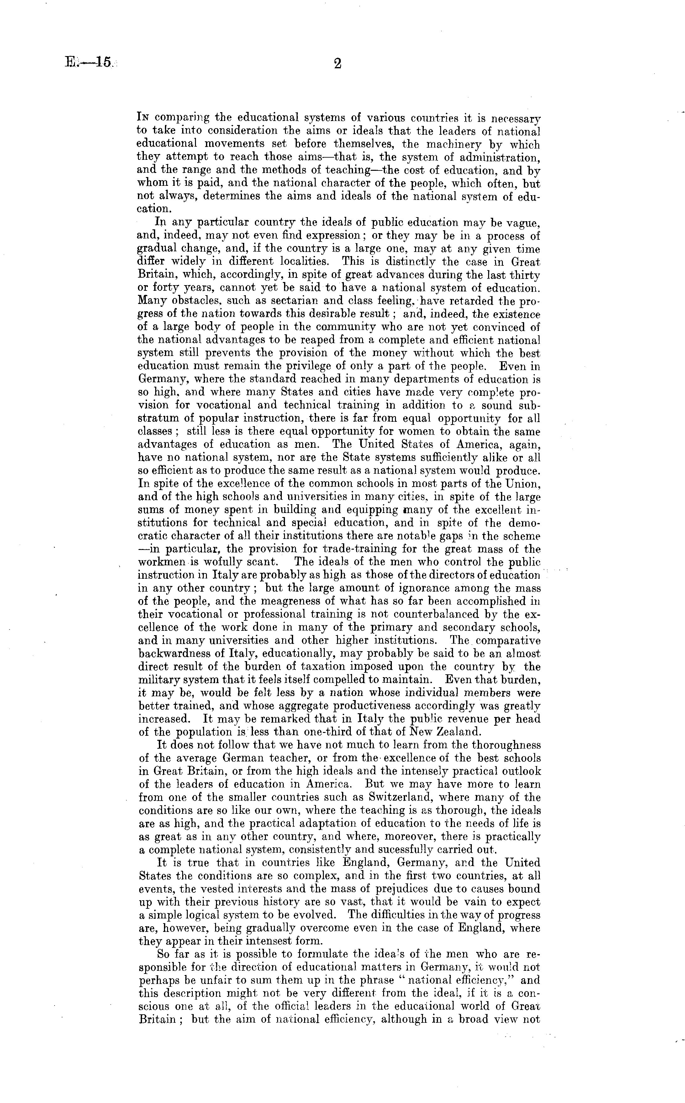 In comparing the educational systems of various countries it is necessar}' to take into consideration the aims or ideals that the leaders of national educational movements set before themselves, the machinery by which they attempt to reach those aims—that is, the system of administration, and the range and the methods of teaching-—the cost of education, and by whom it is paid, and the national character of the people, which often, but not always, determines the aims and ideals of the national system of education. In any particular country the ideals of public education may be vague, and, indeed, may not even find expression; or they may be in a process of gradual change, and, if the country is a large one, may at any given time differ widely in different localities. This is distinctly the case in Great Britain, which, accordingly, in spite of great advances during the last thirty or forty years, cannot yet be said to have a national system of education. Many obstacles, such as sectarian and class feeling, have retarded the progress of the nation towards this desirable result; and, indeed, the existence of a large body of people in the community who are not yet convinced of the national advantages to be reaped from a complete and efficient national system still prevents the provision of the money without which the best education must remain the privilege of only a part of the people. Even in Germany, where the standard reached in many departments of education is so high, and where many States and cities have made very complete provision for vocational and technical training in addition to a sound substratum of popular instruction, there is far from equal opportunity for all classes ; still less is there equal opportunity for women to obtain the same advantages of education as men. The United States of America, again, have no national system, nor are the State systems sufficiently alike or all so efficient as to produce the same result as a national system would produce. In spite of the excellence of the common schools in most parts of the Union, and of the high schools and universities in many cities, in spite of the large sums of money spent in building and equipping many of the excellent institutions for technical and special education, and in spite of the democratic character of all their institutions there are notab'e gaps in the scheme —in particular, the provision for trade-training for the great mass of the workmen is wofully scant. The ideals of the men who control the public instruction in Italy are probably as high as those of the directors of education in any other country ; but the large amount of ignorance among the mass of the people, and the meagreness of what has so far been accomplished in their vocational or professional training is not counterbalanced by the excellence of the work done in many of the primary and secondary schools, and in many universities and other higher institutions. The comparative backwardness of Italy, educationally, may probably be said to be an almost direct result of the burden of taxation imposed upon the country by the military system that it feels itself compelled to maintain. Even that burden, it may be, would be felt less by a nation whose individual members were better trained, and whose aggregate productiveness accordingly was greatly increased. It may be remarked that in Italy the pubic revenue per head of the population is. less than one-third of that of New Zealand. It does not follow that we have not much to learn from the thoroughness of the average German teacher, or from the excellence of the best schools in Great Britain, or from the high ideals and the intensely practical outlook of the leaders of education in America. But we may have more to learn from one of the smaller countries such as Switzerland, where many of the conditions are so like our own, where the teaching is as thorough, the ideals are as high, and the practical adaptation of education to the needs of life is as great as in any other country, and where, moreover, there is practically a complete national system, consistently and sucessfully carried out. It is true that in countries like England, Germany, and the United States the conditions are so complex, and in the first two countries, at all events, the vested interests and the mass of prejudices due to causes bound up with their previous history are so vast, that it would be vain to expect a simple logical system to be evolved. The difficulties in the way of progress are, however, being gradually overcome even in the case of England, where they appear in their intensest form. So far as it is possible to formulate the idea's of the men who are responsible for the direction of educational matters in Germany, it would not perhaps be unfair to sum them up in the phrase " national efficiency,'' and this description might not be very different from the ideal, if it is a conscious one at all, of the official leaders in the educational world of Grea'c Britain ; but the aim of national efficiency, although in a broad view not