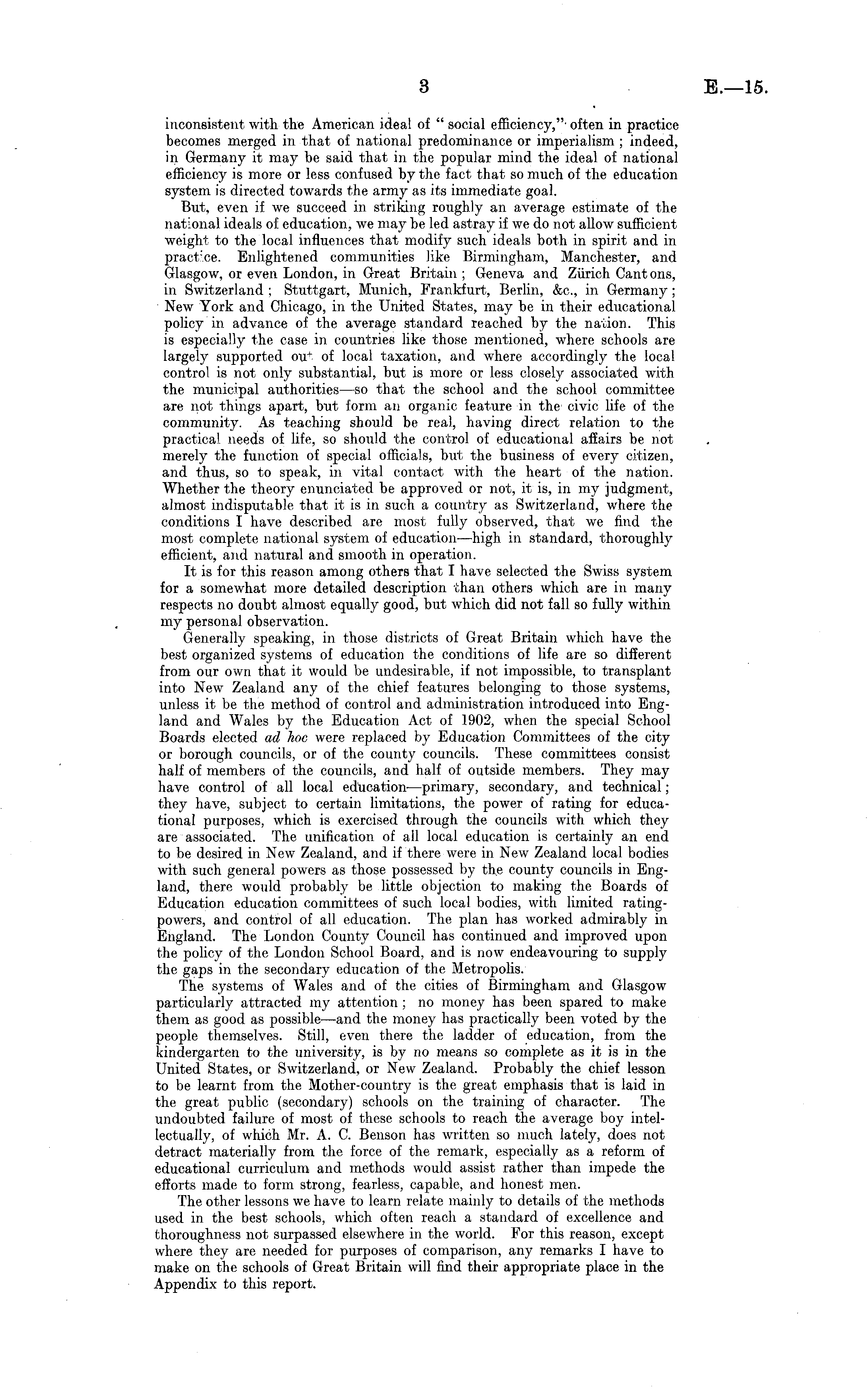 inconsistent with the American ideal of " social efficiency,"' often in practice becomes merged in that of national predominance or imperialism ; indeed, in Germany it may be said that in the popular mind the ideal of national efficiency is more or less confused by the fact that so much of the education system is directed towards the army as its immediate goal. But, even if we succeed in striking roughly an average estimate of the national ideals of education, we may be led astray if we do not allow sufficient weight to the local influences that, modify such ideals both in spirit and in practice. Enlightened communities like Birmingham, Manchester, and Glasgow, or even London, in Great Britain ; Geneva and Zurich Cantons, in Switzerland ; Stuttgart, Munich, Frankfurt, Berlin, &c, in Germany ; New York and Chicago, in the United States, may be in their educational policy in advance of the average standard reached by the nation. This is especially the case in countries like those mentioned, where schools are largely supported of local taxation, and where accordingly the local control is not only substantial, but is more or less closely associated with the municipal authorities —so that the school and the school committee are not things apart, but form an organic feature in the civic life of the community. As teaching should be real, having direct relation to the practical needs of life, so should the control of educational affairs be not merely the function of special officials, but the business of every citizen, and thus, so to speak, in vital contact with the heart of the nation. Whether the theory enunciated be approved or not, it is, in my judgment, almost indisputable that it is in such a country as Switzerland, where the conditions I have described are most fully observed, that we find the most complete national, system of education —high in standard, thoroughly efficient, and natural and smooth in operation. It is for this reason among others that I have selected the Swiss system for a somewhat more detailed description than others which are in many respects no doubt almost equally good, but which did not fall so fully within my personal observation. Generally speaking, in those districts of Great Britain which have the best organized systems of education the conditions of life are so different from our own that it would be undesirable, if not impossible, to transplant into New Zealand any of the chief features belonging to those systems, unless it be the method of control and administration introduced into England and Wales by the Education Act of 1902, when the special School Boards elected ad hoc were replaced by Education Committees of the city or borough councils, or of the county councils. These committees consist half of members of the councils, and half of outside members. They may have control of all local education —primary, secondary, and technical; they have, subject to certain limitations, the power of rating for educational purposes, which is exercised through the councils with which they are associated. The unification of all local education is certainly an end to be desired in New Zealand, and if there were in New Zealand local bodies with such general powers as those possessed by the county councils in England, there would probably be little objection to making the Boards of Education education committees of such local bodies, with limited ratingpowers, and control of all education. The plan has worked admirably in England. The London County Council has continued and improved upon the policy of the London School Board, and is now endeavouring to supply the gaps in the secondary education of the Metropolis. The systems of Wales and of the cities of Birmingham and Glasgow particularly attracted my attention ; no money has been spared to make them as good as possible —and the money has practically been voted by the people themselves. Still, even there the ladder of education, from the kindergarten to the university, is by no means so complete as it is in the United States, or Switzerland, or New Zealand. Probably the chief lesson to be learnt from the Mother-country is the great emphasis that is laid in the great public (secondary) schools on the training of character. The undoubted failure of most of these schools to reach the average boy intellectually, of which Mr. A. C. Benson has written so much lately, does not detract materially from the force of the remark, especially as a reform of educational curriculum and methods would assist rather than impede the efforts made to form strong, fearless, capable, and honest men. The other lessons we have to learn relate mainly to details of the methods used in the best schools, which often reach a standard of excellence and thoroughness not surpassed elsewhere in the world. For this reason, except where they are needed for purposes of comparison, any remarks I have to make on the schools of Great Britain will find their appropriate place in the Appendix to this report.
