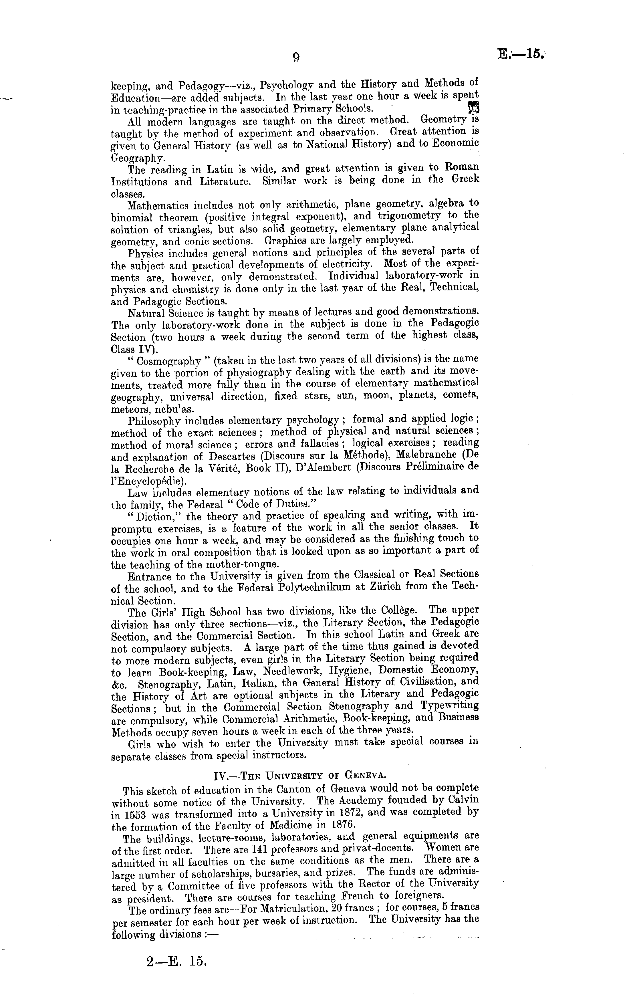 keeping, and Pedagogy—viz., Psychology and the History and Methods of Education—are added subjects. In the last year one hour a week is spent in teaching-practice in the associated Primary Schools. gqj All modern languages are taught on the direct method. Geometry is taught by the method of experiment and observation. Great attention is given to General History (as well as to National History) and to Economic Geography. The reading in Latin is wide, and great attention is given to Roman Institutions and Literature. Similar work is being done in the Greek classes. Mathematics includes not only arithmetic, plane geometry, algebra to binomial theorem (positive integral exponent), and trigonometry to the solution of triangles, but also solid geometry, elementary plane analytical geometry, and conic sections. Graphics are largely employed. Physics includes general notions and principles of the several parts of the subject and practical developments of electricity. Most of the experiments are, however, only demonstrated. Individual laboratory-work in physics and chemistry is done only in the last year of the Real, Technical, and Pedagogic Sections. Natural Science is taught by means of lectures and good demonstrations. The only laboratory-work done in the subject is done in the Pedagogic Section (two hours a week during the second term of the highest class, Class IV). " Cosmography " (taken in the last two years of all divisions) is the name given to the portion of physiography dealing with the earth and its movements, treated more fully than in the course of elementary mathematical geography, universal direction, fixed stars, sun, moon, planets, comets, meteors, nebu'as. Philosophy includes elementary psychology ; formal and applied logic ; method of the exact sciences ; method of physical and natural sciences; method of moral science ; errors and fallacies ; logical exercises ; reading and explanation of Descartes (Discours sur la Methode), Malebranche (De la Recherche de la Verite, Book II), D'Alembert (Discours Preliminaire de PEncyclopedie). Law includes elementary notions of the law relating to individuals and the family, the Federal " Code of Duties." " Diction," the theory and practice of speaking and writing, with impromptu exercises, is a feature of the work in all the senior classes. It occupies one hour a week, and may be considered as the finishing touch to the work in oral composition that is looked upon as so important a part of the teaching of the mother-tongue. Entrance to the University is given from the Classical or Real Sections of the school, and to the Federal Polytechnikum at Zurich from the Technical Section. The Girls' High School has two divisions, like the College. The upper division has only three sections—viz., the Literary Section, the Pedagogic Section, and the Commercial Section. In this school Latin and Greek are not compulsory subjects. A large part of the time thus gained is devoted to more modern subjects, even girls in the Literary Section being required to learn Book-keeping, Law, Needlework, Hygiene, Domestic Economy, &c. Stenography, Latin, Italian, the General History of Civilisation, and the History of Art are optional subjects in the Literary and Pedagogic Sections; but in the Commercial Section Stenography and Typewriting are compulsory, while Commercial Arithmetic, Book-keeping, and Business Methods occupy seven hours a week in each of the three years. Girls who wish to enter the University must take special courses in separate classes from special instructors. IV. —The University of Geneva. This sketch of education in the Canton of Geneva would not be complete without some notice of the University. The Academy founded by Calvin in 1553 was transformed into a University in 1872, and was completed by the formation of the Faculty of Medicine in 1876. The buildings, lecture-rooms, laboratories, and general equipments are of the first order. There are 141 professors and privat-docents. Women are admitted in all faculties on the same conditions as the men. There are a large number of scholarships, bursaries, and prizes. The funds are administered by a Committee of five professors with the Rector of the University as president. There are courses for teaching French to foreigners. The ordinary fees are—For Matriculation, 20 francs ; for courses, 5 francs per semester for each hour per week of instruction. The University has the following divisions: — ...