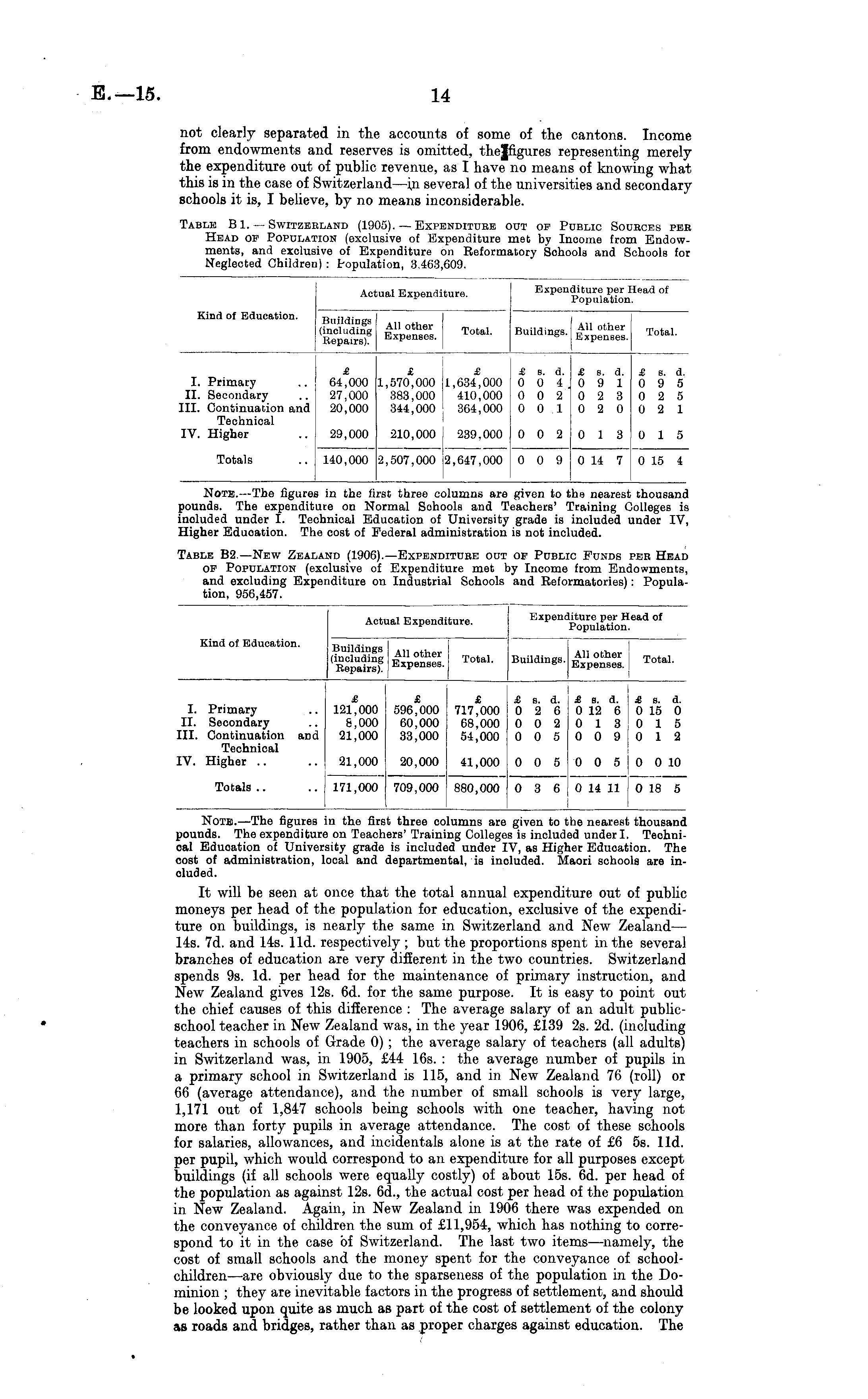 not clearly separated in the accounts of some of the cantons. Income from endowments and reserves is omitted, the|figures representing merely the expenditure out of public revenue, as I have no means of knowing what this is in the case of Switzerland—in several of the universities and secondary schools it is, I believe, by no means inconsiderable.