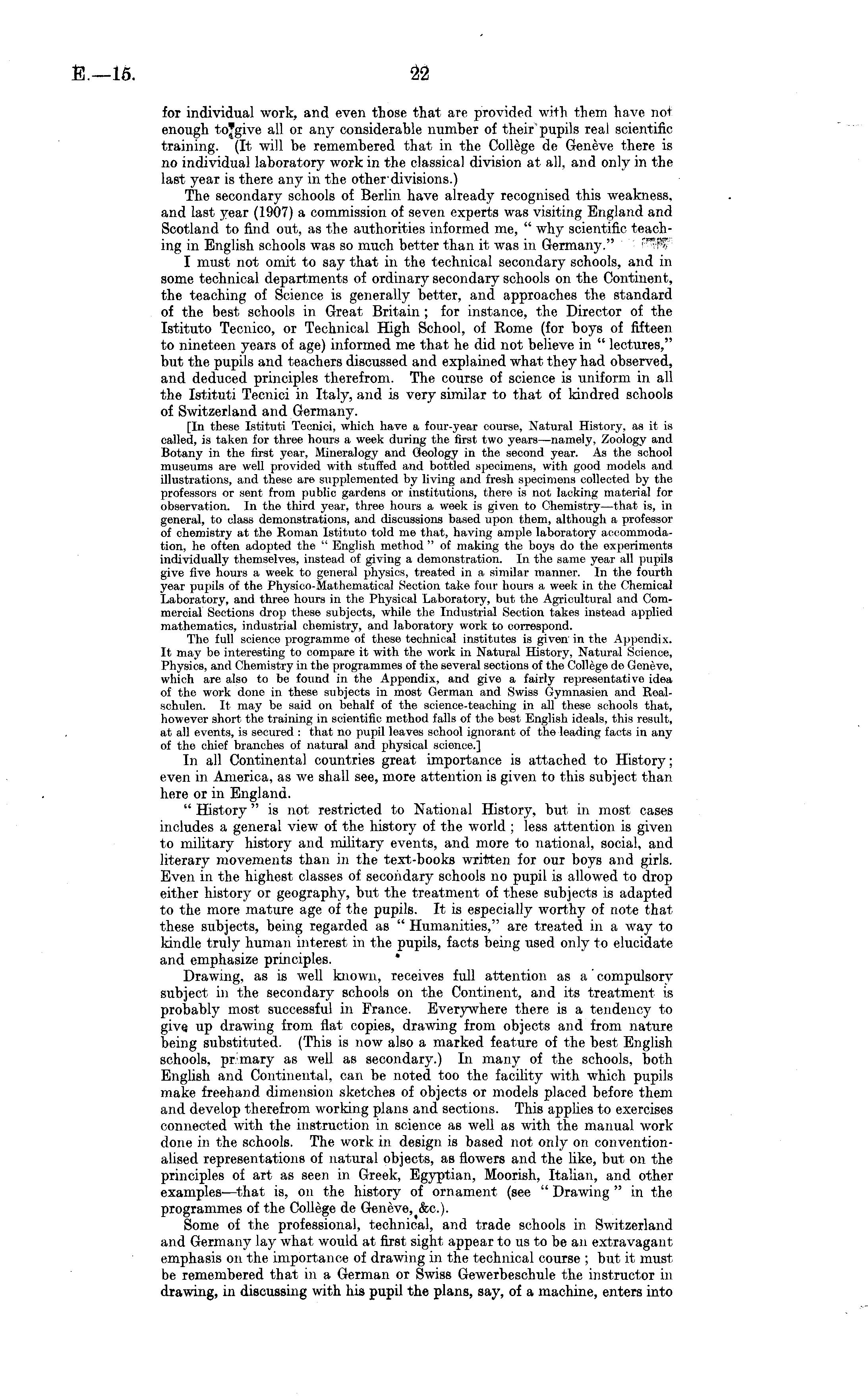 for individual work, and even those that are provided with them have noi enough to'give all or any considerable number of their pupils real scientific training. (It will be remembered that in the College de Geneve there is no individual laboratory work in the classical division at all, and only in the last year is there any in the other divisions.) The secondary schools of Berlin have already recognised this weakness. and last year (1907) a commission of seven experts was visiting England and Scotland to find out, as the authorities informed me, " why scientific teaching in English schools was so much better than it was in Germany." I must not omit to say that in the technical secondary schools, and in some technical departments of ordinary secondary schools on the Continent, the teaching of Science is generally better, and approaches the standard of the best schools in Great Britain ; for instance, the Director of the Istituto Tecnico, or Technical High School, of Rome (for boys of fifteen to nineteen years of age) informed me that he did not believe in " lectures," but the pupils and teachers discussed and explained what they had observed, and deduced principles therefrom. The course of science is uniform in all the Istituti Tecnici in Italy, and is very similar to that of kindred schools of Switzerland and Germany. [In these Istituti Tecnici, which have a four-year course, Natural History, as it is called, is taken for three hours a week during the first two years—namely, Zoology and Botany in the first year, Mineralogy and Geology in the second year. As the school museums are well provided with stuffed and bottled specimens, with good models and illustrations, and these are supplemented by living and fresh specimens collected by the professors or sent from public gardens or institutions, there is not lacking material for observation. In the third year, three hours a week is given to Chemistry—that is, in general, to class demonstrations, and discussions based upon them, although a professor of chemistry at the Roman Istituto told me that, having ample laboratory accommodation, he often adopted the " English method " of making the boys do the experiments individually themselves, instead of giving a demonstration. In the same year all pupils give five hours a week to general physics, treated in a similar manner. In the fourth year pupils of the Physico-Mathematical Section take four hours a week in the Chemical Laboratory, and three hours in the Physical Laboratory, but the Agricultural and Commercial Sections drop these subjects, while the Industrial Section takes instead applied mathematics, industrial chemistry, and laboratory work to correspond. The full science programme of these technical institutes is given in the Appendix. It may be interesting to compare it with the work in Natural History, Natural Science, Physics, and Chemistry in the programmes of the several sections of the College de Geneve, which are also to be found in the Appendix, and give a fairly representative idea of the work done in these subjects in most German and Swiss Gymnasien and Realschulen. It may be said on behalf of the science-teaching in all these schools that, however short the training in scientific method falls of the best English ideals, this result, at all events, is secured : that no pupil leaves school ignorant of the leading facts in any of the chief branches of natural and physical science.] In all Continental countries great importance is attached to History; even in America, as we shall see, more attention is given to this subject than here or in England. " History" is not restricted to National History, but in most cases includes a genera! view of the history of the world ; less attention is given to military history and military events, and more to national, social, and literary movements than in the text-books written for our boys and girls. Even in the highest classes of secondary schools no pupil is allowed to drop either history or geography, but the treatment of these subjects is adapted to the more mature age of the pupils. It is especially worthy of note that these subjects, being regarded as " Humanities," are treated in a way to kindle truly human interest in the pupils, facts being used only to elucidate and emphasize principles. Drawing, as is well known, receives full attentioji as a compulsory subject in the secondary schools on the Continent, and its treatment is probably most successful in France. Everywhere there is a tendency to give up drawing from flat copies, drawing from objects and from nature being substituted. (This is now also a marked feature of the best English schools, pr mary as well as secondary.) In many of the schools, both Ejiglish atid Continental, can be noted too the facility with which pupils make freehand dimension sketches of objects or models placed before them and develop therefrom working plans and sections. This applies to exercises connected with the instruction in science as well as with the manual work done in the schools. The work in design is based not only on conventionalised representations of natural objects, as flowers and the like, but on the principles of art as seeJi in Greek, Egyptian, Moorish, Italian, and other examples.—that is, on the history of ornament (see " Drawing " in the programmes of the College de Geneve, &c). Some of the professional, technical, and trade schools in Switzerland and Germany lay what would at first sight appear to us to be an extravagant emphasis on the importance of drawing in the technical course ; but it must be remembered that in a German or Swiss Gewerbeschule the instructor in drawing, in discussing with his pupil the plans, say, of a machine, enters into