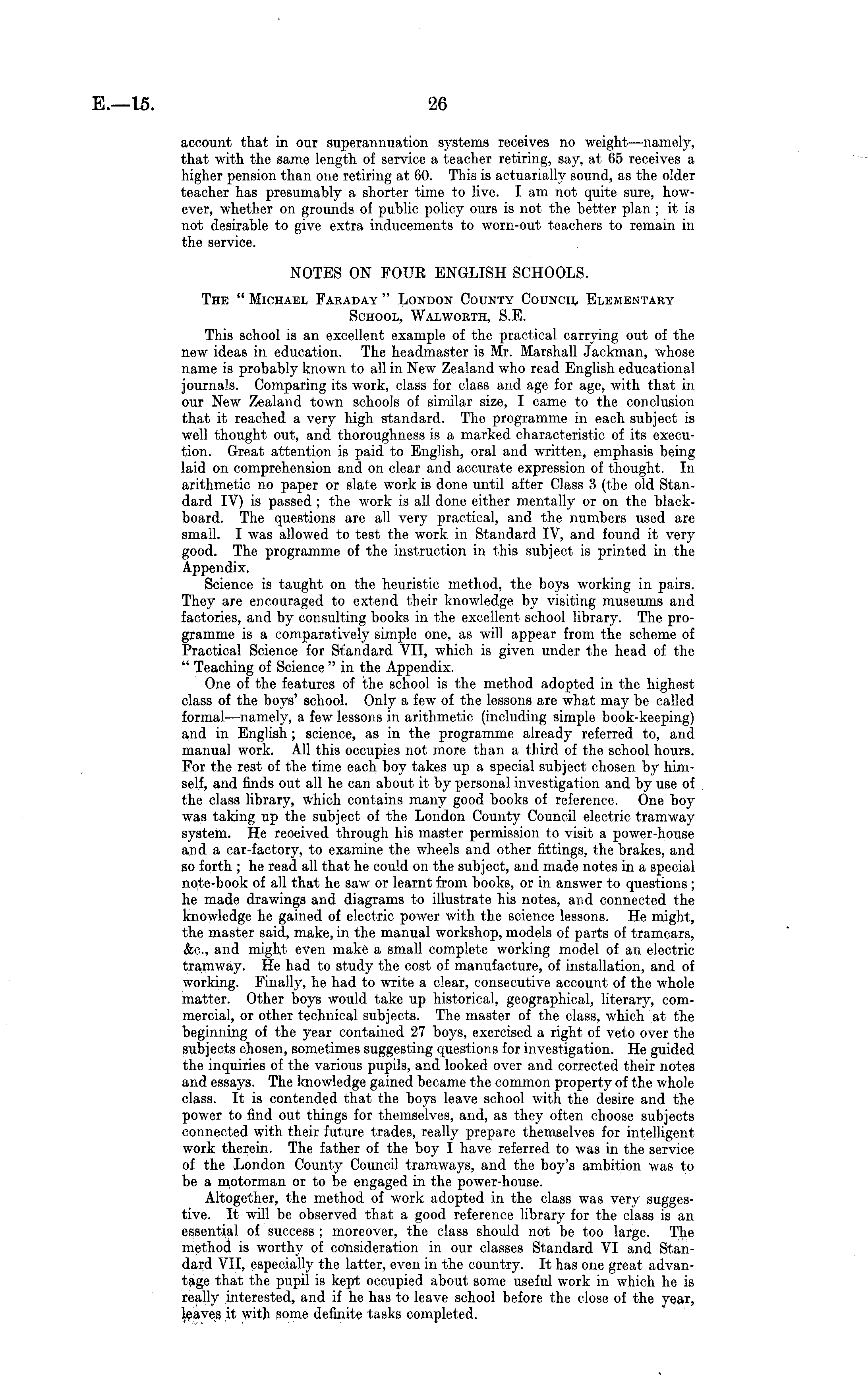 account that in our superannuation systems receives no weight —namely, that with the same length of service a teacher retiring, say, at 65 receives a higher pension than one retiring at 60. This is actuarially sound, as the older teacher has presumably a shorter time to live. lam not quite sure, however, whether on grounds of public policy ours is not the better plan ; it is not desirable to give extra inducements to worn-out teachers to remain in the service. NOTES ON FOUR ENGLISH SCHOOLS. The " Michael Faraday " London County Council Elementary School, Walworth, S.E. This school is an excellent example of the practical carrying out of the new ideas in education. The headmaster is Mr. Marshall Jackman, whose name is probably known to all in New Zealand who read English educational journals. Comparing its work, class for class and age for age, with that in our New Zealand town schools of similar size, I came to the conclusion that it reached a very high standard. The programme in each subject is well thought out, and thoroughness is a marked characteristic of its execution. Great attention is paid to English, oral and written, emphasis being laid on comprehension and on clear and accurate expression of thought. In arithmetic no paper or slate work is done until after Class 3 (the old Standard IV) is passed ; the work is all done either mentally or on the blackboard. The questions are all very practical, and the numbers used are small. I was allowed to test the work in Standard IV, and found it very good. The programme of the instruction in this subject is printed in the Appendix. Science is taught on the heuristic method, the boys working in pairs. They are encouraged to extend their knowledge by visiting museums and factories, and by consulting books in the excellent school library. The programme is a comparatively simple one, as will appear from the scheme of Practical Science for Standard VII, which is given under the head of the " Teaching of Science " in the Appendix. One of the features of the school is the method adopted in the highest class of the boys' school. Only a few of the lessons are what may be called formal—namely, a few lessons in arithmetic (including simple book-keeping) and in English ; science, as in the programme already referred to, and manual work. All this occupies not more than a third of the school hours. For the rest of the time each boy takes up a special subject chosen by himself, and finds out all he can about it by personal investigation and by use of the class library, which contains many good books of reference. One boy was taking up the subject of the London County Council electric tramway system. He received through his master permission to visit a power-house and a car-factory, to examine the wheels and other fittings, the brakes, and so forth ; he read all that he could on the subject, and made notes in a special note-book of all that he saw or learnt from books, or in answer to questions; he made drawings and diagrams to illustrate his notes, and connected the knowledge he gained of electric power with the science lessons. He might, the master said, make, in the manual workshop, models of parts of tramcars, &c, and might even make a small complete working model of an electric tramway. He had to study the cost of manufacture, of installation, and of working. Finally, he had to write a clear, consecutive account of the whole matter. Other boys would take up historical, geographical, literary, commercial, or other technical subjects. The master of the class, which at the beginning of the year contained 27 boys, exercised a right of veto over the subjects chosen, sometimes suggesting questions for investigation. He guided the inquiries of the various pupils, and looked over and corrected their notes and essays. The knowledge gained became the common property of the whole class. It is contended that the boys leave school with the desire and the power to find out things for themselves, and, as they often choose subjects connected with their future trades, really prepare themselves for intelligent work therein. The father of the boy I have referred to was in the service of the London County Council tramways, and the boy's ambition was to be a motorman or to be engaged in the power-house. Altogether, the method of work adopted in the class was very suggestive. It will be observed that a good reference library for the class is an essential of success ; moreover, the class should not be too large. The method is worthy of consideration in our classes Standard VI and Standard VII, especially the latter, even in the country. It has one great advantage that the pupil is kept occupied about some useful work in which he is really interested, and if he has to leave school before the close of the year, leaves it with some definite tasks completed.