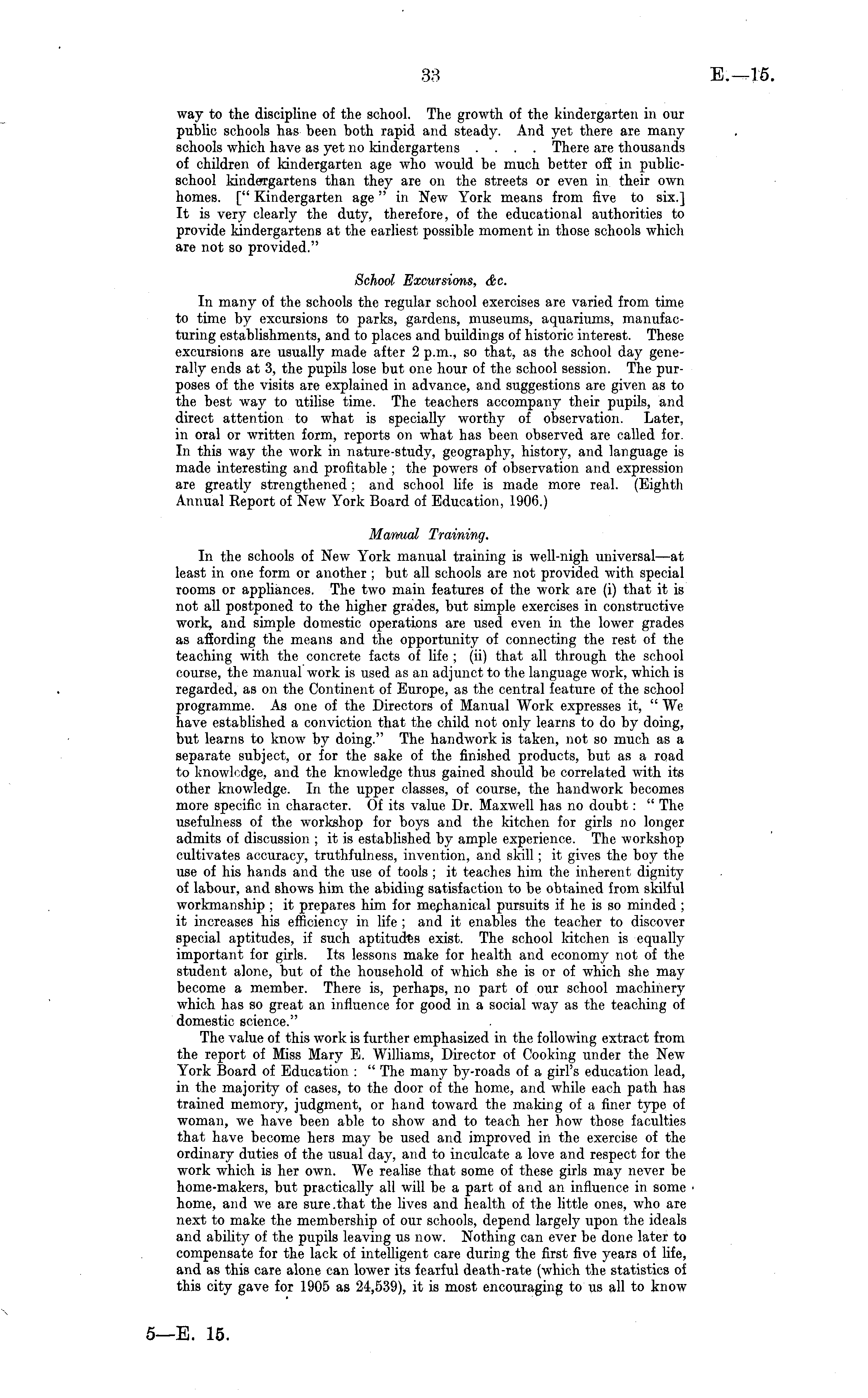 way to the discipline of the school. The growth of the kindergarten in our public schools has been both rapid and steady. And yet there are many schools which have as yet no kindergartens .... There are thousands of children of kindergarten age who would be much better off in publicschool kindergartens than they are on the streets or even in their own homes. [" Kindergarten age" in New York means from five to six.] It is very clearly the duty, therefore, of the educational authorities to provide kindergartens at the earliest possible moment in those schools which are not so provided." School Excursions, &c. In many of the schools the regular school exercises are varied from time to time by excursions to parks, gardens, museums, aquariums, manufacturing establishments, and to places and buildings of historic interest. These excursions are usually made after 2 p.m., so that, as the school day generally ends at 3, the pupils lose but one hour of the school session. The purposes of the visits are explained in advance, and suggestions are given as to the best way to utilise time. The teachers accompany their pupils, and direct attention to what is specially worthy of observation. Later, in oral or written form, reports on what has been observed are called for. In this way the work in nature-study, geography, history, and language is made interesting and profitable ; the powers of observation and expression are greatly strengthened ; and school life is made more real. (Eighth Annual Report of New York Board of Education, 1906.) Manual Training. In the schools of New York manual training is well-nigh universal —at least in one form or another ; but all schools are not provided with special rooms or appliances. The two main features of the work are (i) that it is not all postponed to the higher grades, but simple exercises in constructive work, and simple domestic operations are used even in the lower grades as affording the means and the opportunity of connecting the rest of the teaching with the concrete facts of life ; (ii) that all through the school course, the manual work is used as an adjunct to the language work, which is regarded, as on the Continent of Europe, as the central feature of the school programme. As one of the Directors of Manual Work expresses it, "We have established a conviction that the child not only learns to do by doing, but learns to know by doing." The handwork is taken, not so much as a separate subject, or for the sake of the finished products, but as a road to knowledge, and the knowledge thus gained should be correlated with its other knowledge. In the upper classes, of course, the handwork becomes more specific in character. Of its value Dr. Maxwell has no doubt: " The usefulness of the workshop for boys and the kitchen for girls no longer admits of discussion ; it is established by ample experience. The workshop cultivates accuracy, truthfulness, invention, and skill; it gives the boy the use of his hands and the use of tools ; it teaches him the inherent dignity of labour, and shows him the abiding satisfaction to be obtained from skilful workmanship ; it prepares him for mephanical pursuits if he is so minded ; it increases his efficiency in life ; and it enables the teacher to discover special aptitudes, if such aptitudes exist. The school kitchen is equally important for girls. Its lessons make for health and economy not of the student alone, but of the household of which she is or of which she may become a member. There is, perhaps, no part of our school machinery which has so great an influence for good in a social way as the teaching of domestic science." The value of this work is further emphasized in the following extract from the report of Miss Mary E. Williams, Director of Cooking under the New York Board of Education : " The many by-roads of a girl's education lead, in the majority of cases, to the door of the home, and while each path has trained memory, judgment, or hand toward the making of a finer type of woman, we have been able to show and to teach her how those faculties that have become hers may be used and improved in the exercise of the ordinary duties of the usual day, and to inculcate a love and respect for the work which is her own. We realise that some of these girls may never be home-makers, but practically all will be a part of and an influence in some home, and we are sure .that the lives and health of the little ones, who are next to make the membership of our schools, depend largely upon the ideals and ability of the pupils leaving us now. Nothing can ever be done later to compensate for the lack of intelligent care during the first five years of life, and as this care alone can lower its fearful death-rate (which the statistics of this city gave for 1905 as 24,539), it is most encouraging to us all to know