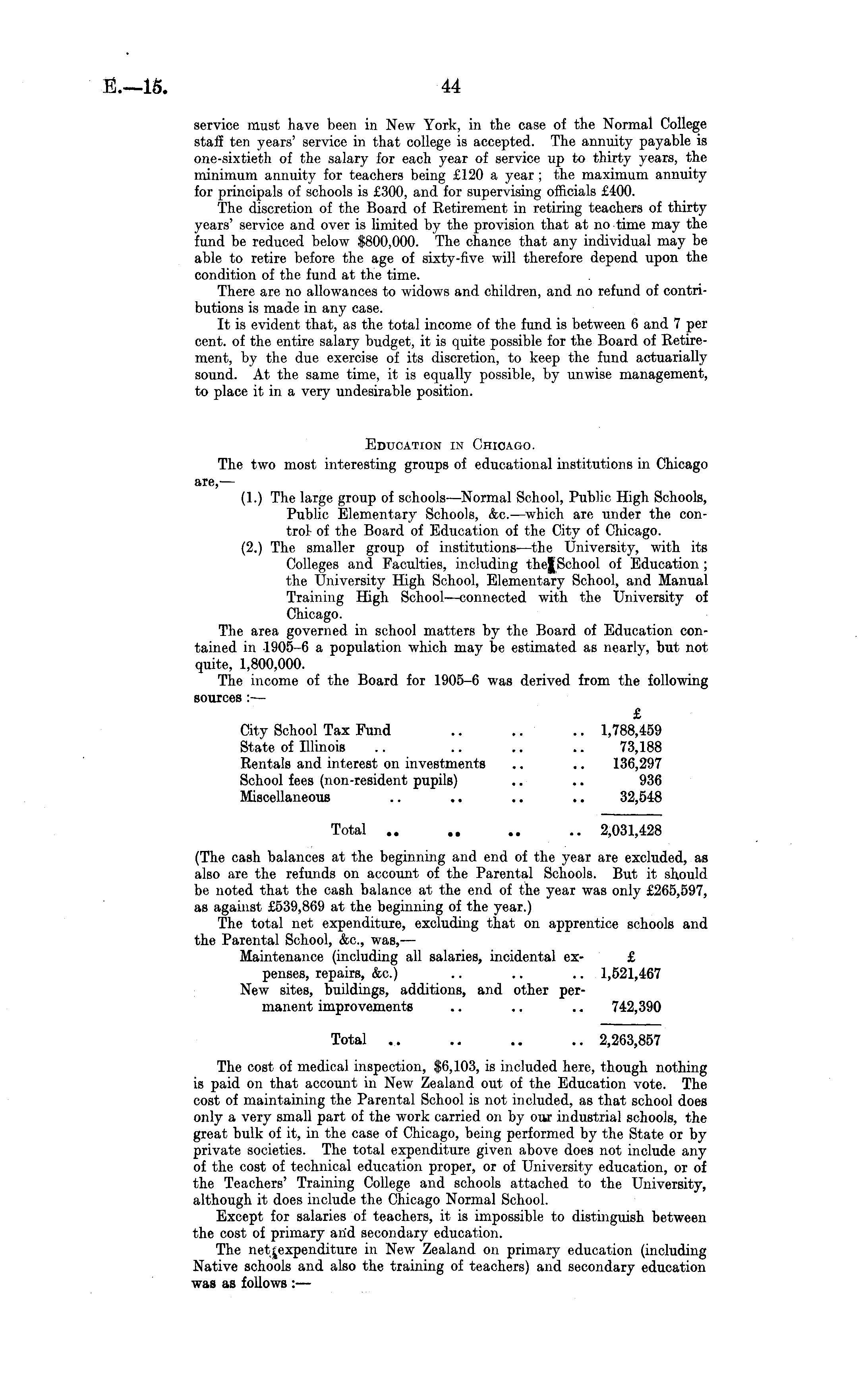 service must have been in New York, in the case of the Normal College staff ten years' service in that college is accepted. The annuity payable is one-sixtieth of the salary for each year of service up to thirty years, the minimum annuity for teachers being £120 a year ; the maximum annuity for principals of schools is £300, and for supervising officials £400. The discretion of the Board of Retirement in retiring teachers of thirty years' service and over is limited by the provision that at no time may the fund be reduced below $800,000. The chance that any individual may be able to retire before the age of sixty-five will therefore depend upon the condition of the fund at the time. There are no allowances to widows and children, and no refund of contributions is made in any case. It is evident that, as the total income of the fund is between 6 and 7 per cent, of the entire salary budget, it is quite possible for the Board of Retirement, by the due exercise of its discretion, to keep the fund actuarially sound. At the same time, it is equally possible, by unwise management, to place it in a very undesirable position. Education in Chicago. The two most interesting groups of educational institutions in Chicago are,' — (1.) The large group of schools —Normal School, Public High Schools, Public Elementary Schools, &c.—which are under the control of the Board of Education of the City of Chicago. (2.) The smaller group of institutions —the University, with its Colleges and Faculties, including the|School of Education ; the University High School, Elementary School, and Manual Training High School—connected with the University of Chicago. The area governed in school matters by the Board of Education contained in 1905-6 a population which may be estimated as nearly, but not quite, 1,800,000. The income of the Board for 1905-6 was derived from the following sources : — £ City School Tax Fund .. .. .. 1,788,459 State of Illinois .. .. .. .. 73,188 Rentals and interest on investments .. .. 136,297 School fees (non-resident pupils) .. .. 936 Miscellaneous .. .. .. .. 32,548 Total .. .. .. .. 2,031,428 (The cash balances at the beginning and end of the year are excluded, as also are the refunds on account of the Parental Schools. But it should be noted that the cash balance at the end of the year was only £265,597, as against £539,869 at the beginning of the year.) The total net expenditure, excluding that on apprentice schools and the Parental School, &c, was, — Maintenance (including all salaries, incidental ex- £ penses, repairs, &c.) .. .. .. 1,521,467 New sites, buildings, additions, and other permanent improvements .. .. .. 742,390 Total .. .. .. .. 2,263,857 The cost of medical inspection, $6,103, is included here, though nothing is paid on that account in New Zealand out of the Education vote. The cost of maintaining the Parental School is not included, as that school does only a very small part of the work carried on by our industrial schools, the great bulk of it, in the case of Chicago, being performed by the State or by private societies. The total expenditure given above does not include any of the cost of technical education proper, or of University education, or of the Teachers' Training College and schools attached to the University, although it does include the Chicago Normal School. Except for salaries of teachers, it is impossible to distinguish between the cost of primary aiid secondary education. The in New Zealand on primary education (including Native schools and also the training of teachers) and secondary education was as follows : —