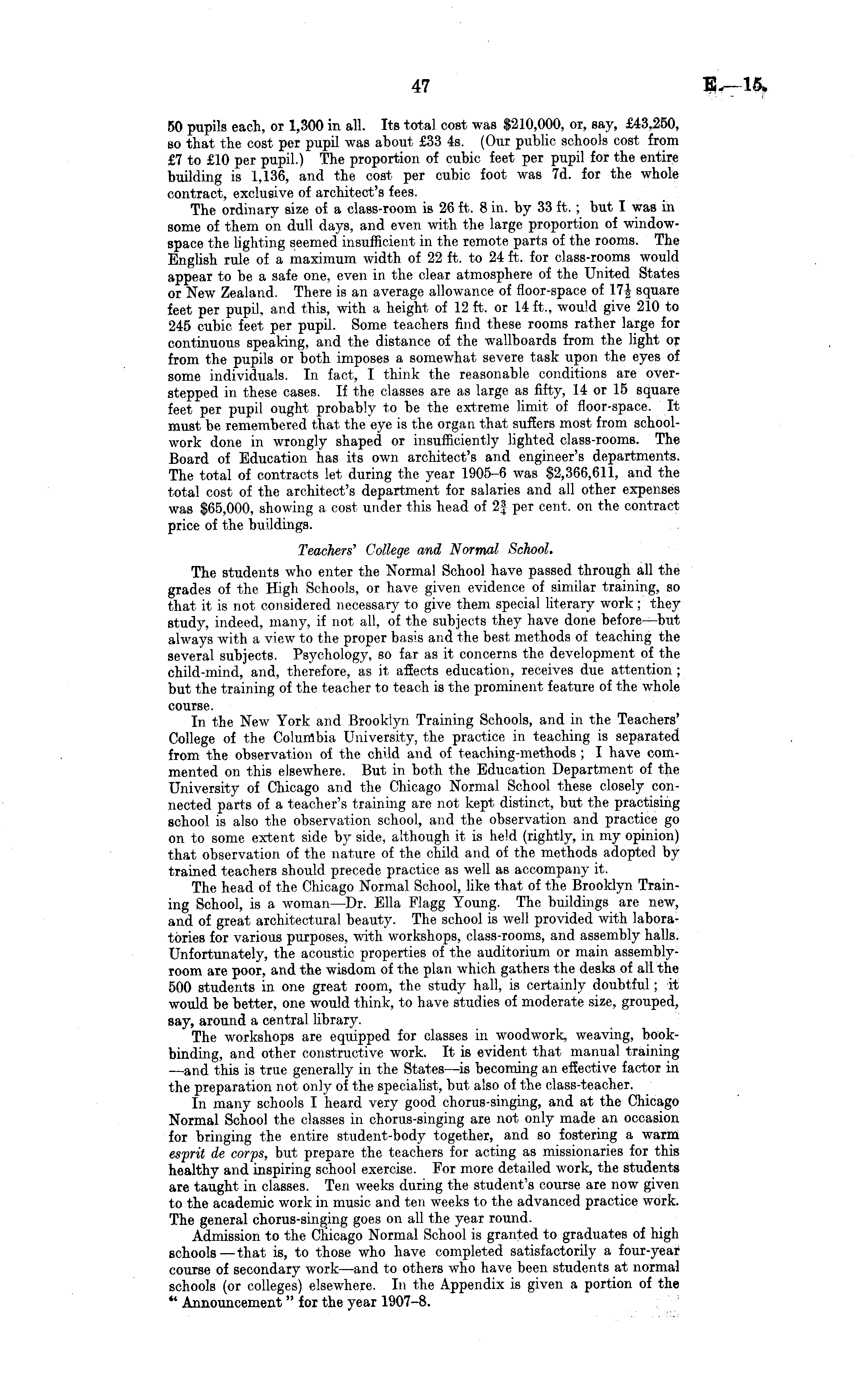 50 pupils each, or 1,300 in all. Its total cost was $210,000, or, say, £43,250, so that the cost per pupil was about £33 4s. (Our public schools cost from £7 to £10 per pupil.) The proportion of cubic feet per pupil for the entire building is 1,136, and the cost per cubic foot was 7d. for the whole contract, exclusive of architect's fees. The ordinary size of a class-room is 26 ft. 8 in. by 33 ft. ; but I was in some of them on dull days, and even with the large proportion of windowspace the lighting seemed insufficient in the remote parts of the rooms. The English rule of a maximum width of 22 ft. to 24 ft. for class-rooms would appear to be a safe one, even in the clear atmosphere of the United States or New Zealand. There is an average allowance of floor-space of 17%J square feet per pupil, and this, with a height of 12 ft. or 14 ft., would give 210 to 245 cubic feet per pupil. Some teachers find these rooms rather large for continuous speaking, and the distance of the wallboards from the light or from the pupils or both imposes a somewhat severe task upon the eyes of some individuals. In fact, I think the reasonable conditions are overstepped in these cases. If the classes are as large as fifty, 14 or 15 square feet per pupil ought probably to be the extreme limit of floor-space. It must be remembered that the eye is the organ that suffers most from schoolwork done in wrongly shaped or insufficiently lighted class-rooms. The Board of Education has its own architect's and engineer's departments. The total of contracts let during the year 1905-6 was $2,366,611, and the total cost of the architect's department for salaries and all other expenses was $65,000, showing a cost under this head of 2| per cent, on the contract price of the buildings. Teachers' 1 College and Normal School. The students who enter the Normal School have passed through all the grades of the High Schools, or have given evidence of similar training, so that it is not considered necessary to give them special literary work ; they study, indeed, many, if not all, of the subjects they have done before —but always with a view to the proper basis and the best methods of teaching the several subjects. Psychology, so far as it concerns the development of the child-mind, and, therefore, as it affects education, receives due attention ; but the training of the teacher to teach is the prominent feature of the whole course. In the New York and Brooklyn Training Schools, and in the Teachers' College of the Columbia University, the practice in teaching is separated from the observation of the child and of teaching-methods ; I have commented on this elsewhere. But in both the Education Department of the University of Chicago and the Chicago Normal School these closely connected parts of a teacher's training are not kept distinct, but the practising school is also the observation school, and the observation and practice go on to some extent side by side, although it is held (rightly, in my opinion) that observation of the nature of the child and of the methods adopted by trained teachers should precede practice as well as accompany it. The head of the Chicago Normal School, like that of the Brooklyn Training School, is a woman —Dr. Ella Flagg Young. The buildings are new, and of great architectural beauty. The school is well provided with laboratories for various purposes, with workshops, class-rooms, and assembly halls. Unfortunately, the acoustic properties of the auditorium or main assemblyroom are poor, and the wisdom of the plan which gathers the desks of all the 500 students in one great room, the study hall, is certainly doubtful ; it would be better, one would think, to have studies of moderate size, grouped, say, around a central library. The workshops are equipped for classes in woodwork, weaving, bookbinding, and other constructive work. It is evident that manual training —and this is true generally in the States —is becoming an effective factor in the preparation not only of the specialist, but also of the class-teacher. In many schools I heard very good chorus-singing, and at the Chicago Normal School the classes in chorus-singing are not only made an occasion for bringing the entire student-body together, and so fostering a warm esprit de corps, but prepare the teachers for acting as missionaries for this healthy and inspiring school exercise. For more detailed work, the students are taught in classes. Ten weeks during the student's course are now given to the academic work in music and ten weeks to the advanced practice work. The general chorus-singing goes on all the year round. Admission to the Chicago Normal School is granted to graduates of high schools —that is, to those who have completed satisfactorily a four-year course of secondary work —and to others who have been students at normal schools (or colleges) elsewhere. In the Appendix is given a portion of the " Announcement " for the year 1907-8.