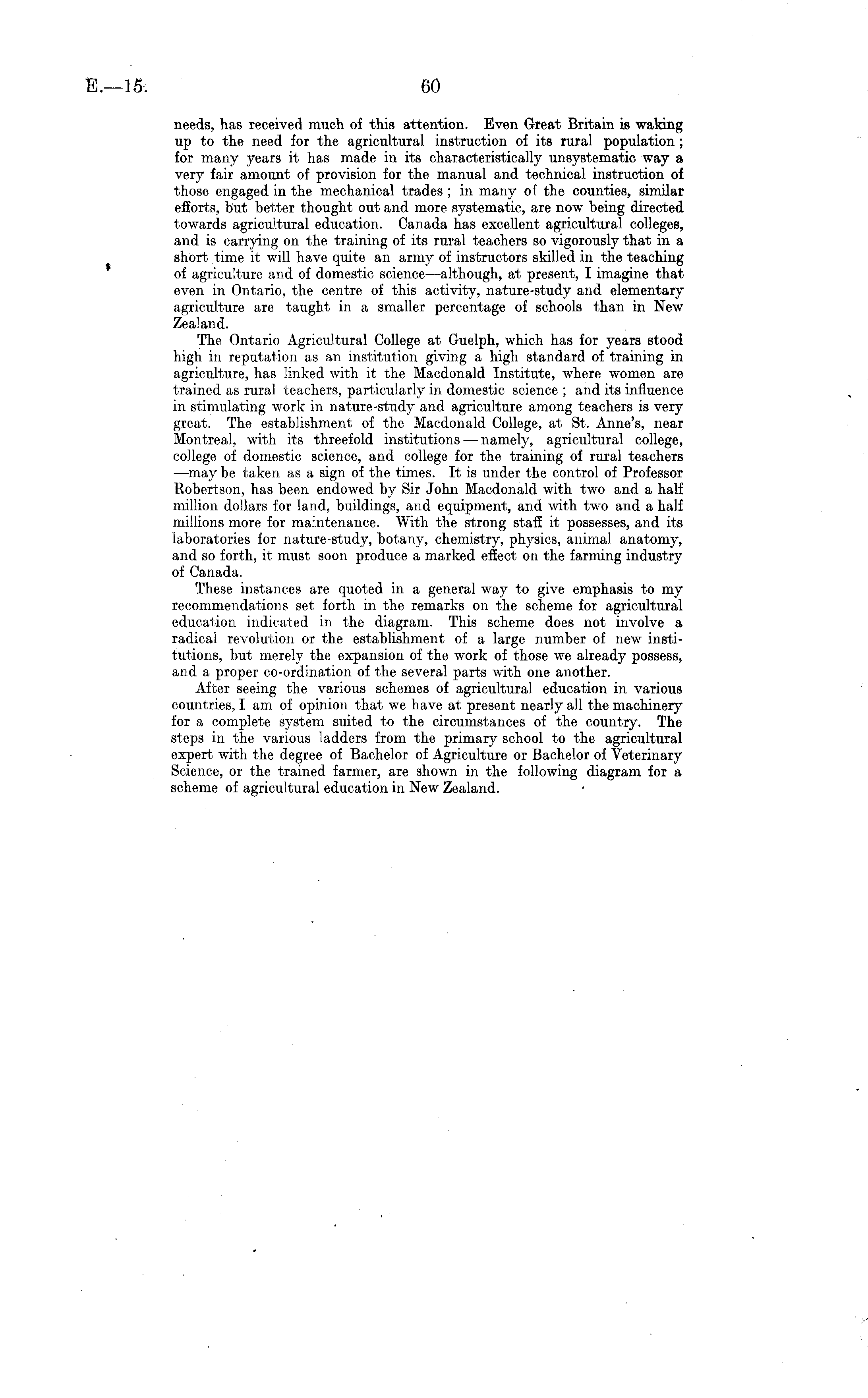 needs, has received much of this attention. Even Great Britain is waking up to the need for the agricultural instruction of its rural population ; for many years it has made in its characteristically unsystematic way a very fair amount of provision for the manual and technical instruction of those engaged in the mechanical trades ; in many of the counties, similar efforts, but better thought out and more systematic, are now being directed towards agricultural education. Canada has excellent agricultural colleges, and is carrying on the training of its rural teachers so vigorously that in a short time it will have quite an army of instructors skilled in the teaching of agriculture and of domestic science—although, at present, I imagine that even in Ontario, the centre of this activity, nature-study and elementary agriculture are taught in a smaller percentage of schools than in New Zealand. The Ontario Agricultural College at Guelph, which has for years stood high in reputation as an institution giving a high standard of training in agriculture, has linked with it the Macdonald Institute, where women are trained as rural teachers, particularly in domestic science ; and its influence in stimulating work in nature-study and agriculture among teachers is very great. The establishment of the Macdonald College, at St. Anne's, near Montreal, with its threefold institutions — namely, agricultural college, college of domestic science, and college for the training of rural teachers —may be taken as a sign of the times. It is under the control of Professor Robertson, has been endowed by Sir John Macdonald with two and a half million dollars for land, buildings, and equipment, and with two and a half millions more for maintenance. With the strong staff it possesses, and its laboratories for nature-study, botany, chemistry, physics, animal anatomy, and so forth, it must soon produce a marked effect on the farming industry of Canada. These instances are quoted in a general way to give emphasis to my recommendations set forth in the remarks on the scheme for agricultural education indicated in the diagram. This scheme does not involve a radical revolution or the establishment of a large number of new institutions, but merely the expansion of the work of those we already possess, and a proper co-ordination of the several parts with one another. After seeing the various schemes of agricultural education in various countries, I am of opinion that we have at present nearly all the machinery for a complete system suited to the circumstances of the country. The steps in the various ladders from the primary school to the agricultural expert with the degree of Bachelor of Agriculture or Bachelor of Veterinary Science, or the trained farmer, are shown in the following diagram for a scheme of agricultural education in New Zealand.