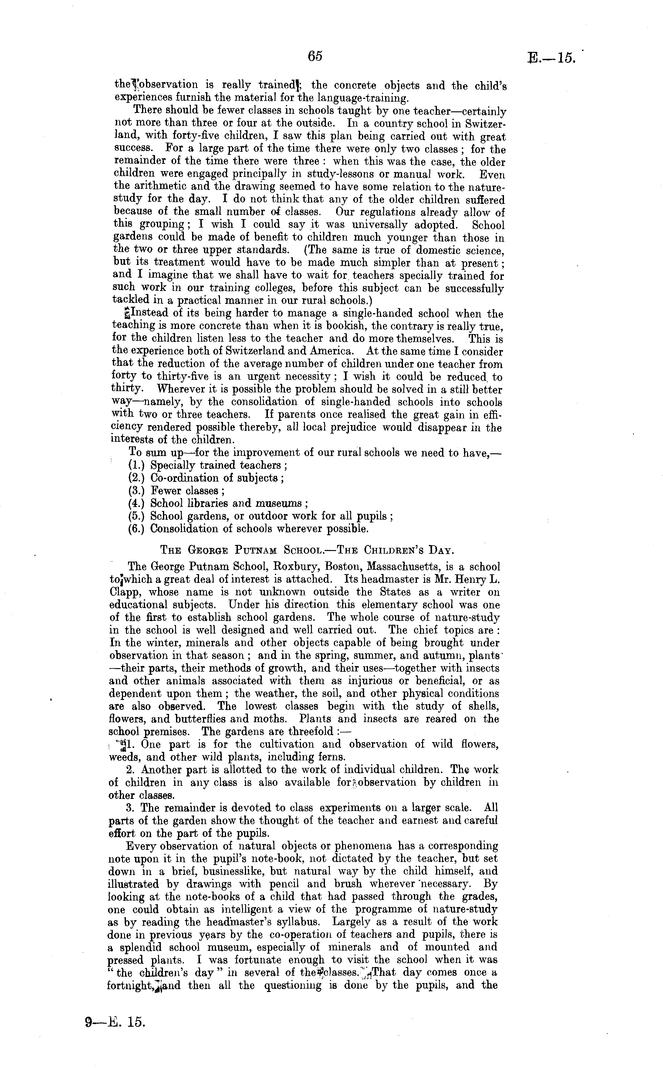 theTobservation is really trained}; the concrete objects and the child's experiences furnish the material for the language-training. There should be fewer classes in schools taught by one teacher —certainly not more than three or four at the outside. In a country school in Switzerland, with forty-five children, I saw this plan being carried out with great success. For a large part of the time there were only two classes ; for the remainder of the time there were three : when this was the case, the older children were engaged principally in study-lessons or manual work. Even the arithmetic and the drawing seemed to have some relation to the naturestudy for the day. I do not think that any of the older children suffered because of the small number of classes. Our regulations already allow of this grouping ; I wish I could say it was universally adopted. School gardens could be made of benefit to children much younger than those in the two or three upper standards. (The same is true of domestic science, but its treatment would have to be made much simpler than at present; and I imagine that we shall have to wait for teachers specially trained for such work in our training colleges, before this subject can be successfully tackled in a practical manner in our rural schools.) of its being harder to manage a single-handed school when the teaching is more concrete than when it is bookish, the contrary is really true, for the children listen less to the teacher and do more themselves. This is the experience both of Switzerland and America. At the same time I consider that the reduction of the average number of children under one teacher from forty to thirty-five is an urgent necessity; I wish it could be reduced, to thirty. Wherever it is possible the problem should be solved in a still better way—namely, by the consolidation of single-handed schools into schools with two or three teachers. If parents once realised the great gain in efficiency rendered possible thereby, all local prejudice would disappear in the interests of the children. To sum up—for the improvement of our rural schools we need to have, — (1.) Specially trained teachers ; (2.) Co-ordination of subjects ; (3.) Fewer classes; (4.) School libraries and museums ; (5.) School gardens, or outdoor work for all pupils ; (6.) Consolidation of schools wherever possible. The George Putnam School. —The Children's Day. The George Putnam School, Roxbury, Boston, Massachusetts, is a school tojwhich a great deal of interest is attached. Its headmaster is Mr. Henry L. Clapp, whose name is not unknown outside the States as a writer on educational subjects. Under his direction this elementary school was one of the first to establish school gardens. The whole course of nature-study in the school is well designed and well carried out. The chief topics are : In the winter, minerals and other objects capable of being brought under observation in that season ; and in the spring, summer, and autumn, plants' —their parts, their methods of growth, and their uses —together with insects and other animals associated with them as injurious or beneficial, or as dependent upon them; the weather, the soil, and other physical conditions are also observed. The lowest classes begin with the study of shells, flowers, and butterflies and moths. Plants and insects are reared on the school premises. The gardens are threefold : — *11. One part is for the cultivation and observation of wild flowers, weeds, and other wild plants, including ferns. 2. Another part is allotted to the work of individual children. The work of children in any class is also available for?observation by children in other classes. 3. The remainder is devoted to class experiments on a larger scale. All parts of the garden show the thought of the teacher and earnest and careful effort on the part of the pupils. Every observation of natural objects or phenomena has a corresponding note upon it in the pupil's note-book, not dictated by the teacher, but set down in a brief, businesslike, but natural way by the child himself, and illustrated by drawings with pencil and brush wherever 'necessary. By looking at the note-books of a child that had passed through the grades, one could obtain as intelligent a view of the programme of nature-study as by reading the headmaster's syllabus. Largely as a result of the work done in previous years by the co-operation of teachers and pupils, there is a splendid school museum, especially of minerals and of mounted and pressed plants. I was fortunate enough to visit the school when it was "the children's day" in several of ~»That day comes once a then all the questioning is done by the pupils, and the