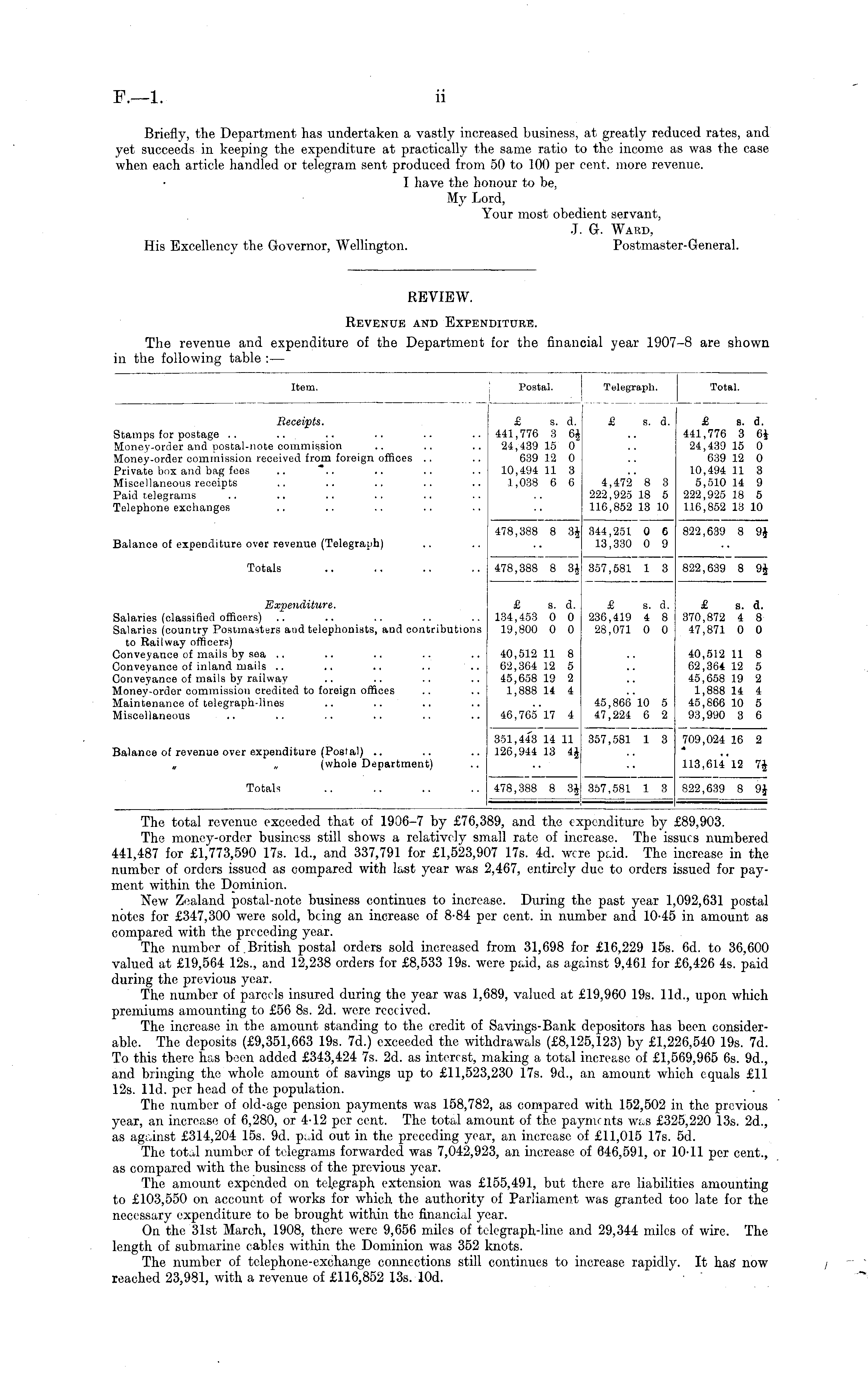 Briefly, the Department has undertaken a vastly increased business, at greatly reduced rates, and yet succeeds in keeping the expenditure at practically the same ratio to the income as was the case when each article handled or telegram sent produced from 50 to 100 per cent, more revenue. I have the honour to be, My Lord, Your most obedient servant, .). G. Ward, His Excellency the Governor, Wellington. Postmaster-General.