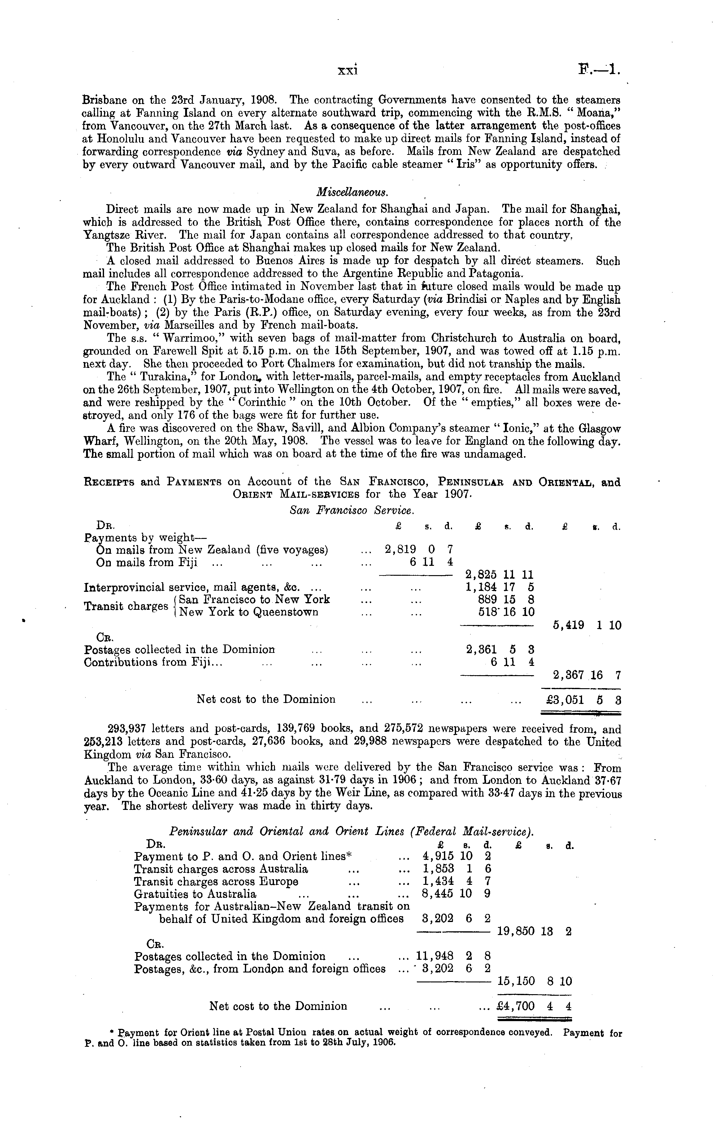 Brisbane on the 23rd January, 1908. The contracting Governments have consented to the steamers calling at Fanning Island on every alternate southward trip, commencing with the R.M.S. " Moana," from Vancouver, on the 27th March last. As a consequence of the latter arrangement the post-offices at Honolulu and Vancouver have been requested to make up direct mails for Fanning Island, instead of forwarding correspondence via Sydney and Suva, as before. Mails from New Zealand are despatched by every outward Vancouver mail, and by the Pacific cable steamer " Iris" as opportunity offers. Miscellaneous. Direct mails are now made up in New Zealand for Shanghai and Japan. The mail for Shanghai, which is addressed to the British Post Office there, contains correspondence for places north of the Yangtsze River. The mail for Japan contains all correspondence addressed to that country, The British Post Office at Shanghai makes up closed mails for New Zealand. A closed mail addressed to Buenos Aires is made up for despatch by all direct steamers. Such mail includes all correspondence addressed to the Argentine Republic and Patagonia. The French Post Office intimated in November last that in future closed mails would be made up for Auckland : (1) By the Paris-to-Modane office, every Saturday (via Brindisi or Naples and by English mail-boats); (2) by the Paris (R.P.) office, on Saturday evening, every four weeks, as from the 23rd November, via Marseilles and by French mail-boats. The s.s. " Warrimoo," with seven bags of mail-matter from Christchurch to Australia on board, grounded on Farewell Spit at 5.15 p.m. on the 15th September, 1907, and was towed off at 1.15 p.m. next day. She then proceeded to Port Chalmers for examination, but did not tranship the mails. The " Turakina," for London, with letter-mails, parcel-mails, and empty receptacles from Auckland on the 26th September, 1907, put into Wellington on the 4th October, 1907, on fire. All mails were saved, and were reshipped by the " Corinthic "on the 10th October. Of the " empties," all boxes were destroyed, and only 176 of the bags were fit for further use. A fire was discovered on the Shaw, Savill, and Albion Company's steamer " lonic," at the Glasgow Wharf, Wellington, on the 20th May, 1908. The vessel was to leave for England on the following day. The small portion of mail which was on board at the time of the fire was undamaged. Receipts and Payments on Account of the San Francisco, Peninsular and Oriental, and Orient Mail-services for the Year 1907San Francisco Service. Dr. £ s. d. £ s. d. £ s. d. Payments by weight— On mails from New Zealand (five voyages) ... 2,819 0 7 On mails from Fiji ... ... ... ... 611 4 2,825 11 11 Interprovincial service, mail agents, &c. ... ... ... 1,184 17 5 m .. , (San Francisco to New York ... ... 889 15 8 Transit charges ] New York tQ Queenstown 518 - 16 10 5,419 1 10 Cr. Postages collected in the Dominion ... ... ... 2,361 5 3 Contributions from Fiji... ... ... ... ... 6 11 4 2,367 16 7 Net cost to the Dominion ... ... ... ... £3,051 5 3 293,937 letters and post-cards, 139,769 books, and 275,572 newspapers were received from, and 253,213 letters and post-cards, 27,636 books, and 29,988 newspapers were despatched to the United Kingdom via San Francisco. The average time within which mails were delivered by the San Francisco service was : From Auckland to London, 33-60 days, as against 31-79 days in 1906 ; and from London to Auckland 37-67 days by the Oceanic Line and 41-25 days by the Weir Line, as compared with 33-47 days in the previous year. The shortest delivery was made in thirty days. Peninsular and Oriental and Orient Lines (Federal Mail-service). Dr. £ b. d. £ a. d. Payment to P. and O. and Orient lines* ... 4,915 10 2 Transit charges across Australia ... ... 1,853 1 6 Transit charges across Europe ... ... 1,434 4 7 Gratuities to Australia ... ... ... 8,445 10 9 Payments for Australian-New Zealand transit on behalf of United Kingdom and foreign offices 3,202 6 2 19,850 13 2 Ce. Postages collected in the Dominion ... ... 11,948 2 8 Postages, &c, from London and foreign offices ... ' 3,202 6 2 15,150 8 10 Net cost to the Dominion ... ... ...£4,700 4 4 * Payment for Orient line at Postal Union rates on actual weight of correspondence conveyed. Payment for P. and O. line based on statistics taken from Ist to 28th July, 1906,