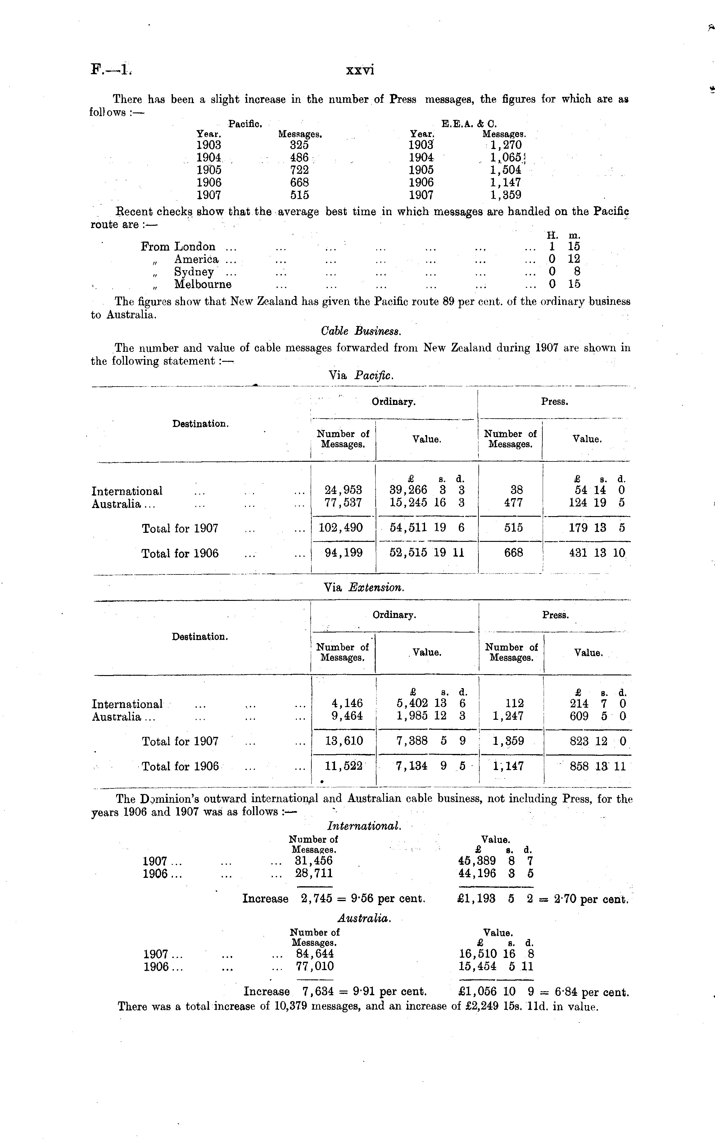 There has been a slight increase in the number of Press messages, the figures for which are as foil ows :— Pacific. E.E.A. & C. Year. Messages. Year. Messages. 1903 325 1903 1,270 1904 486 1904 1,065; 1905 722 1905 1,504 1906 668 1906 1,147 1907 515 1907 1,359 Eecent checks show that the average best time in which messages are handled on the Pacific route are :— H. m. From London ... ... ... ... ... ... ... 1 15 America ... ... ... ... ... ... ... 0 12 „ Sydney ... ... ... ... ... ... ... 0 8 Melbourne ... ... ... ... ... ... 0 15 The figures show that New Zealand has given the Pacific route 89 per cent, of the ordinary business to Australia. Cable Business. The number and value of cable messages forwarded from New Zealand during 1907 are shown in the following statement : —