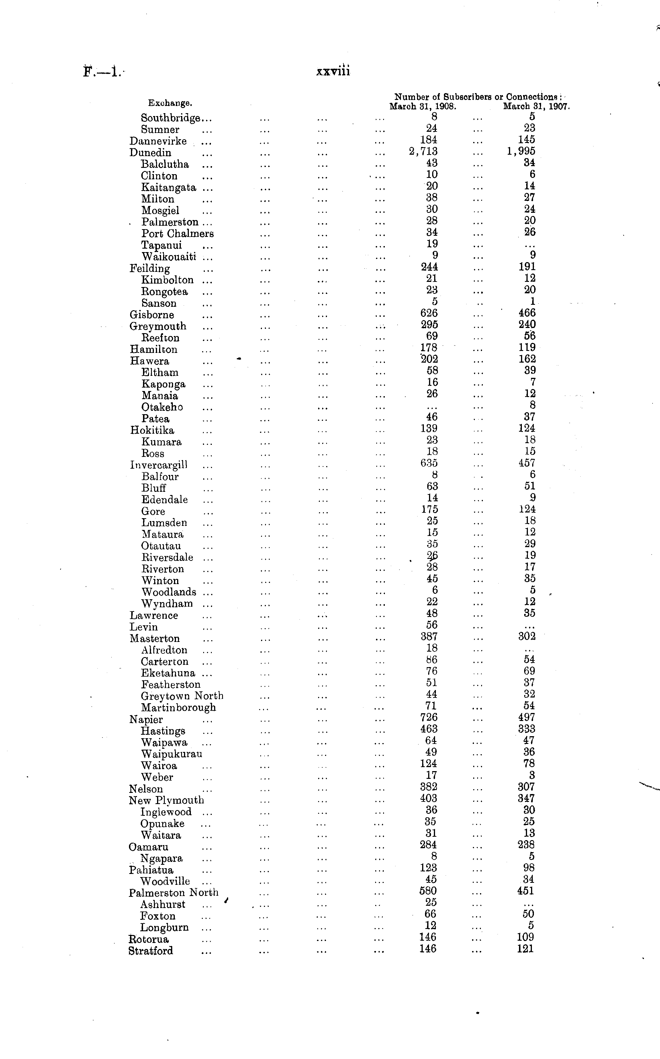 Number of Subscribers or Connections ; Exchange. March 31, 1908. March 31, 1907 Southbridge... ... ... ••• 8 ... 5 Sumner ... ... ... ... 24 ... 23 Dannevirke ... ... ... ... 184 ... 145 Dunedin ... ... ... ... 2,713 ... 1,995 Balclutha ... ... ... ... 43 ... 34 Clinton ... ... ... .... 10 ... 6 Kaitangata ... ... •■■ ••• 20 ... 14 Milton ... ... ... ... 38 ... 27 Mosgiel ... ... ... ... 30 ... 24 ■ Palmerston... ... ... ... 28 ... 20 Port Chalmers ... ... ... 34 ... 26 Tapanui ... ... ... ... 19 Waikouaiti ... ... ... ... 9 ... 9 Feilding ... ... ... ... 244 ... 191 Kimbolton ... ... ... ... 21 ... 12 Bongotea ... ... ... ... 23 ... 20 Sanson ... ... •■■ ••• 5 .. 1 Gisborne ... ... ... ••• 626 ... 466 Greymouth ... ... ... ... 295 ... 240 Eeefton ... ... ••• ••• 69 ... 56 Hamilton ... ... ... ... 178 ... 119 Hawera ... * ... ... ■•• 202 ... 162 Eltham ... ... ... ... 58 ... 39 Kaponga ... ... ... ••• 16 ... 7 Manaia ... ... ... ■•• 26 ... 12 Otakeho ... ... ... ••• ••• •■• 8 Patea ... ... ... ■•• 46 ... 37 Hokitika ... ... ... ... 139 ... 124 Kumara ... ... ••■ •■■ 23 ... 18 Boss ... ... ... ••• 18 ... 15 Invercargill ... ... ... ••• 635 ... 457 Balfour ... ... ■■■ •■• 8 . . 6 Bluff ... ... ■•■ •■■ 63 ... 51 Edendale ... ... ... ... 14 ... 9 Gore ... ... ... ... 175 ... 124 Lumsden ... ... ... ... 25 ... 18 Mataura ... ... ... ■•• 15 ... 12 Otautau ... ... ... •• 35 ... 29 Biversdale ... ... ■■ • • ■ ■ 36 ... 19 Riverton ... ... •■■ ■•■ .28 ... 17 Winton ... ... ... ■•■ 45 ... 35 Woodlands ... ... ... ••• 6 ... 5 Wyndham ... ... ... ... 22 ... 12 Lawrence ... ... •■• ••• 48 ... 35 Levin ... ... • • • • • • 56 Masterton ... ... ... ... 387 ... 302 Alfredton ... ... ■■• ■•■ 18 Carterton ... ... ... ■■■ 86 ... 54 Eketahuna ... ... ... ••■ 76 69 Featherston ... ... ••• 51 ... 37 Greytown North ... ... ... 44 ... 32 Martinborough ... ... ••• 71 ... 54 Napier ... ... ... ••• 726 ... 497 Hastings ... ... ••■ ••• 463 ... 333 Waipawa ... ... ... ••• 64 ... 47 Waipukurau ... •■• ... 49 ... 36 Wairoa ... ... . ••• 124 ... 78 Weber ... ... ... ••• 17 ... 3 Nelson ... ... ... ■•• 382 ... 307 New Plymouth ... ... ... 403 ... 347 Inglewood ... ... ... ••• 36 ... 30 Opunake ... ... • • • • • • 35 ... 25 Waitara ... ... •■• ••• 31 •■■ 13 Oamaru ... •■■ •■• ■•• 284 ... 238 Ngapara ... ... ■•• •••" 8 ... 5 Pahiatua ... ... ... ••• 123 ... 98 Woodville ... ... ... ■•■ 45 ... 34 Palmerston North ... ... ••• 580 ... 451 Ashhurst ... .... ••• •• 25 Foxton ... ... •■• ••• 66 ... 50 Longburn ... ... ■•• ••■ 12 ... 5 Eotorua ... ... ... ... 146 ... 109 Stratford ... ... ••• ••• 146 ... 121