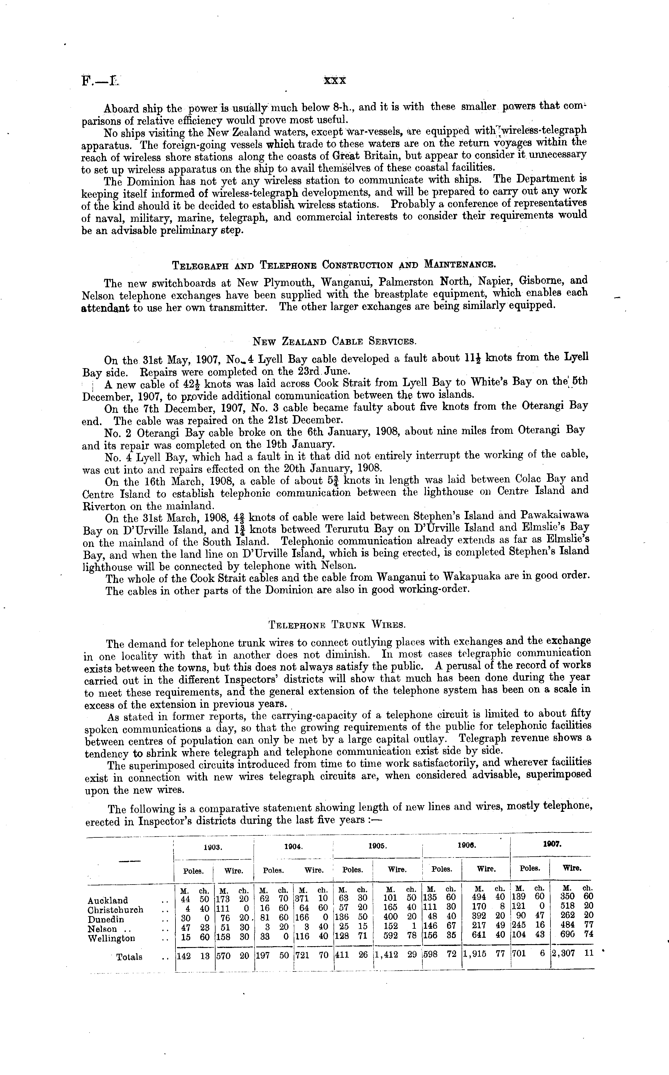 Aboard ship the power is usually much below 8-h., and it is with these smaller powers that com 1 parisons of relative efficiency would prove most useful. No ships visiting the New Zealand waters, except war-vessels, are equipped with'wireless-telegraph apparatus. The foreign-going vessels which trade to these waters are on the return voyages within the reach of wireless shore stations along the coasts of Great Britain, but appear to consider it unnecessary to set up wireless apparatus on the ship to avail themselves of these coastal facilities. The Dominion has not yet any wireless station to communicate with ships. The Department is keeping itself informed of wireless-telegraph developments, and will be prepared to carry out any work of the kind should it be decided to establish wireless stations. Probably a conference of representatives of naval, military, marine, telegraph, and commercial interests to consider their requirements would be an advisable preliminary step. Telegraph and Telephone Construction and Maintenance. The new switchboards at New Plymouth, Wanganui, Palmerston North, Napier, Gisborne, and Nelson telephone exchanges have been supplied with the breastplate equipment, which enables each attendant to use her own transmitter. The other larger exchanges are being similarly equipped. New Zealand Cable Services. On the 31st May, 1907, No„4 Lyell Bay cable developed a fault about 11£ knots from the L y ell Bay side. Bepairs were completed on the 23rd June. A new cable of 42J knots was laid across Cook Strait from Lyell Bay to White's Bay on the sth December, 1907, to provide additional communication between the two islands. On the 7th December, 1907, No. 3 cable became faulty about five knots from the Oterangi Bay end. The cable was repaired on the 21st December. No. 2 Oterangi Bay cable broke on the 6th January, 1908, about nine miles from Oterangi Bay and its repair was completed on the 19th January. No. 4 Lyell Bay, which had a fault in it that did not entirely interrupt the working of the cable, was cut into and repairs effected on the 20th January, 1908. On the 16th March, 1908, a cable of about 5| knots in length was laid between Colac Bay and Centre Island to establish telephonic communication between the lighthouse on Centre Island and Biverton on the mainland. On the 31st March, 1908, 4f knots of cable were laid between Stephen's Island and Pawakaiwawa Bay on D'Urville Island, and lf knots bctweed Terurutu Bay on D'Urville Island and Elmslie's Bay on the mainland of the South Island. Telephonic communication already extends as far as Elmslie's Bay, and when the land line on D'Urville Island, which is being erected, is completed Stephen's Island lighthouse will be connected by telephone with Nelson. The whole of the Cook Strait cables and the cable from Wanganui to Wakapuaka are in good order. The cables in other parts of the Dominion are also in good working-order. Telephone Trunk Wires. The demand for telephone trunk wires to connect outlying places with exchanges and the exchange in one locality with that in another does not diminish. In most cases telegraphic communication exists between the towns, but this does not always satisfy the public, A perusal of the record of works carried out in the different Inspectors' districts will show that much has been done during the year to meet these requirements, and the general extension of the telephone system has been on a scale in excess of the extension in previous years. As stated in former reports, the carrying-capacity of a telephone circuit is limited to about fifty spoken communications a day, so that the growing requirements of the public for telephonic facilities between centres of population can only be met by a large capital outlay. Telegraph revenue shows a tendency to shrink where telegraph and telephone communication exist side by side. The superimposed circuits introduced from time to time work satisfactorily, and wherever facilities exist in connection with new wires telegraph circuits are, when considered advisable, superimposed upon the new wires. The following is a comparative statement showing length of new lines and wires, mostly telephone, erected in Inspector's districts during the last five years : —
