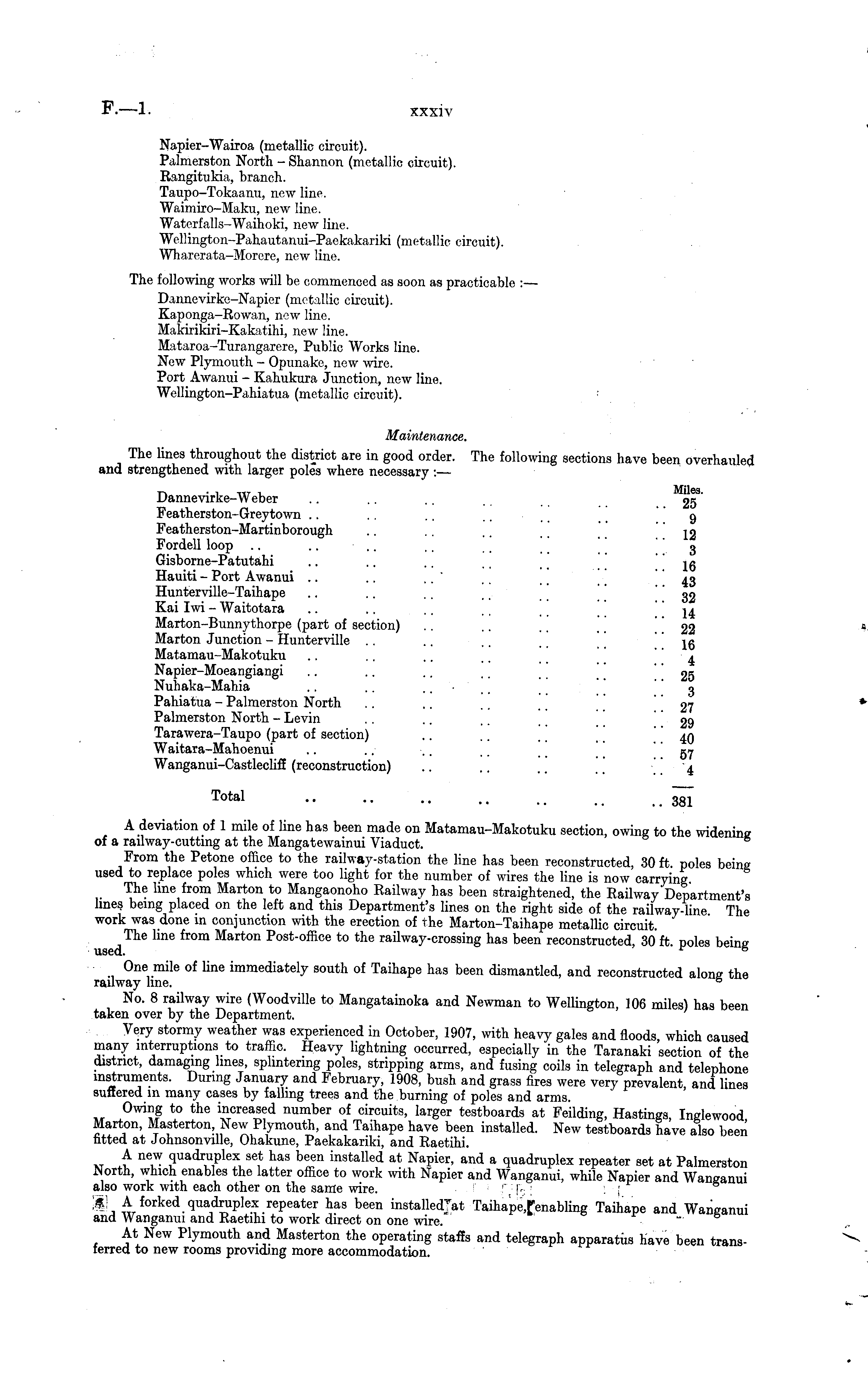 Napier-Wairoa (metallic circuit). Palmerston North - Shannon (metallic circuit). Eangitukia, branch. Taupo-Tokaanu, new line. Waimiro-Maku, new line. Waterfalls-Waihoki, new line. Wellington-Pahautanui-Paekakariki (metallic circuit). Wharerata-Morere, new line. The following works will be commenced as soon as practicable :— Dannevirke-Napicr (metallic circuit). Kaponga-Eowan, new line. Makirikiri-Kakatihi, new line. Mataroa-Turangarere, Public Works line. New Plymouth - Opunake, new wire. Port Awanui - Kahukura Junction, new line. Wellington-Pahiatua (metallic circuit). Maintenance. The lines throughout the district are in good order. The following sections have been overhauled and strengthened with larger poles where necessary :— Dannevirke-Weber .. .. .. 05 Featherston-Greytown .. .. .. .... 9 Featherston-Martinborough ...... 12 Fordell loop .. .... .. .. 3 Gisborne-Patutahi .. .. .. jg Hauiti - Port Awanui .. .. .... 43 Hunterville-Taihape .. .. .. ~ 32 Kai Iwi - Waitotara ...... 14 Marton-Bunnythorpe (part of section) .. .. .. 22 Marton Junction - Hunterville .. ~ .. 1 g Matamau-Makotuku .. .. .. a Napier-Moeangiangi .. .. ~ . 25 Nuhaka-Mahia .. .... 3 Pahiatua - Palmerston North .. .. .. 27 Palmerston North - Levin ...... 29 Tarawera-Taupo (part of section) .. .. .. 4Q Waitara-Mahoenui ........ 57 Wanganui-Castlecliff (reconstruction) .. .. .. 4 Total 381 A deviation of 1 mile of line has been made on Matamau-Makotuku section, owing to the widening of a railway-cutting at the Mangatewainui Viaduct. From the Petone office to the railway-station the line has been reconstructed, 30 ft. poles being used to replace poles which were too light for the number of wires the line is now carrying. The hne from Marton to Mangaonoho Eailway has been straightened, the Eailway Department's lines being placed on the left and this Department's lines on the right side of the railway-line The work was done in conjunction with the erection of the Marton-Taihape metallic circuit. ' The hne from Marton Post-office to the railway-crossing has been reconstructed, 30 ft. poles being used. r 6 One mile of line immediately south of Taihape has been dismantled, and reconstructed along the railway line. c No. 8 railway wire (Woodville to Mangatainoka and Newman to Wellington, 106 miles) has been taken over by the Department. Very stormy weather was experienced in October, 1907, with heavy gales and floods, which caused many interruptions to traffic. Heavy lightning occurred, especially in the Taranaki section of the district, damaging lines, splintering poles, stripping arms, and fusing coils in telegraph and telephone instruments. During January and February, 1908, bush and grass fires were very prevalent and lines suffered in many cases by falling trees and the burning of poles and arms. Owing to the increased numher of circuits, larger testboards at Feilding, Hastings, Inglewood Marton, Masterton, New Plymouth, and Taihape have been installed. New testboards have also been fitted at Johnsonville, Ohakune, Paekakariki, and Eaetihi. Xt £ n I W , ( l uadr l u P lex se * has been installed at Napier, and a quadruplex repeater set at Palmerston North, which enables the latter office to work with Napier and Wanganui, while Napier and Wanganui also work with each other on the same wire. H A forked quadruplex repeater has been installedjat Taihape and Wanganui and Wanganui and Eaetihi to work direct on one wire. "' At New Plymouth and Masterton the operating staffs and telegraph apparatiis have been transferred to new rooms providing more accommodation.